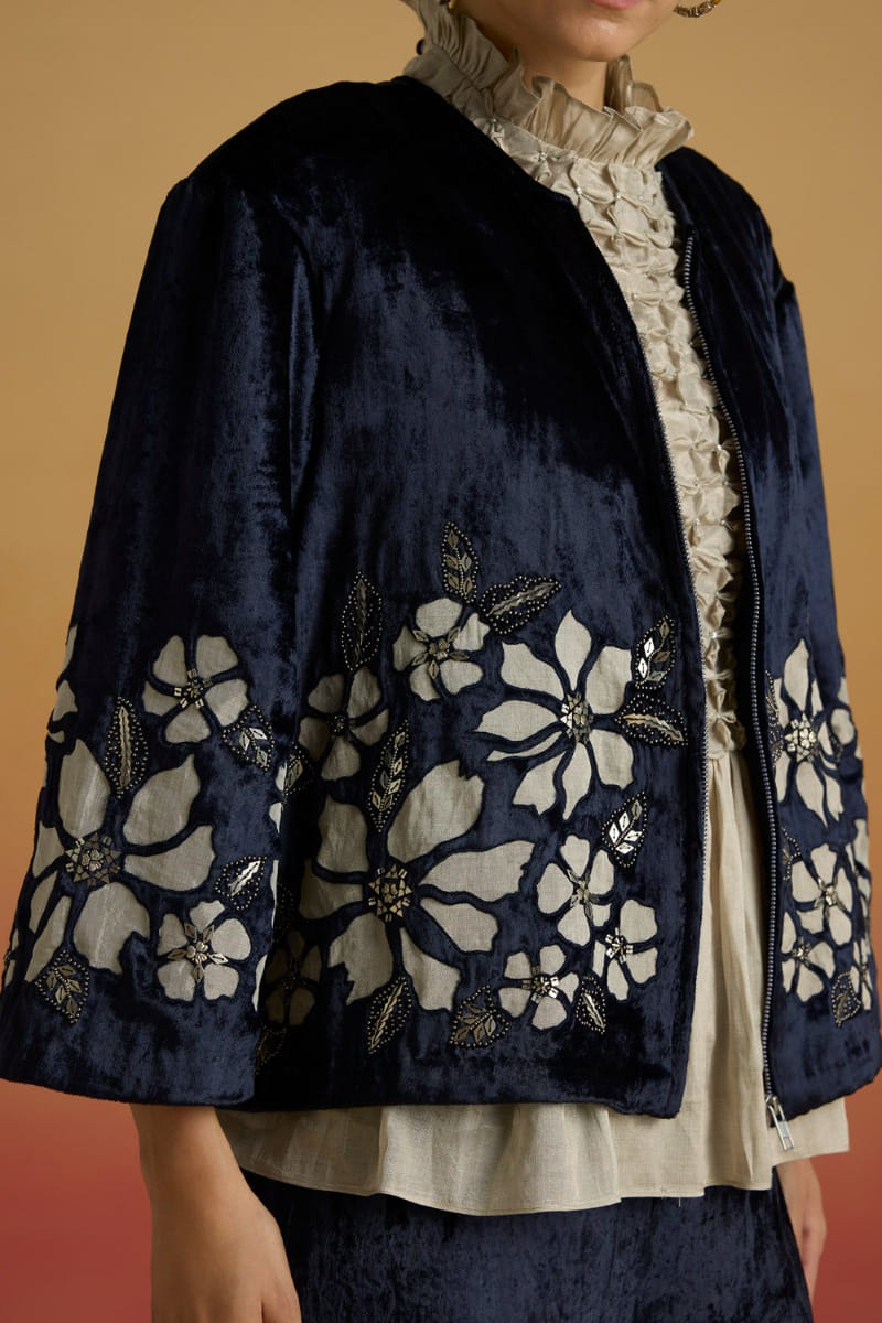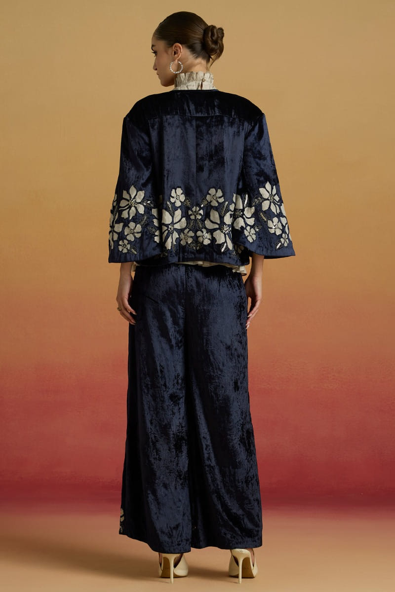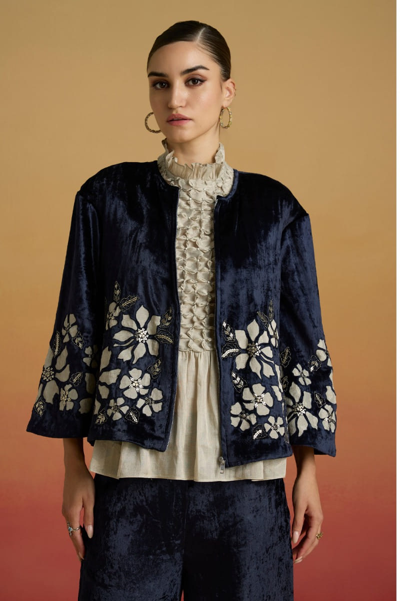 Chandrima designs this striking short jacket in silk velvet. It features contrast silver applique enhanced with bead detailing. Style it with flared velvet pants and statement earrings for cocktail evenings. The pants shown here are for styling purposes only.