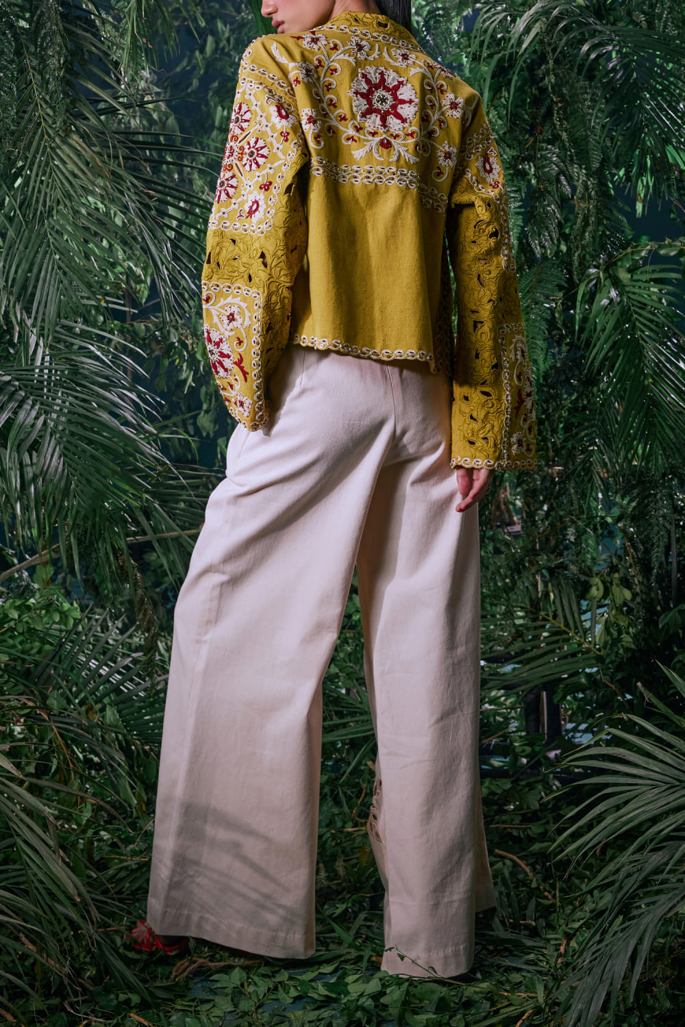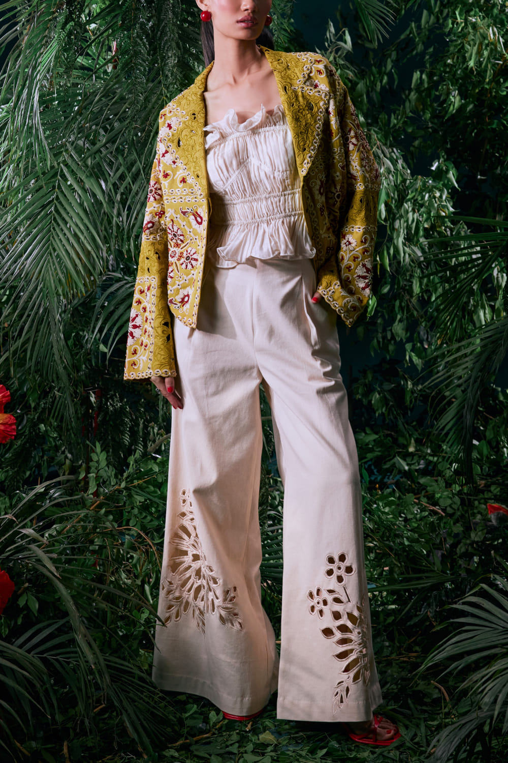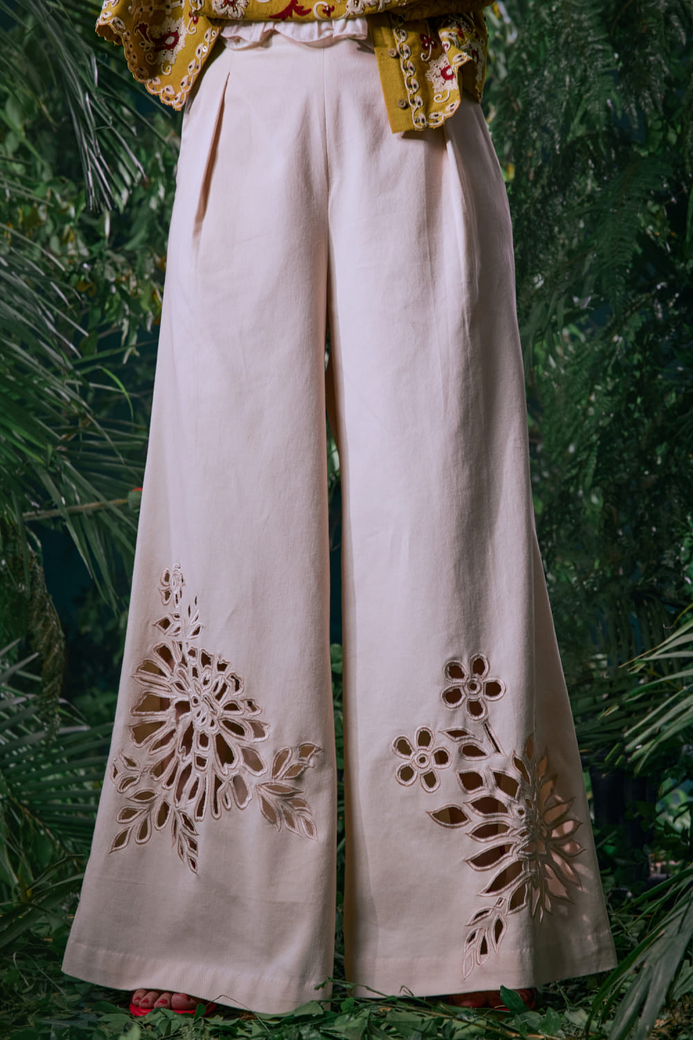 Chandrima designs this breezy pair of pants fabricated in cotton twill enriched with placement floral cutwork detailing and flared silhouette. Style the look with a tunic for the festivities. The jacket here is shown for styling purposes only.