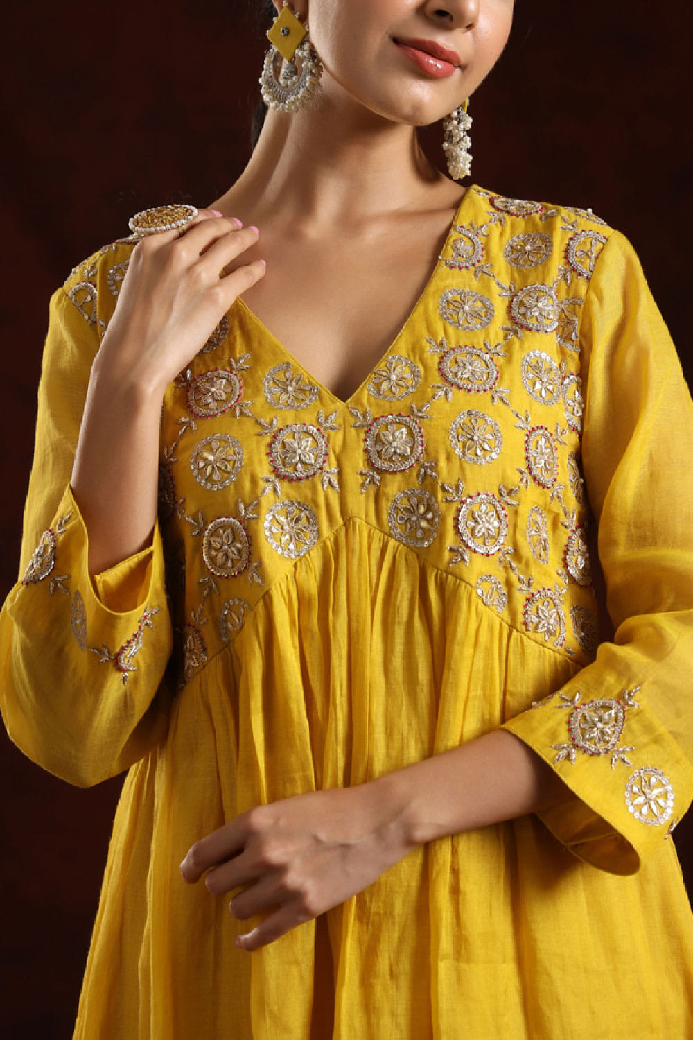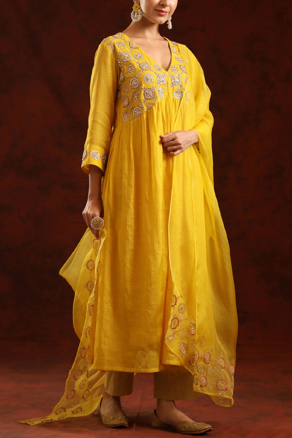 Charu Makkar designs this gorgeous kurta customised in chanderi tissue with thread, zari and sequin hand-embroidery detailing in intricate floral and circular patterns. It is paired with matching pants and a matching dupatta. Style the look with chandelier earrings and block heels for a traditional occasion.