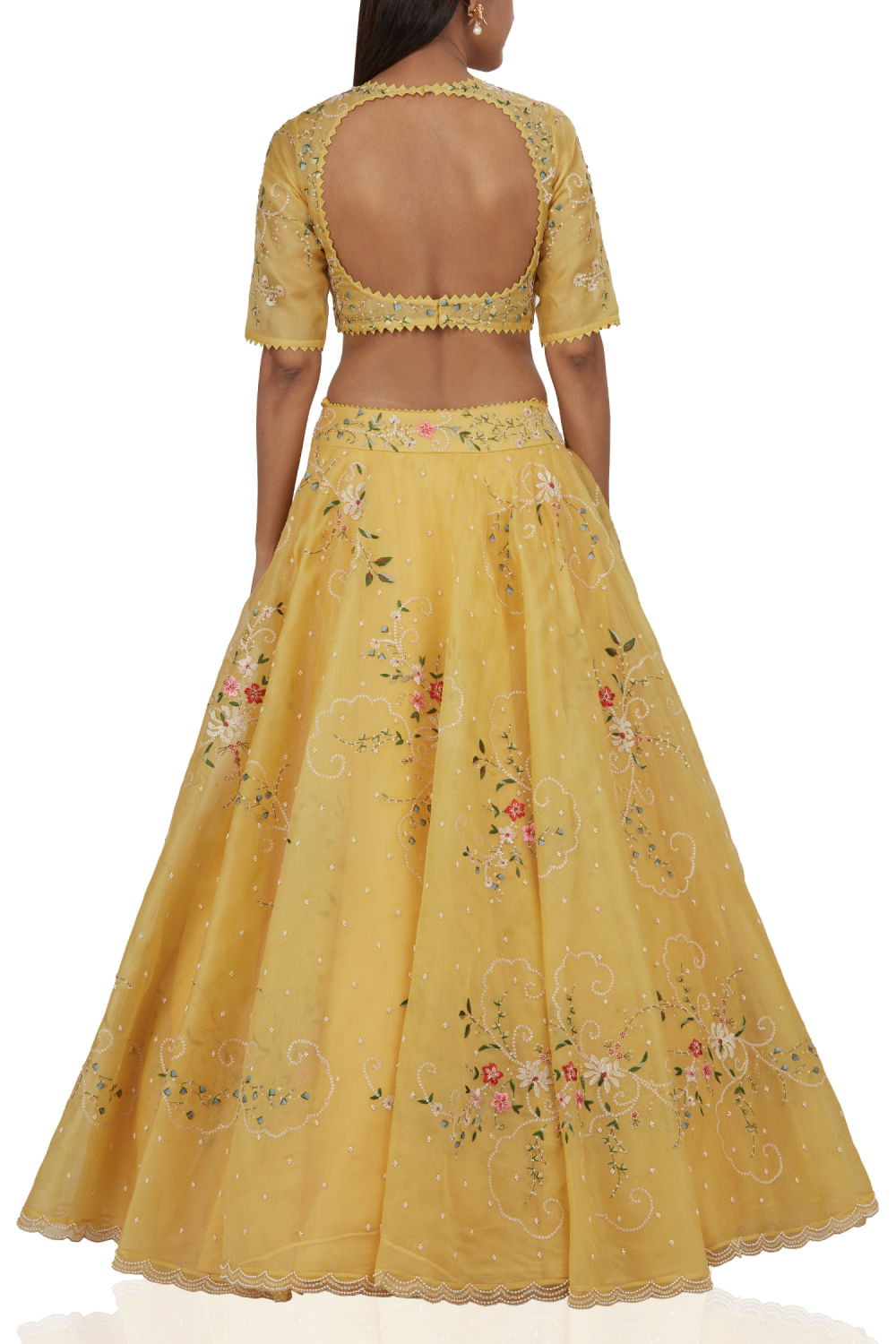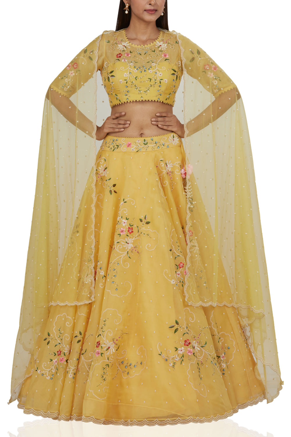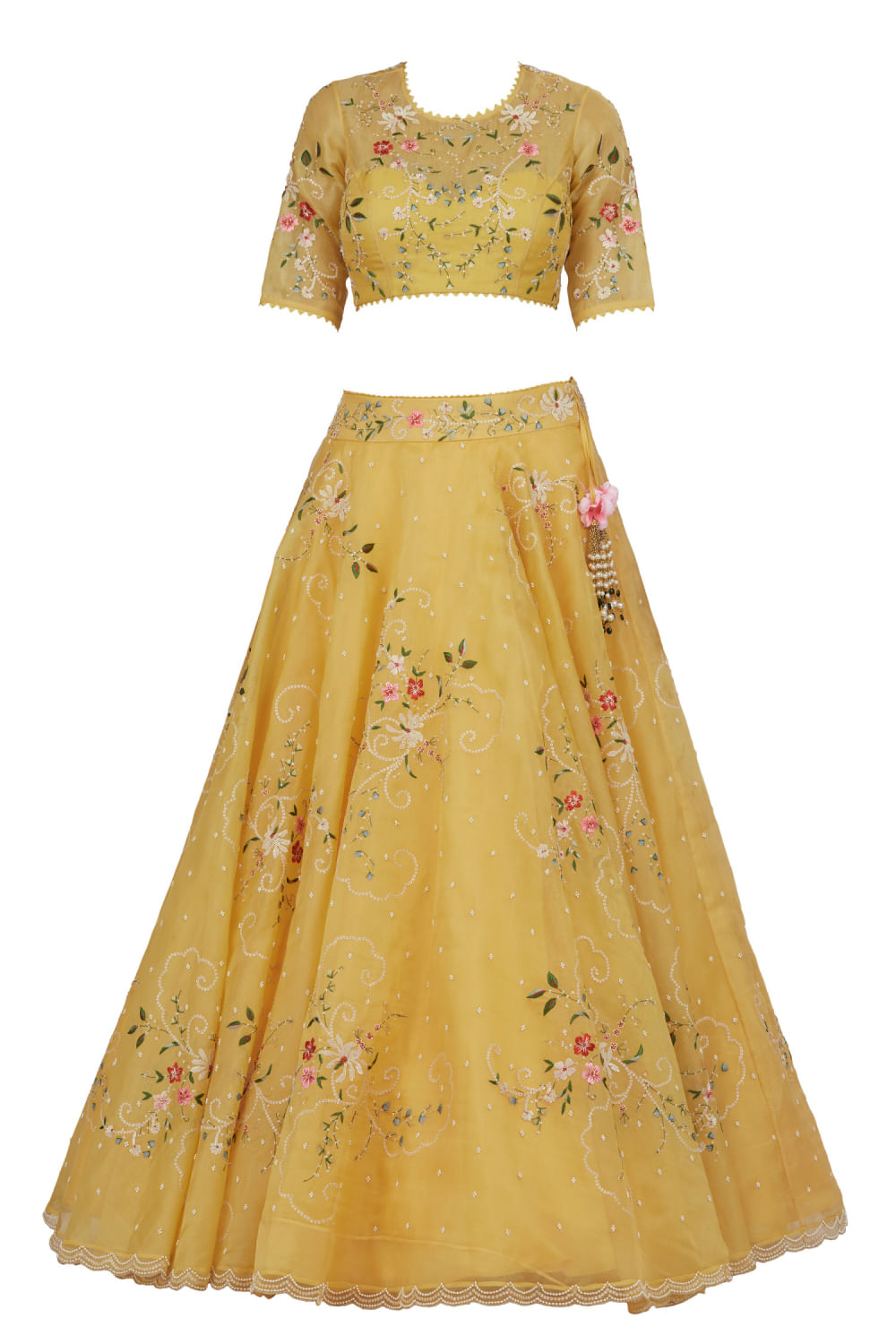 Anushree Reddy brings a yellow beauty to add a splash of freshness to this summer featuring a floral embroidered crop top paired with lehenga and dupatta. Style the look with kundan choker set and embellished juttis.