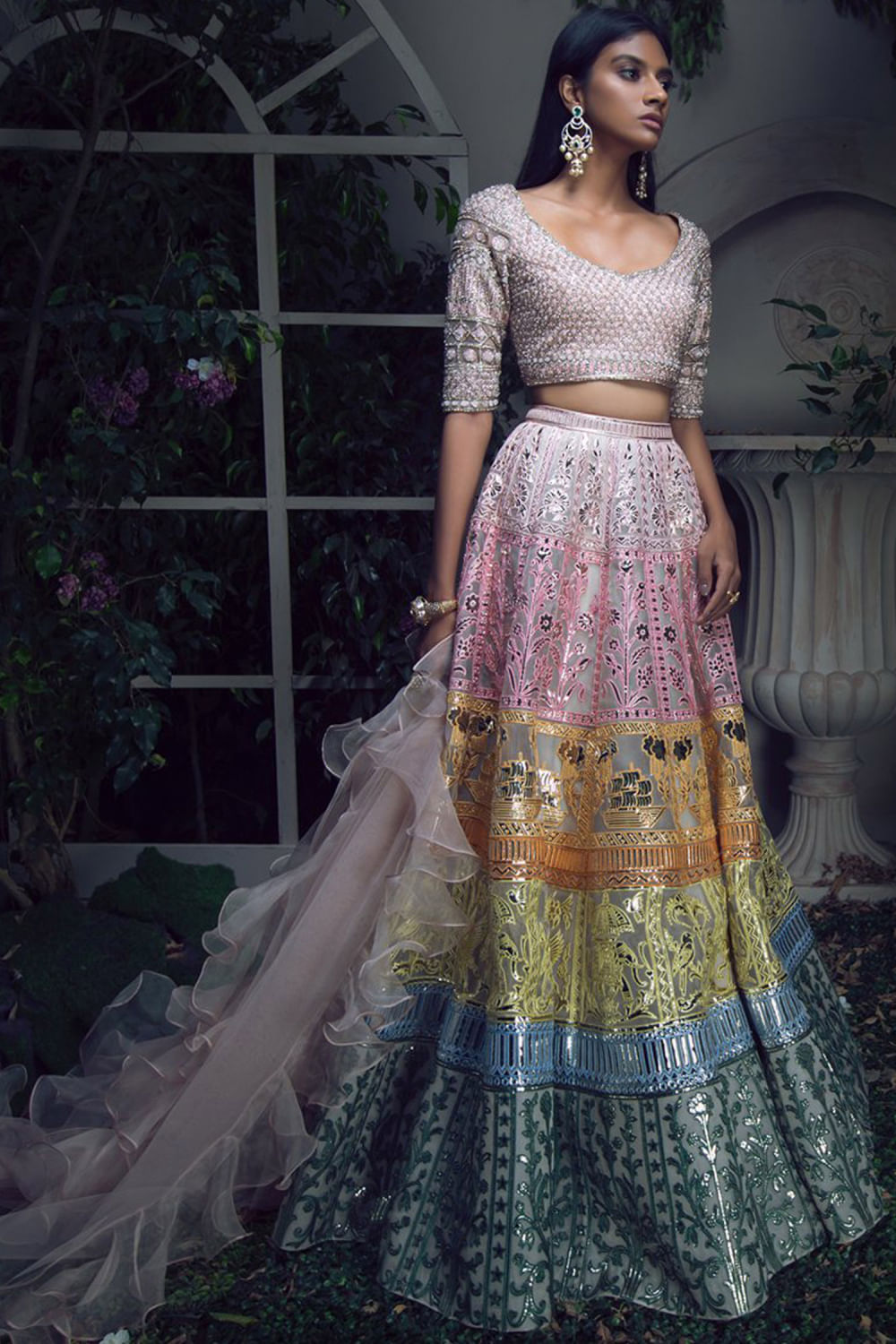 Falguni Shane Peacock make quite a statement with this multi-coloured lehenga with chrome applique work paired with an embroidered blouse and dupatta. Style it with silver strappy sandals and dazzling danglers.