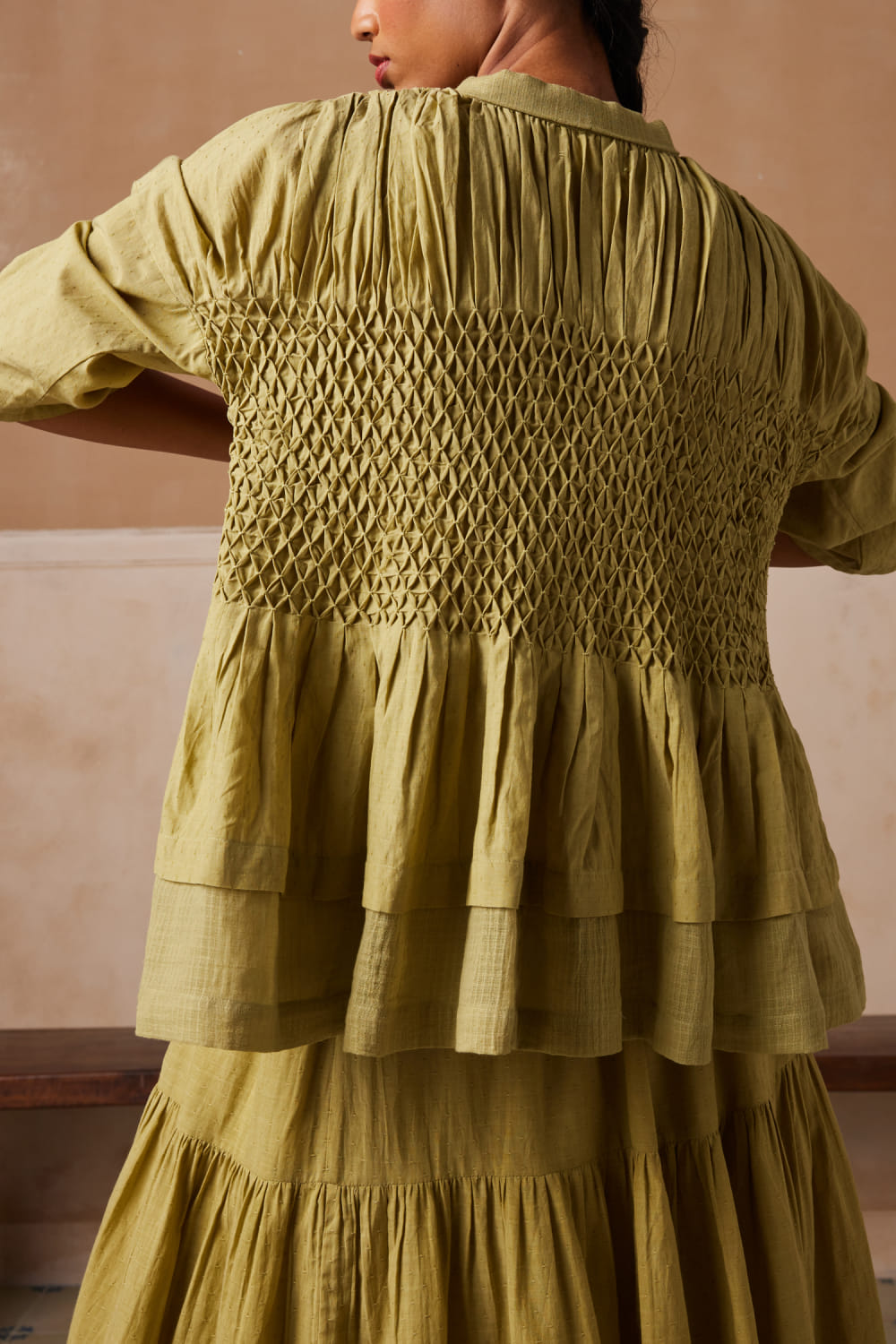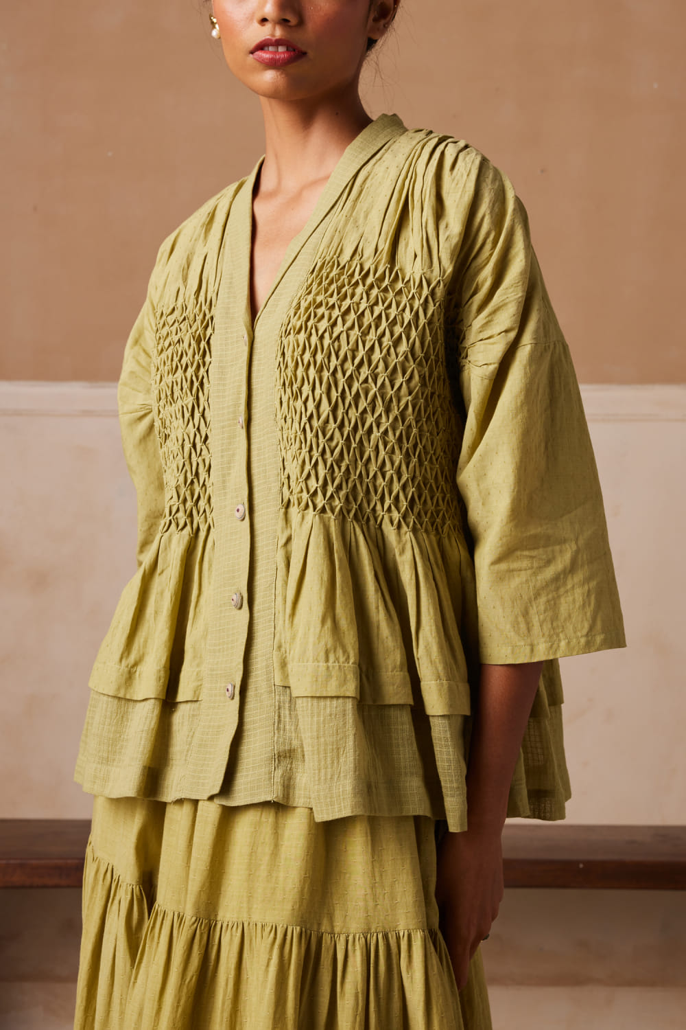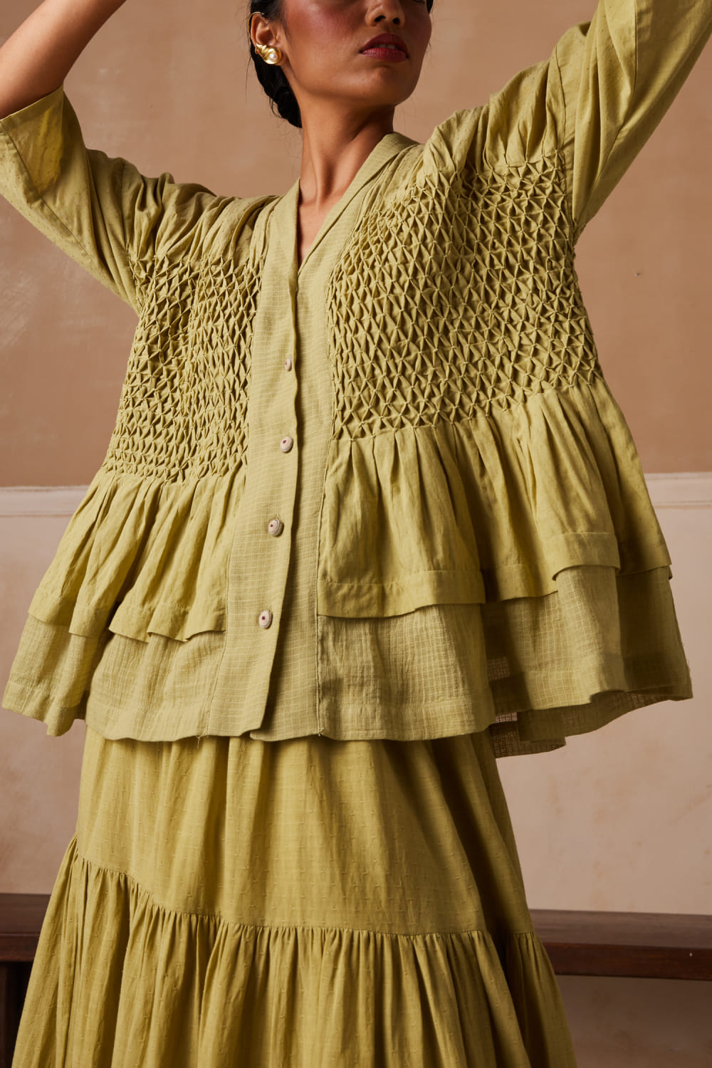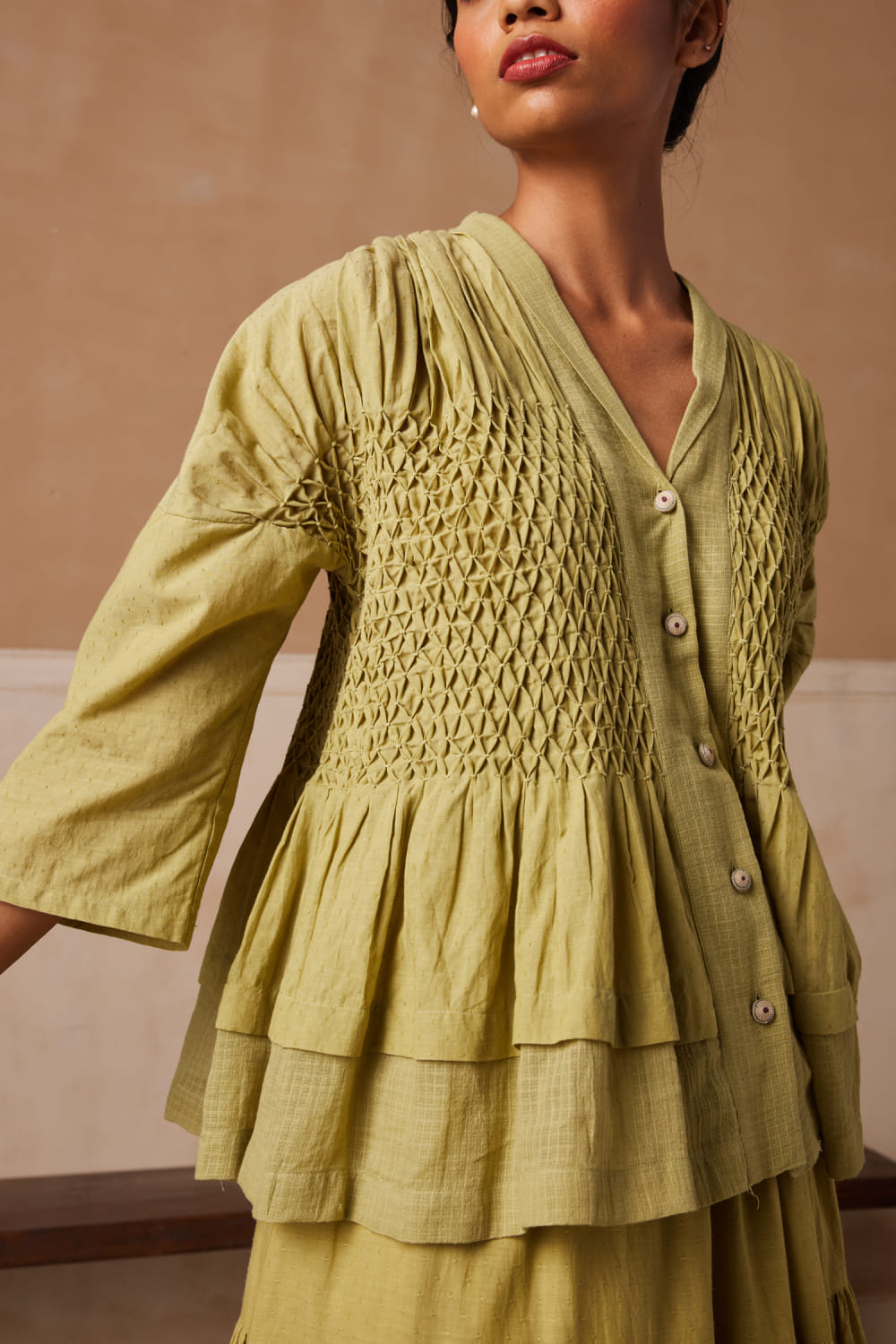 Cord Studio designs this distinctive peplum top in cotton with button-opening, dropped shoulders and smocking detailing. Style it with a pair of sleek pants for a fuss-free look. The skirt here is shown for styling purposes only.