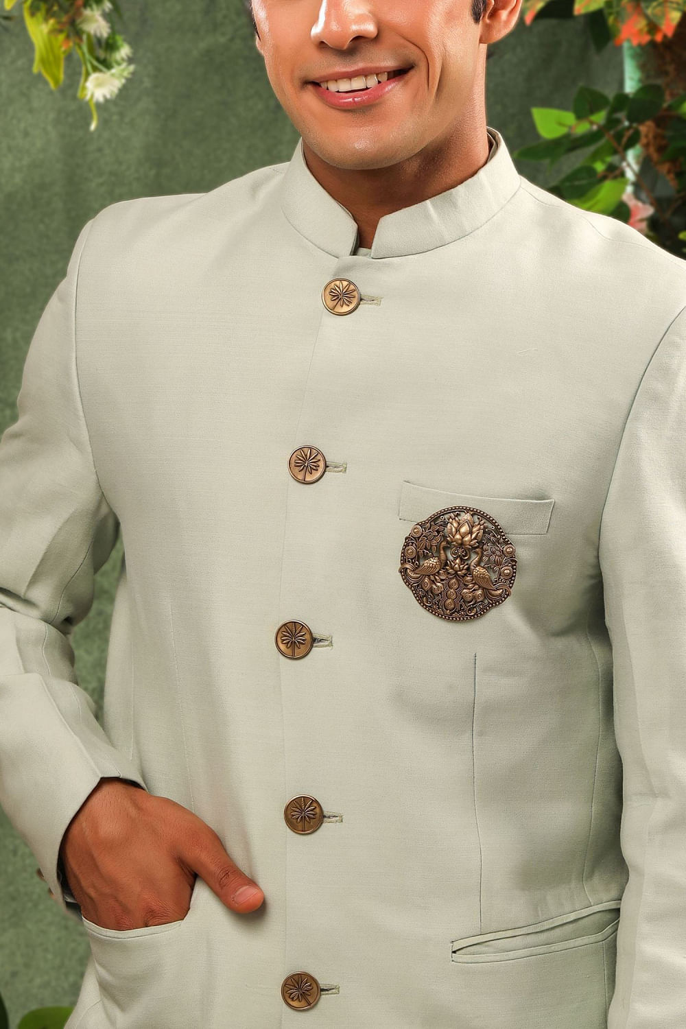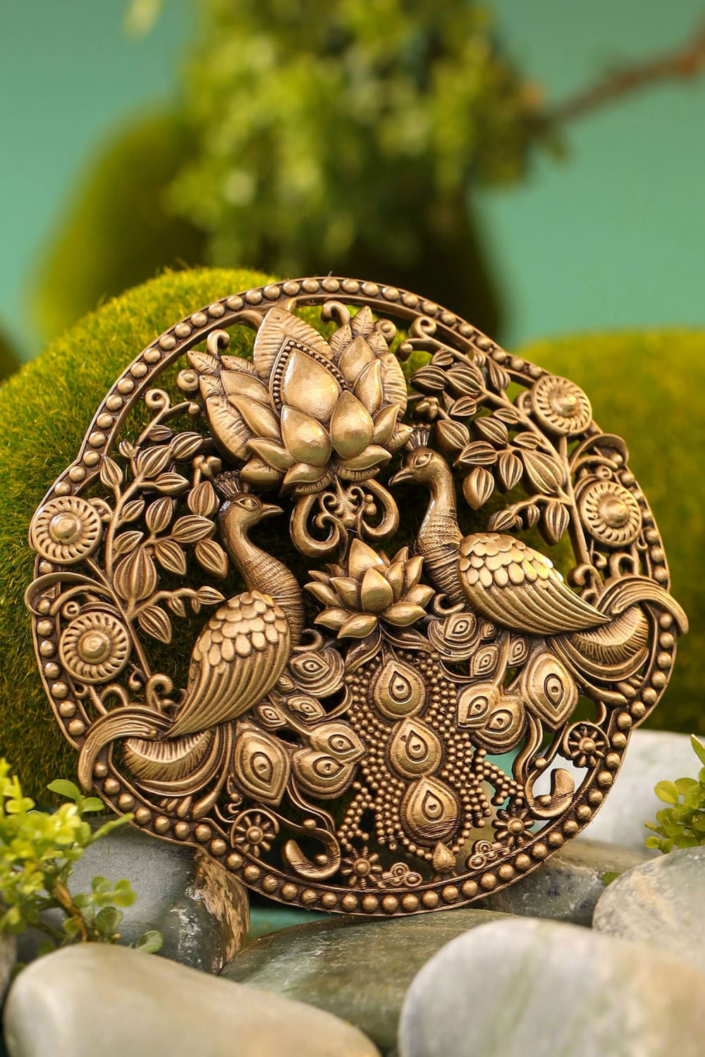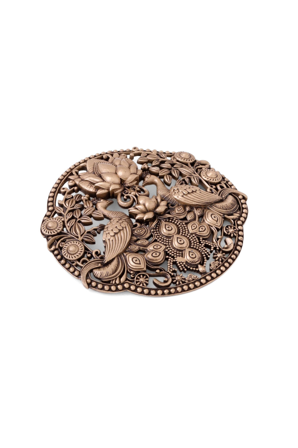 Cosa Nostraa designs this enchanting brooch rendered in brass with intricately carved detailing in peacock and lotus shapes. Style it with a structured kurta set for a debonair look.