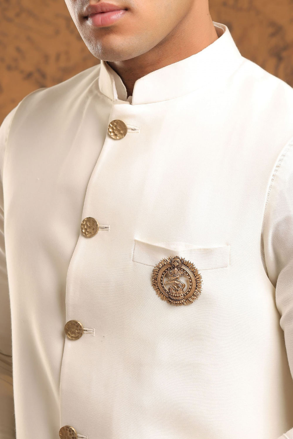 Cosa Nostraa designs this distinctive gift set of brooch and lapel pin customised in antique gold-plated brass with intricate detailing in Lord Shiva's Tandava dance pose, Nataraja and trident shapes. Style the set with a jacket set for wedding festivities.