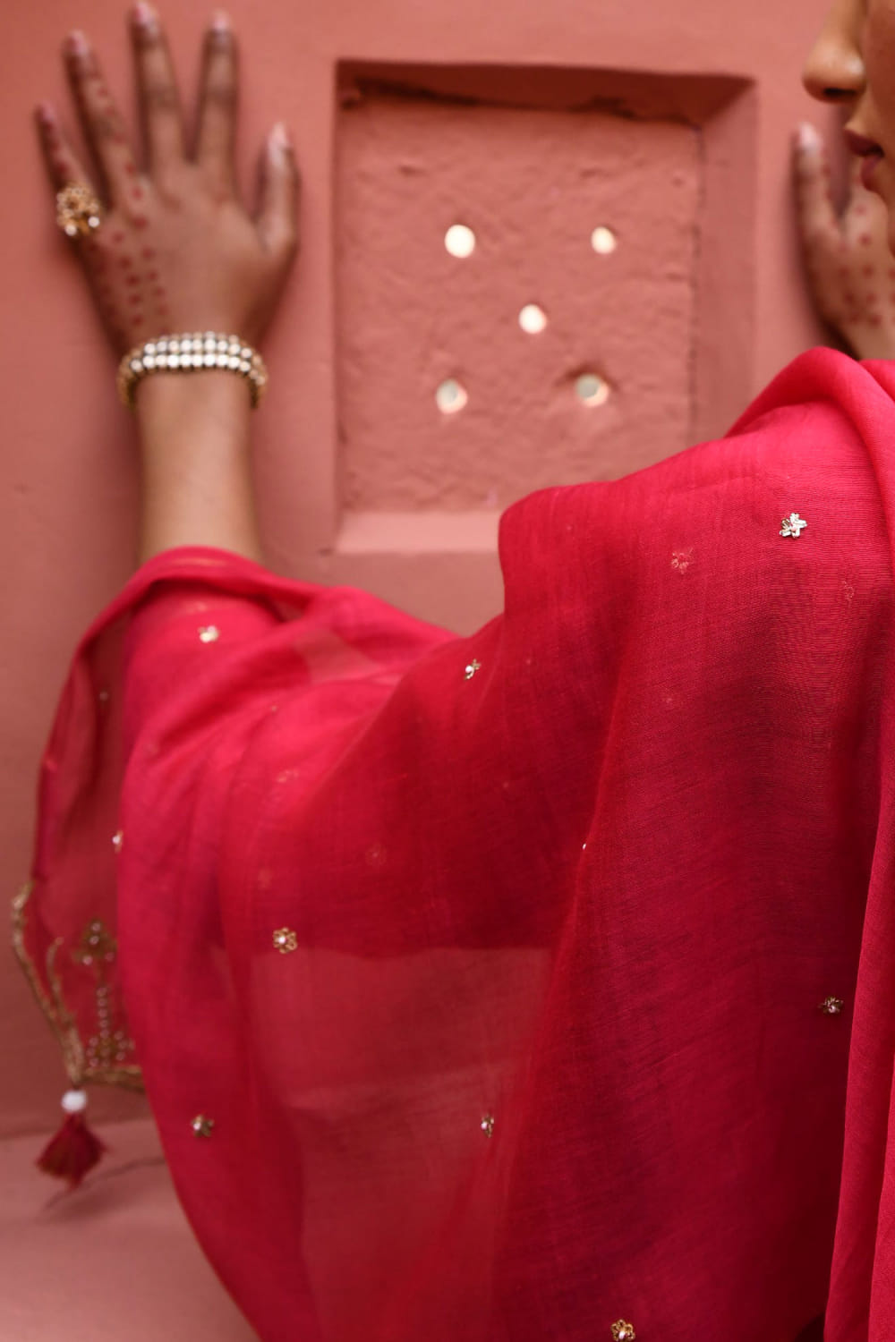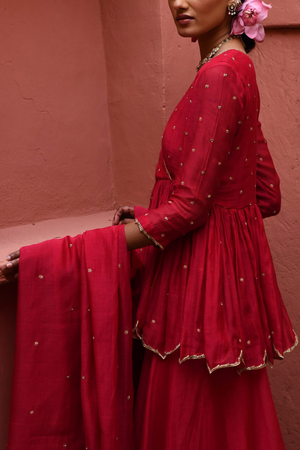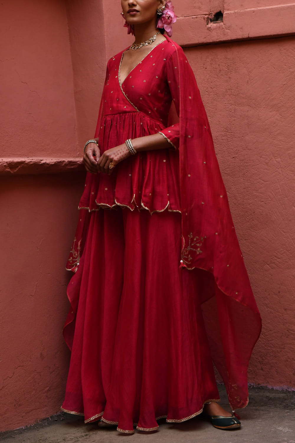 Deep thee designs a resplendent look with this short peplum style angrakha crafted with zari and zardozi embroidery in chanderi, enriched with dainty bead accents in floral motifs. It is paired with a matching sharara and embroidered dupatta. Adorn the look with polki danglers and embellished bangles for a wedding function.