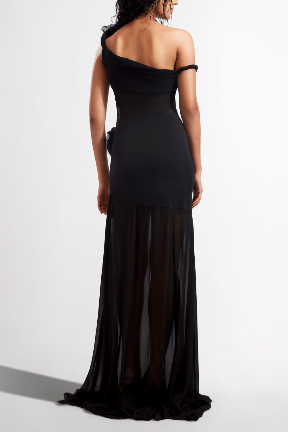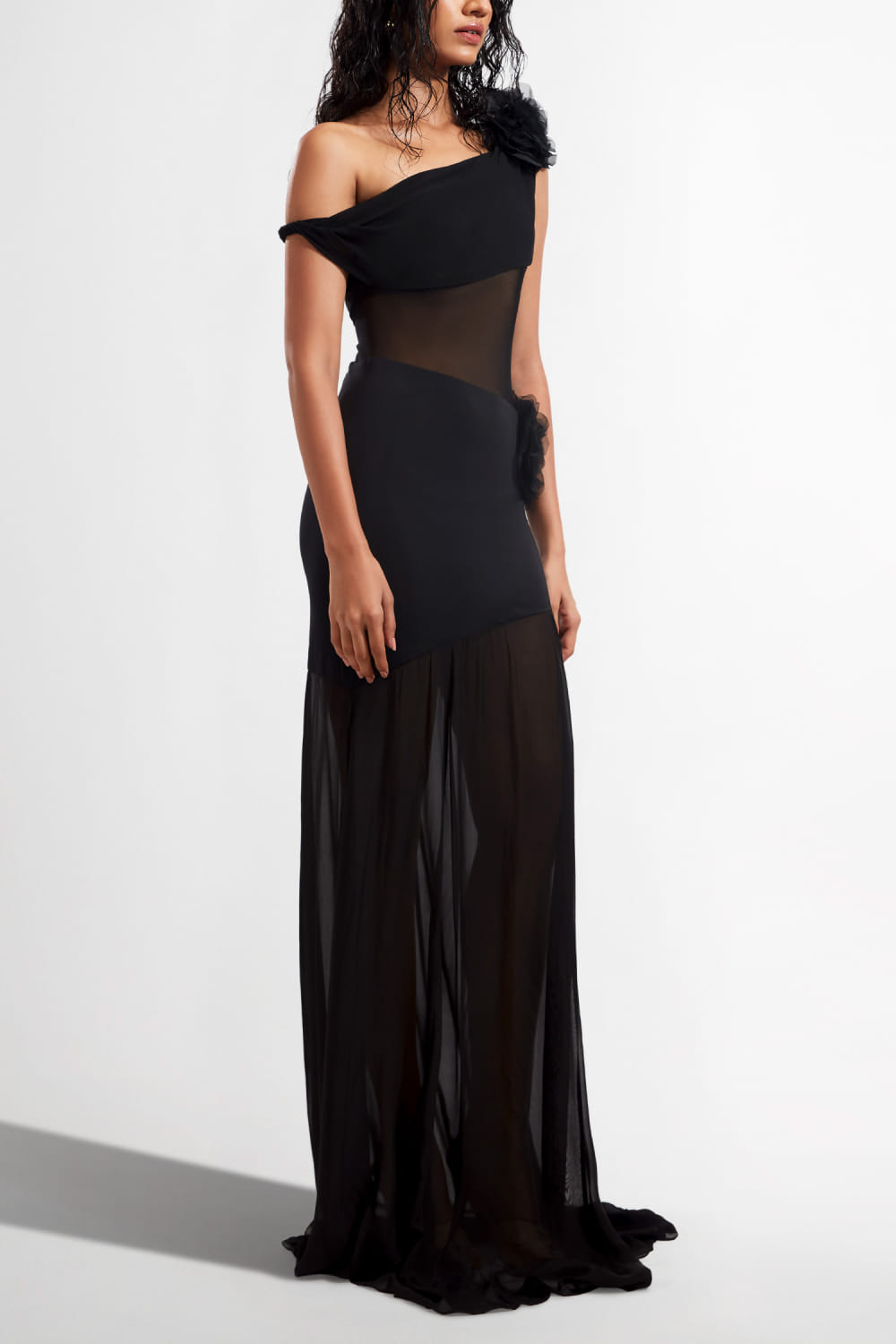 Deme by Gabriella designs a contemporary look with this one-shoulder gown embraced in malai lycra, net and chiffon with 3D floral accents and draped detailing. Style the look with solitaire earrings and a statement ring for an evening soiree.
