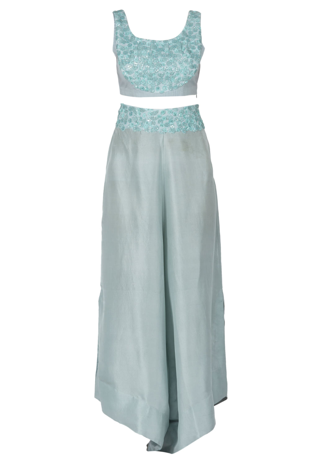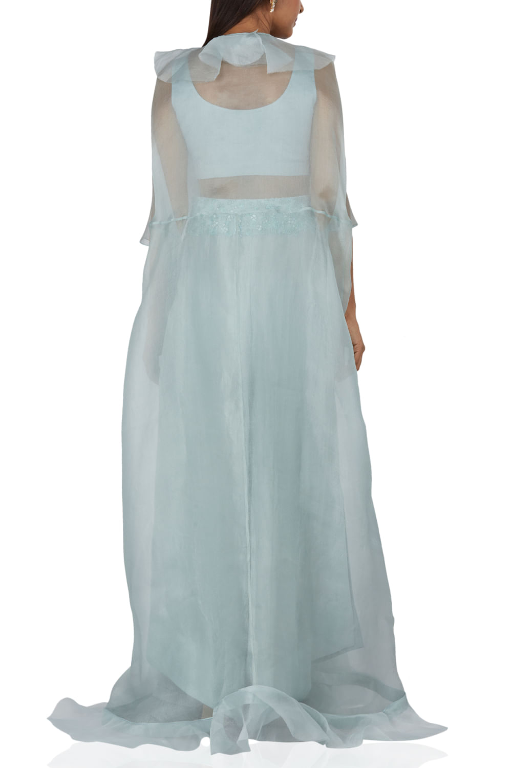Anamika Khanna swaddles you cool blues this festive season in a blue embellished crop top paired with wide-leg pants and a flounce cape. Style the look with crystal danglers and silver embellished heels.