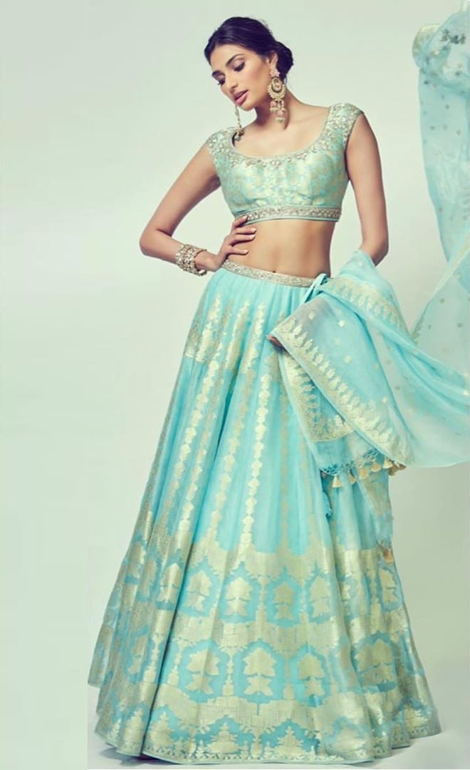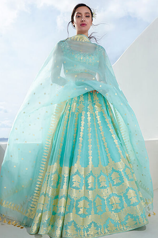 An airy, pastel lehenga that calls to mind princesses from times of yore. Its metallic gold thread work dazzles, while the complementing choli and dupatta add to its soft glamour.