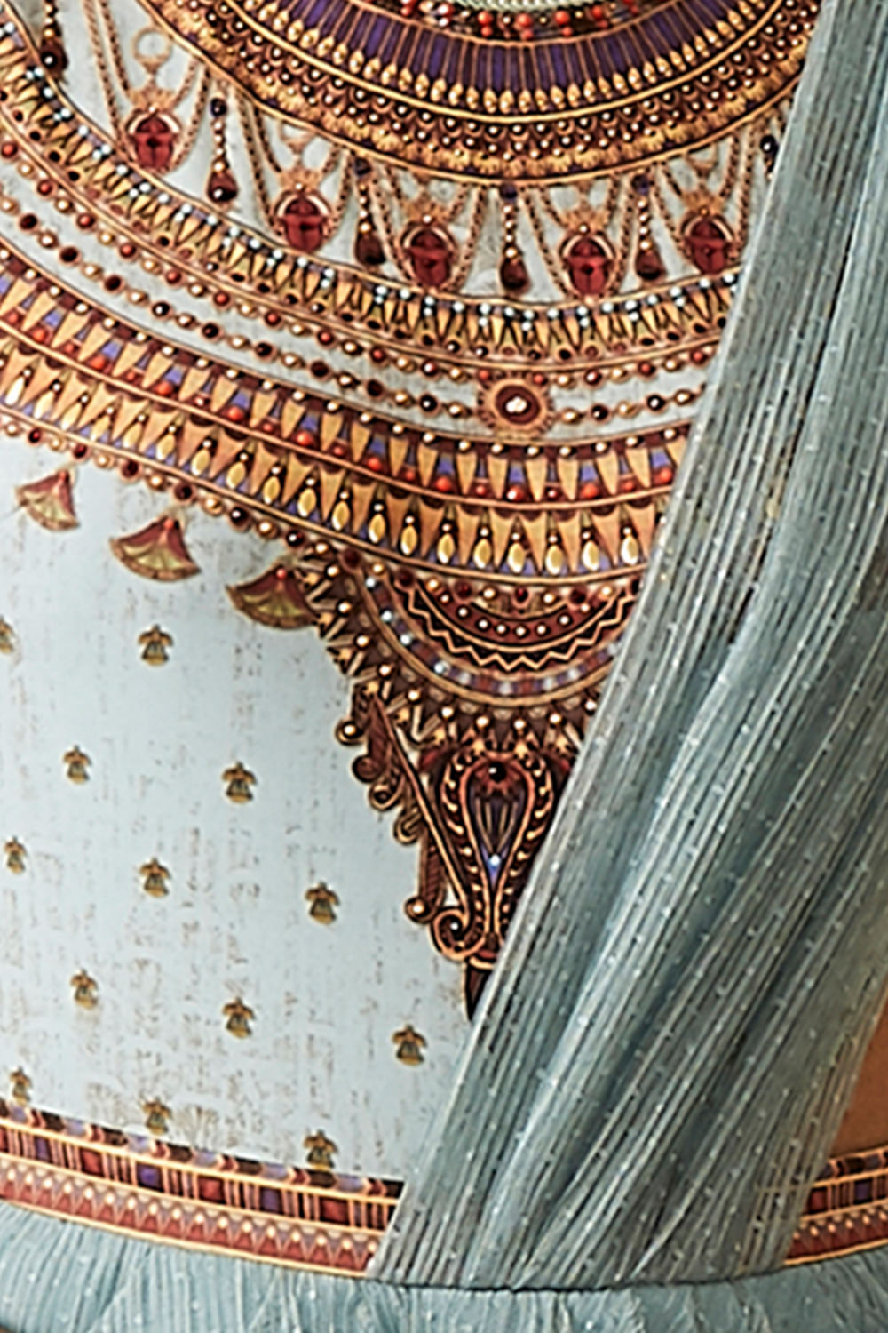 Tarun Tahiliani's dotted crinkle pre-draped sari paired with a hand-painted Egyptian jewel print blouse with diamonds and studs is ideal for a sangeet ceremony. Pair it with stilettos and statement earrings.