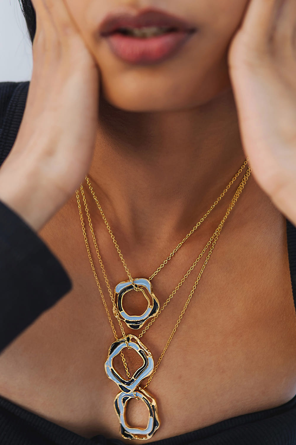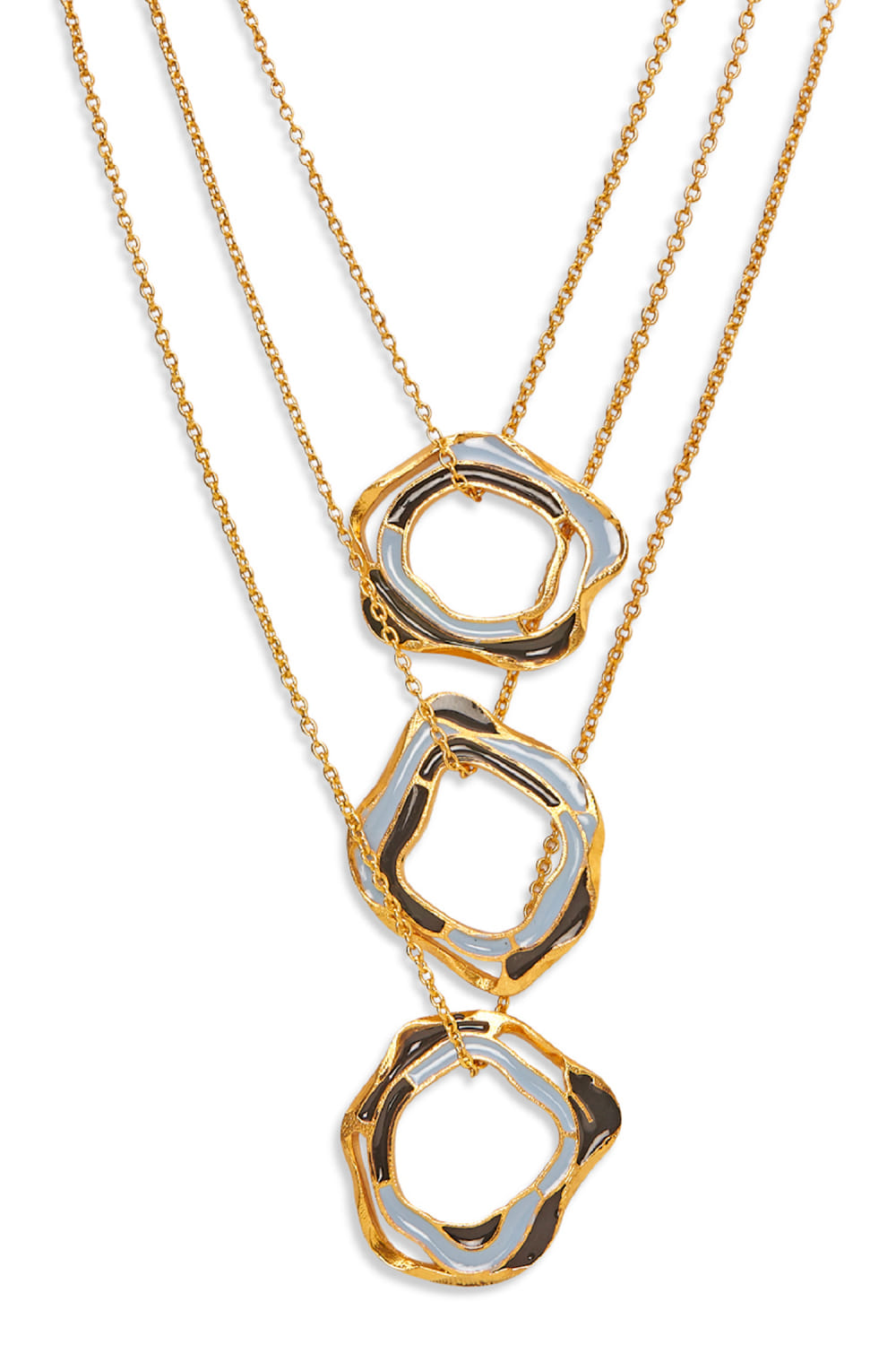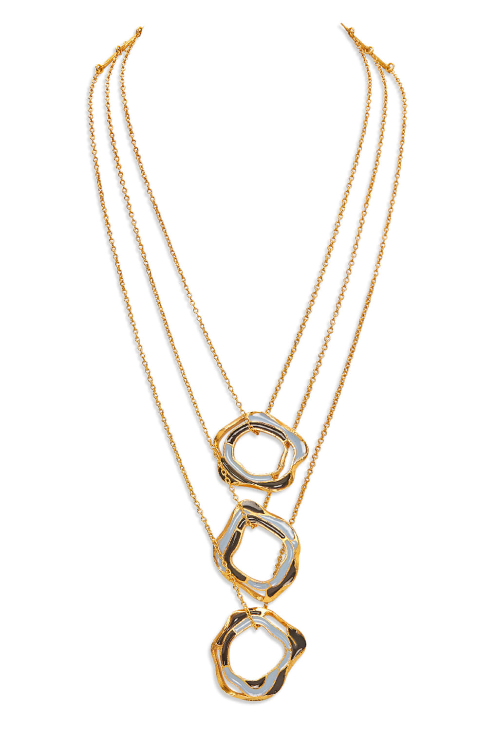 Dhwani Bansal designed this enchanting layered chain necklace crafted in 22k micro gold plating on brass with an adjustable chain featuring shades of azure and black enamel in an artsy pattern. Style it with a cowl neck gown.