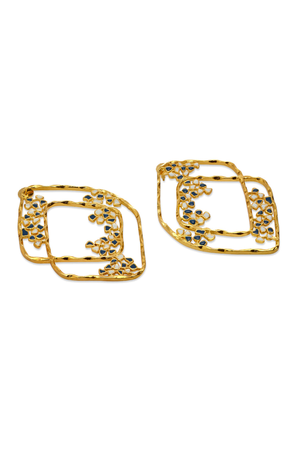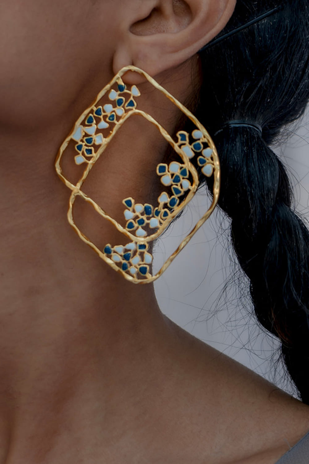 Dhwani Bansal designs this stylish pair of hoop earrings crafted in 22k micro gold plating on brass, featuring shades of blue enamel in an artsy pattern. Style them with a ruffled shirt and pants.