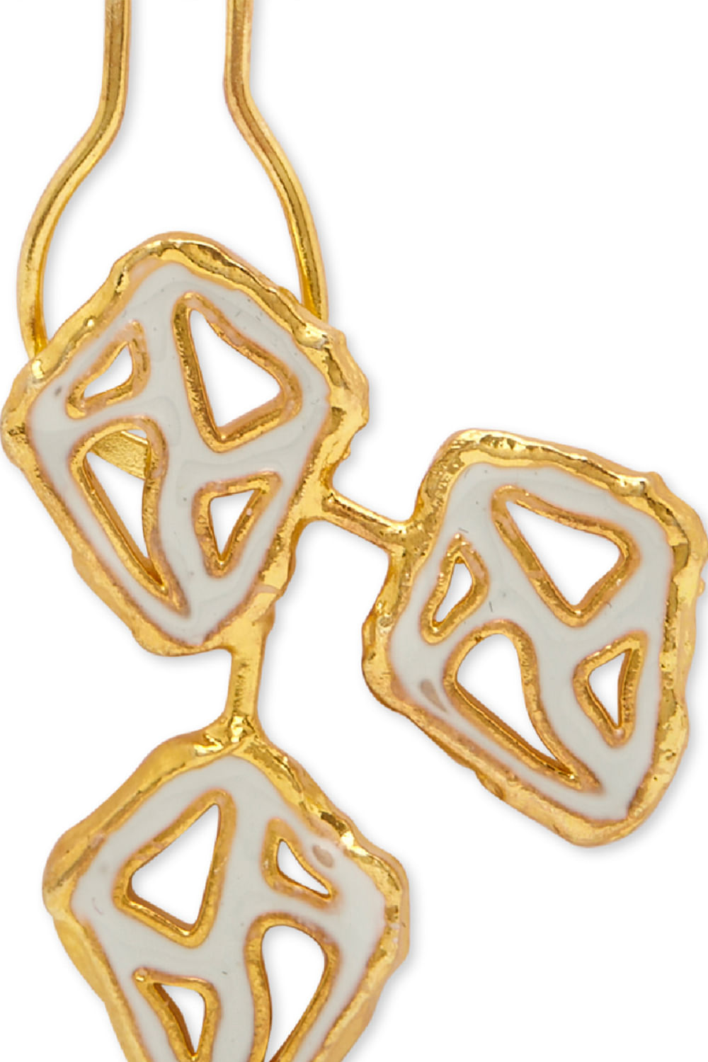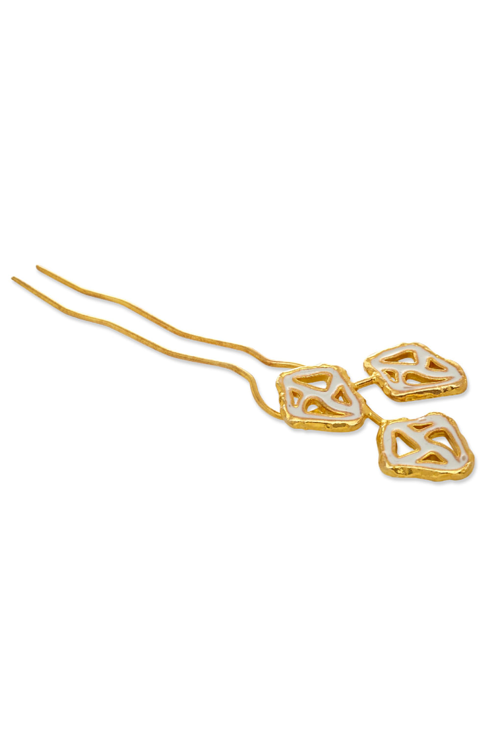 Dhwani Bansal designed this trendsetting hairpin customised in 22k micro gold plating on brass accented with blue-grey enamel in an artsy pattern. Add an artsy touch to your hairstyle with this stunner.