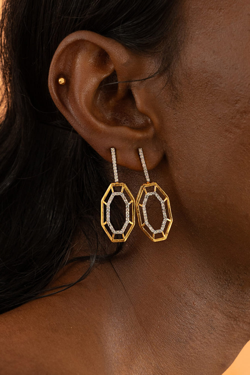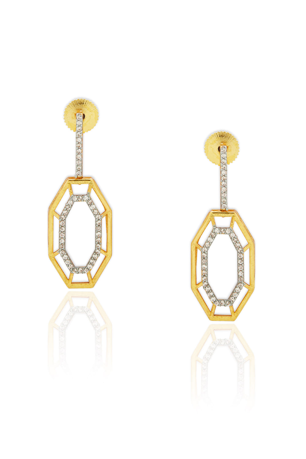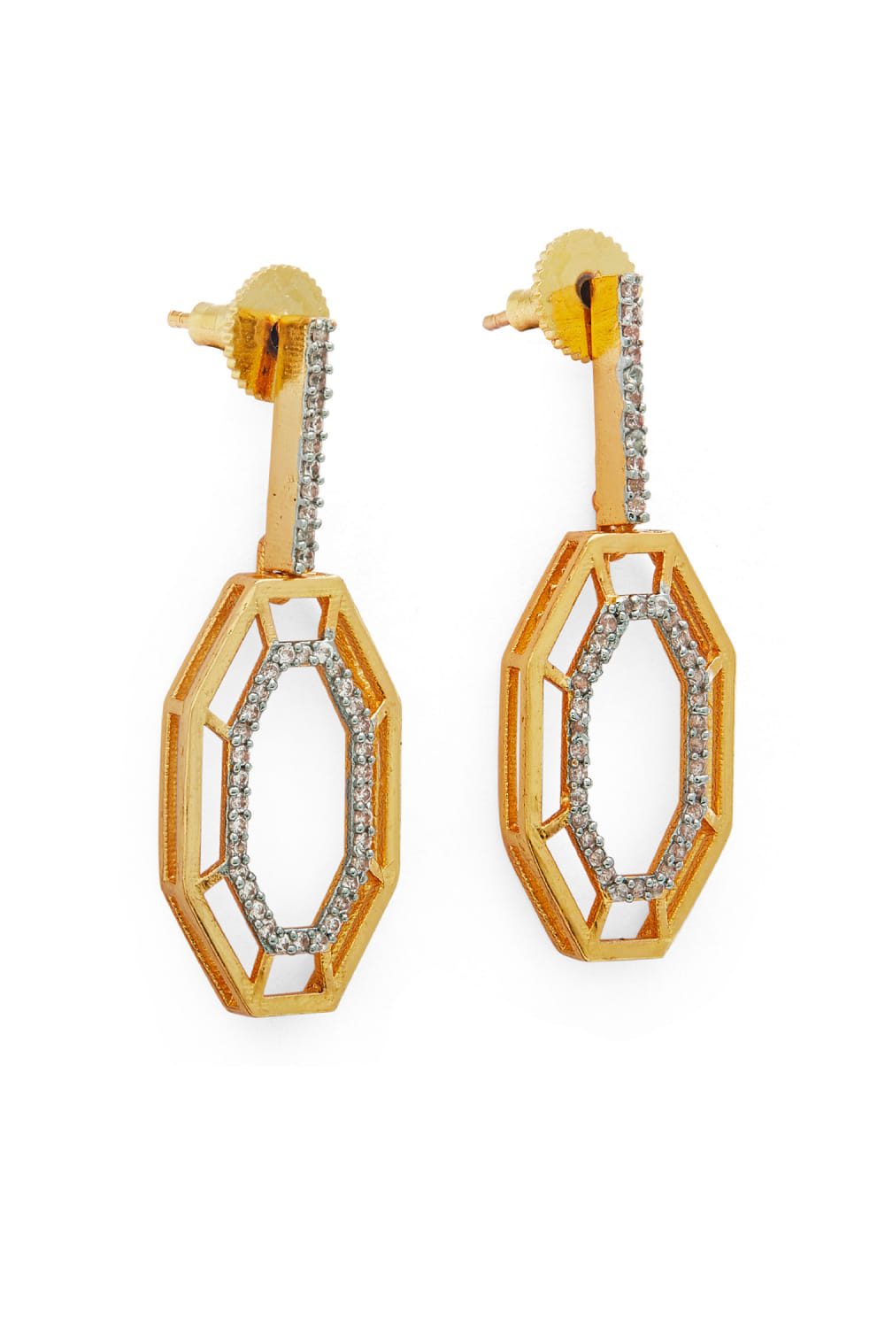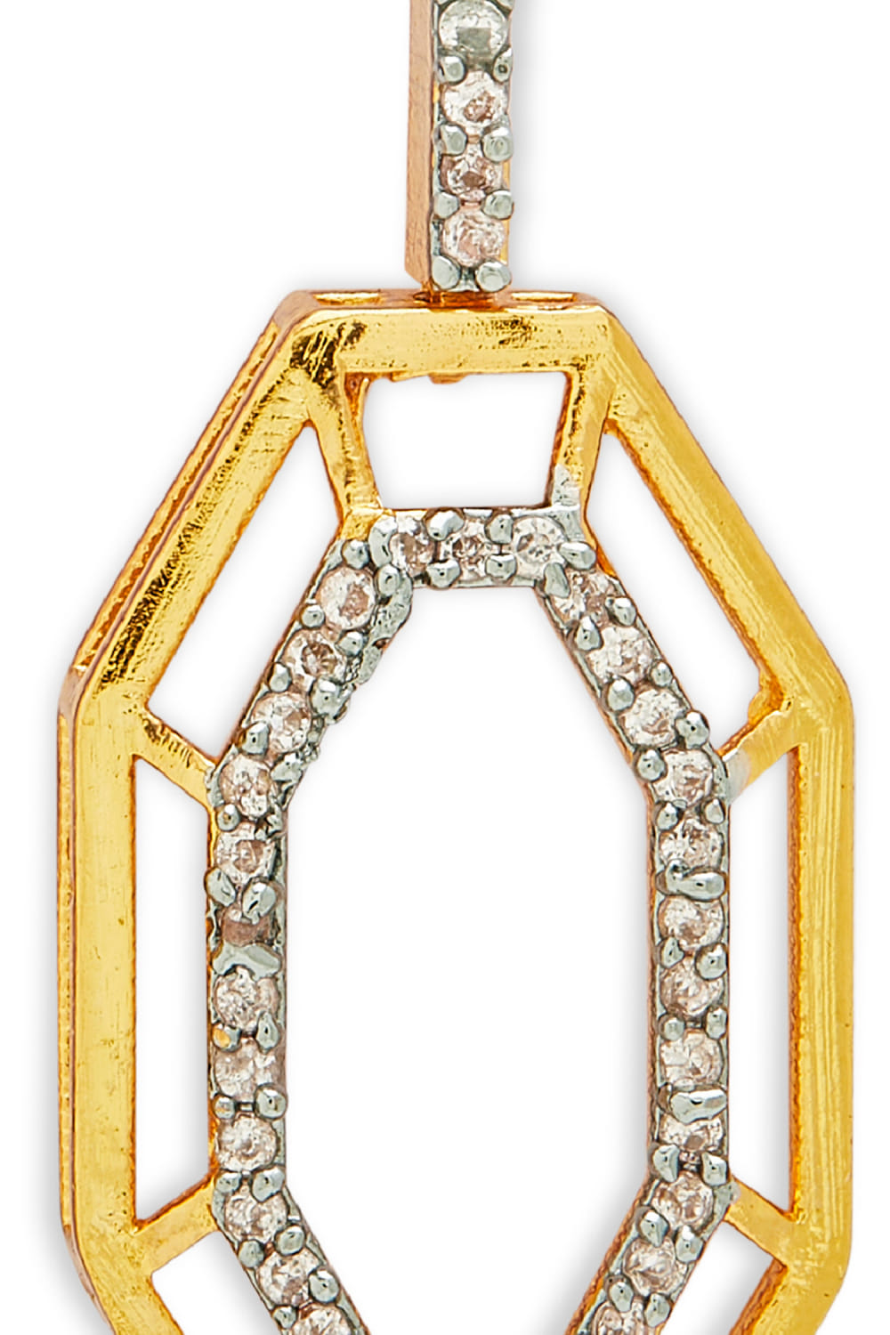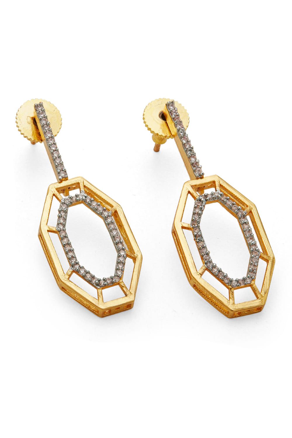 Dhwani Bansal designs this fusion pair of earrings crafted in 22kt micron gold plated on brass enhanced with cubic zirconia detailing in a geometric pattern. Style it with an off-shoulder dress for the party.