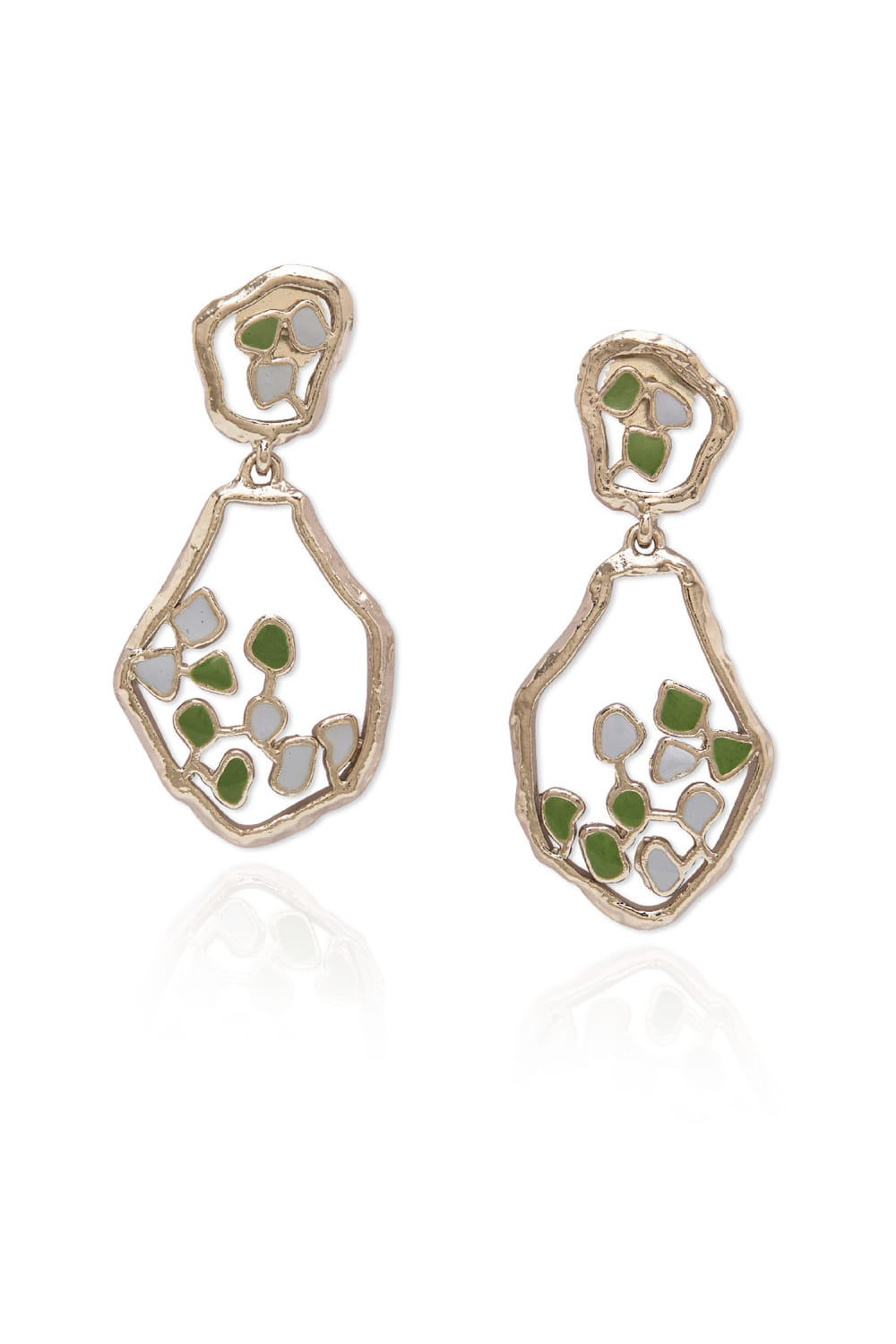 Dhwani Bansal designs these collectable drop earrings crafted in 22k micro gold plating on brass featuring shades of pastel green and grey enamel. Style them with an embellished anarkali ensemble.