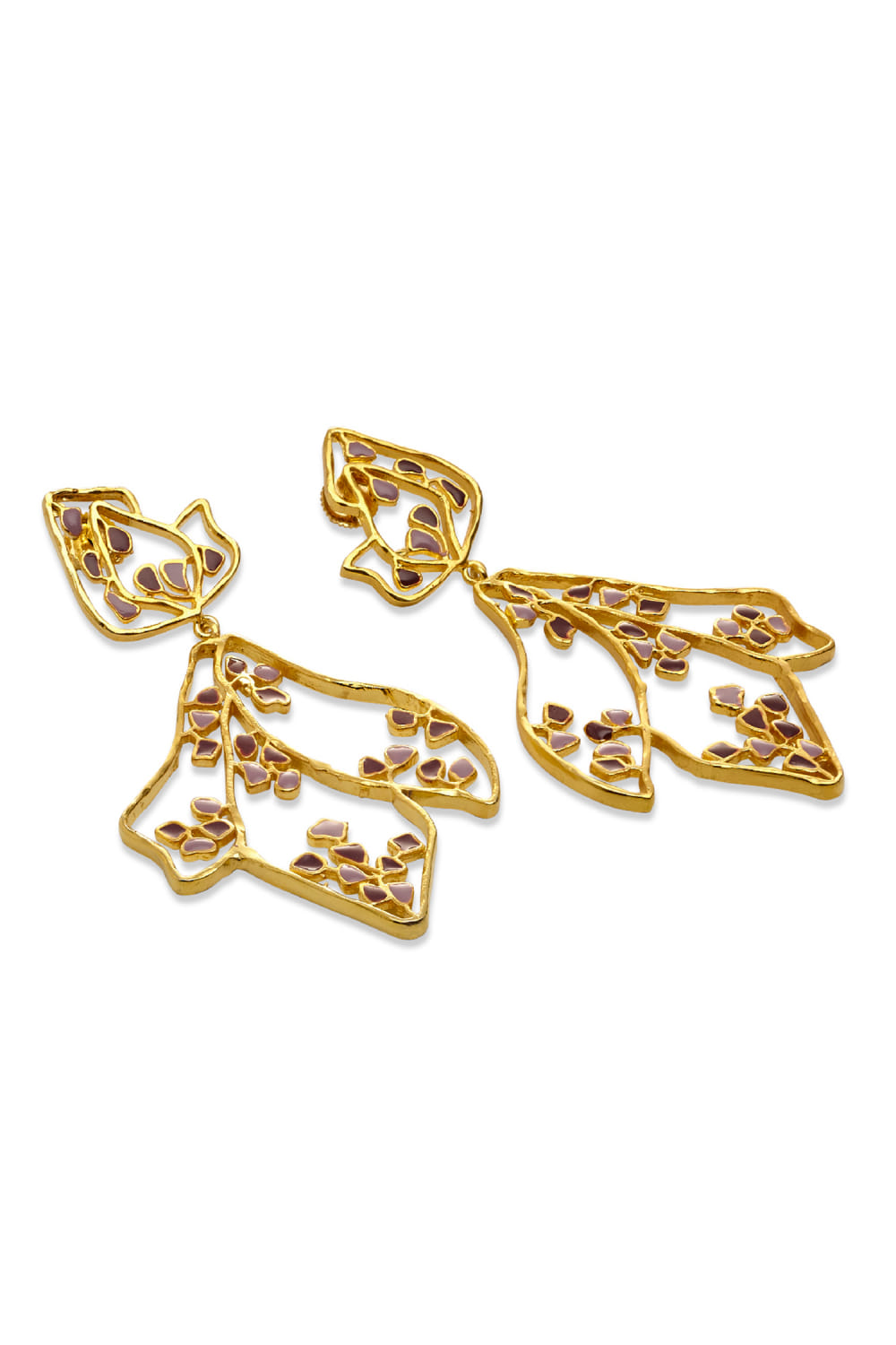 Dhwani Bansal designs this artsy pair of dangles crafted in 22k micro gold plating on brass featuring shades of amethyst enamel. Style them with a kaftan ensemble.