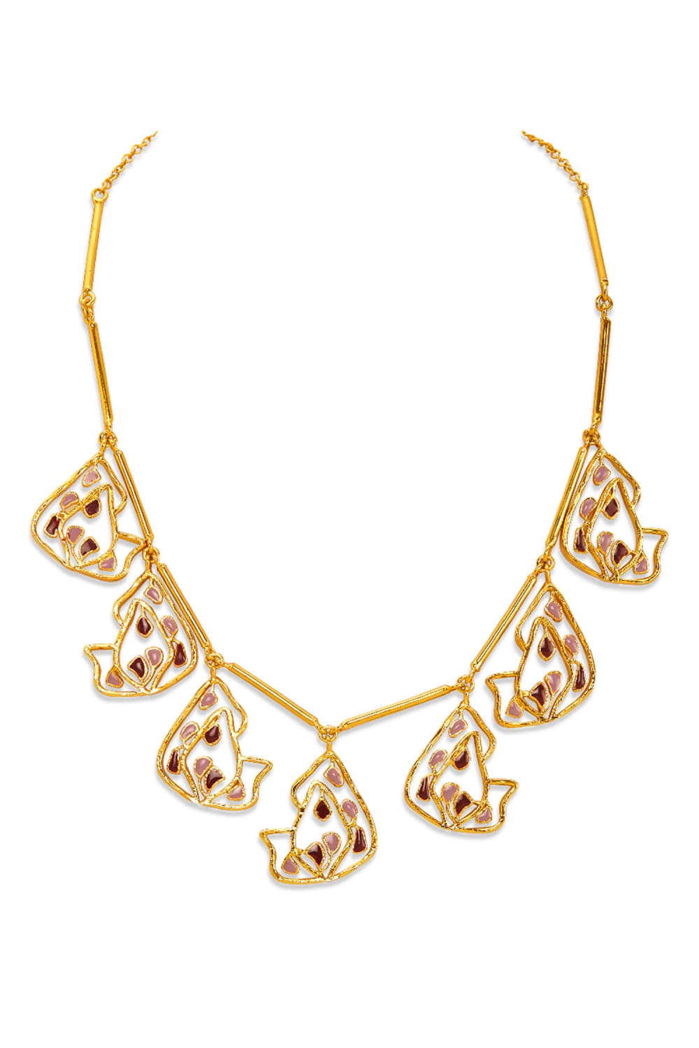Dhwani Bansal designed this enchanting necklace crafted in 22k micro gold plating on brass with an adjustable chain featuring shades of amethyst enamel in an artsy pattern. Style it with a lehenga set