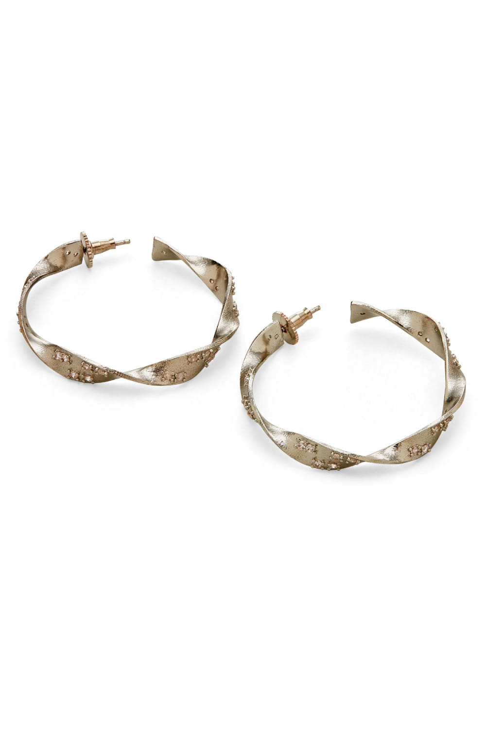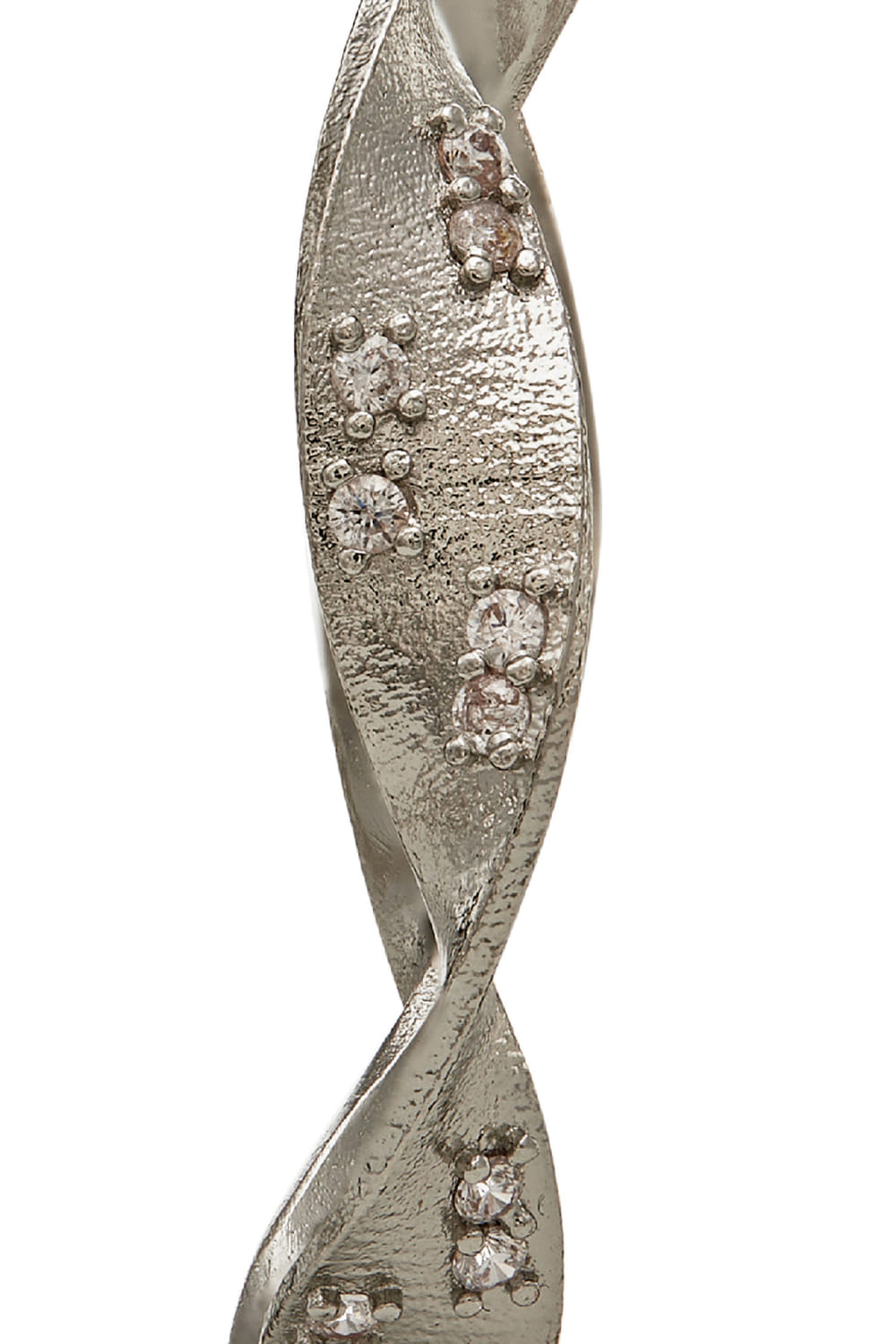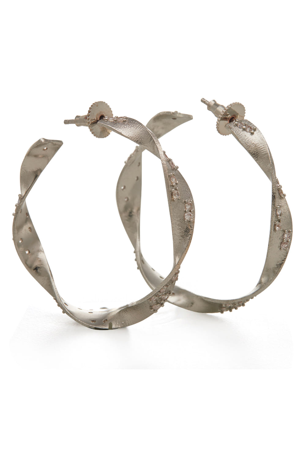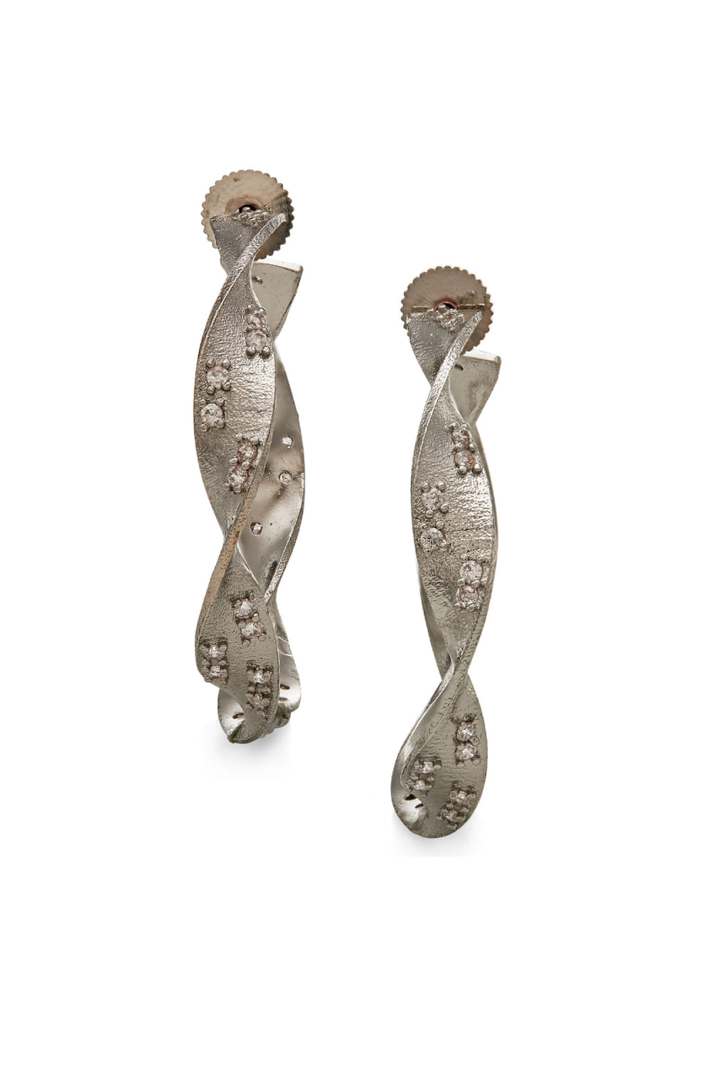 Dhwani Bansal designs this charming pair of hoop earrings crafted in rhodium plated on brass enriched with cubic zirconia in a twisted pattern. Style it with a sequined dress for a striking appeal.