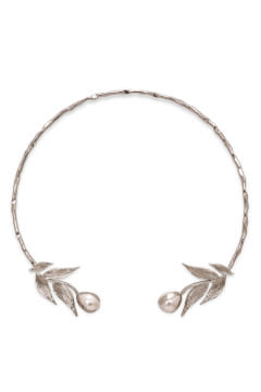 Dhwani Bansal designs this modern choker crafted in rhodium plated brass, enhanced with baroque pearl and leaf patterns. Style it with a wrap skirt for a vacation look.