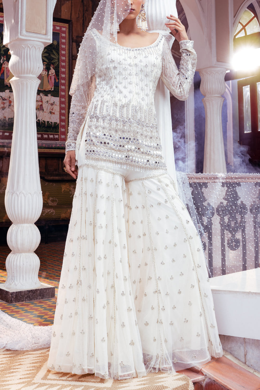 DiyaRajvvir designs this elegant kurta crafted in tulle with intricate cutdana and mirror embroidery detailing in floral motifs featuring tassel accents, complementing it with a matching embroidered gharara. Style the look with chandelier earrings and metallic stilettos for a festive appeal.