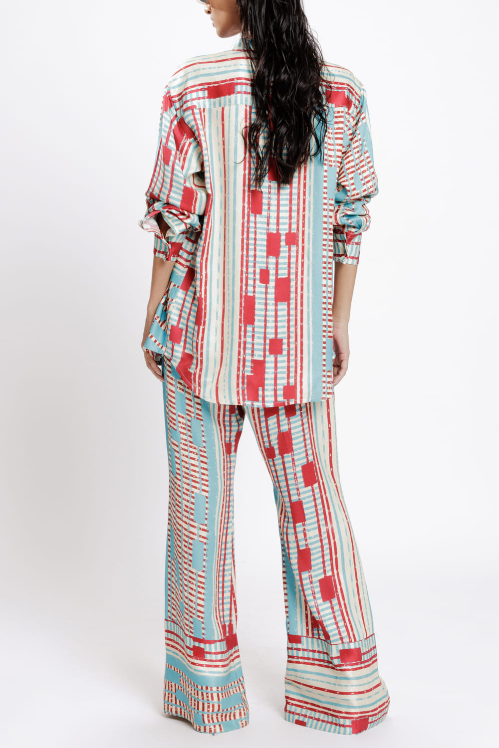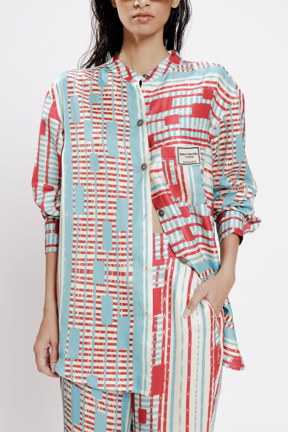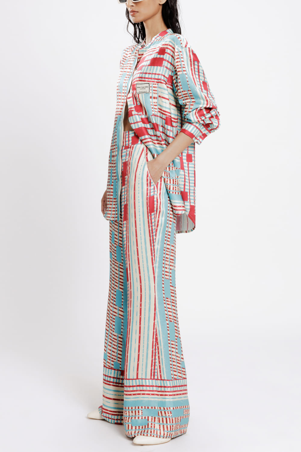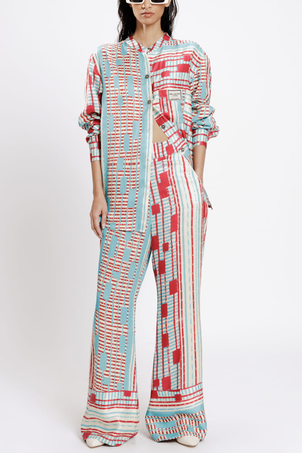 Doh Tak Keh designs this comfy pair of trousers customised in bemberg twill satin with artsy Mumbai railway junction-inspired prints featuring a side zipper. Style it with a matching shirt and block heels for high-tea. The shirt here is shown for styling purposes only.