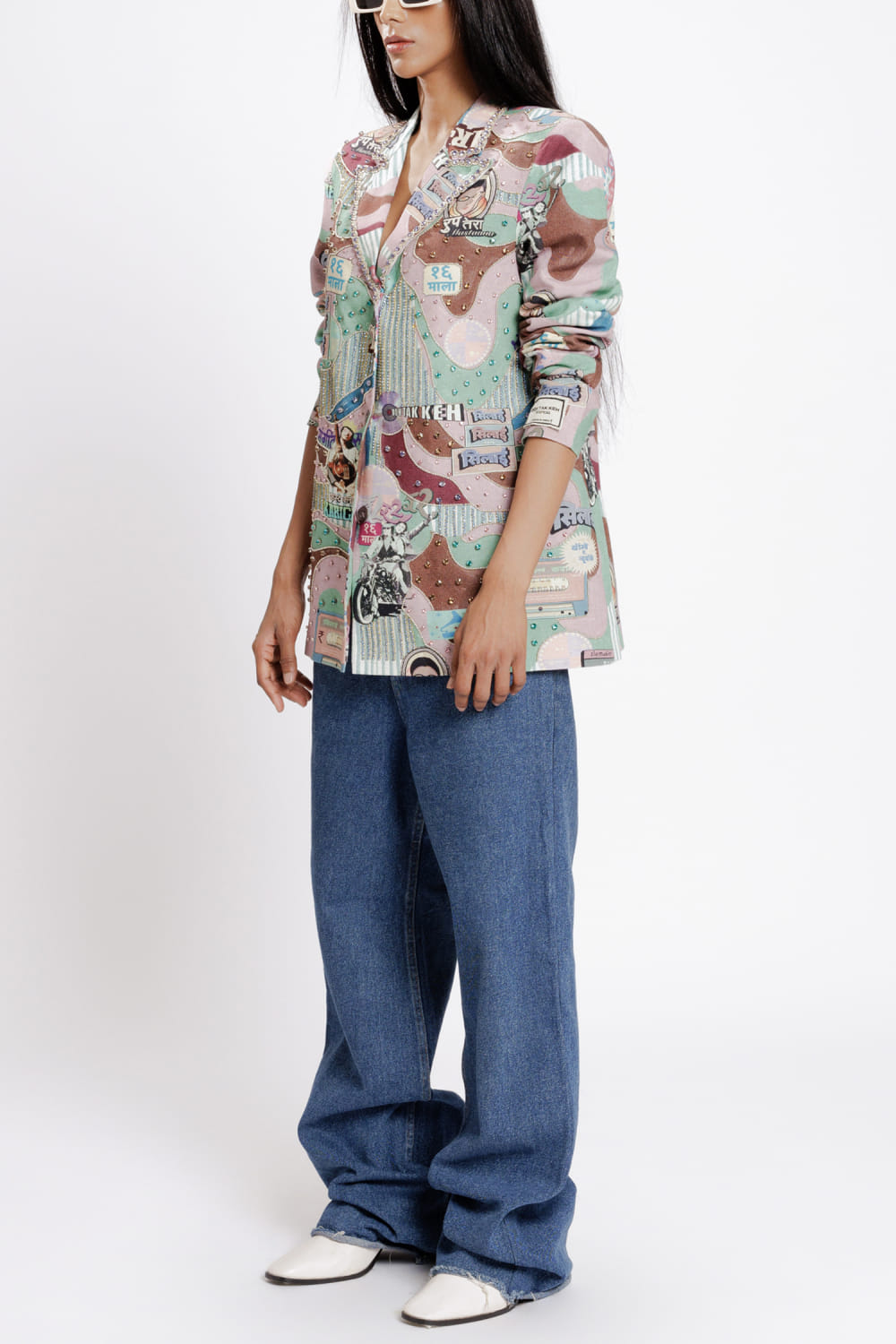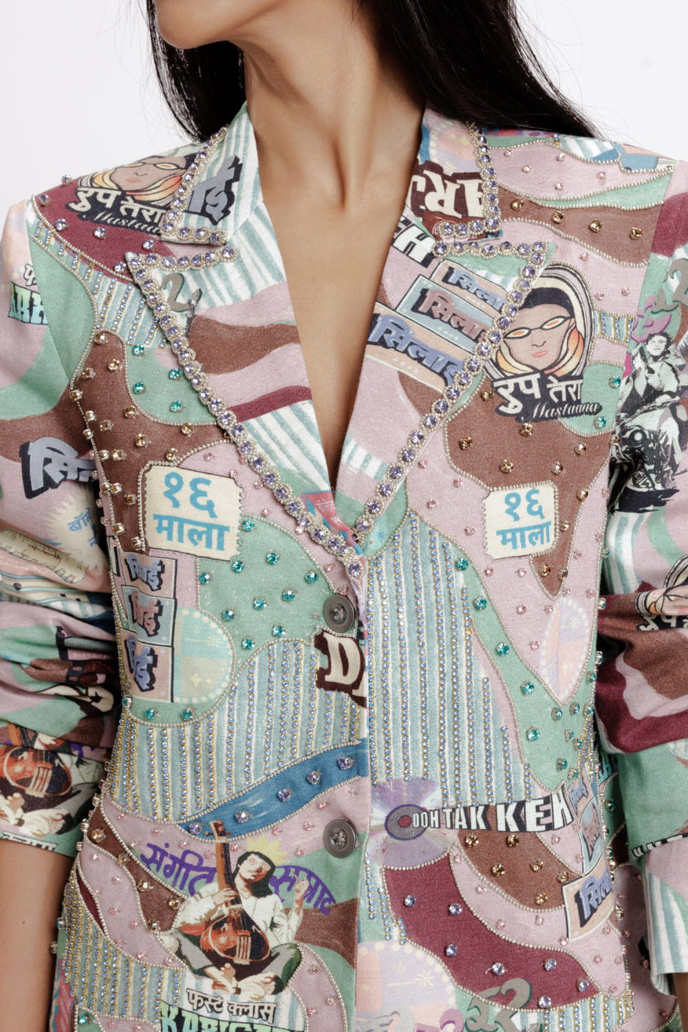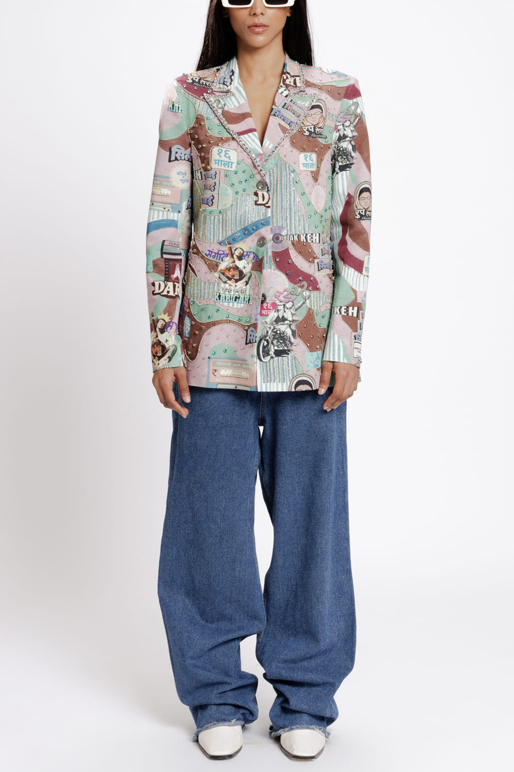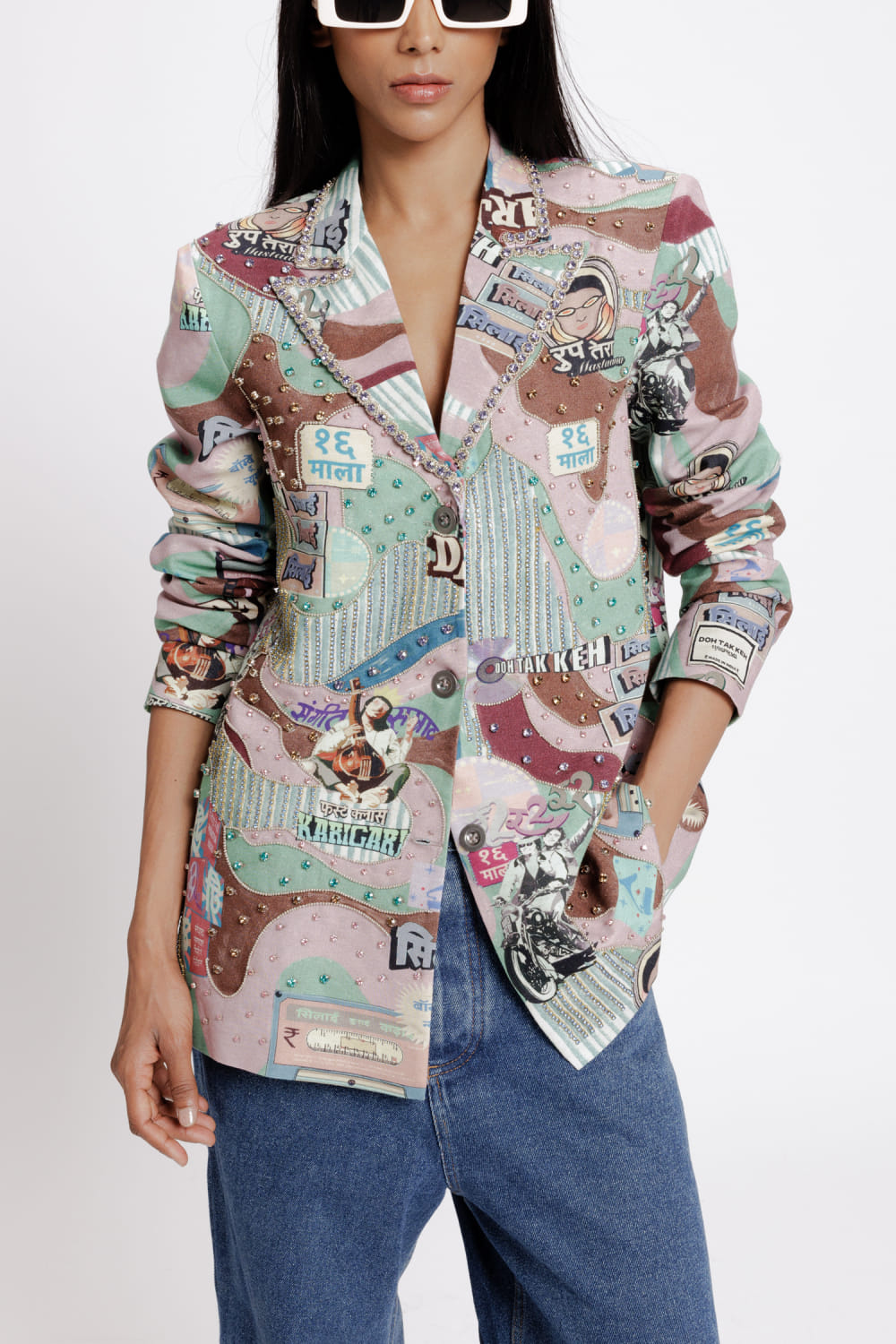 Doh Tak Keh designs this eye-catching blazer rendered in rayon flex with vintage Bollywood-inspired prints featuring crystal embellishments in an oversized fit. Style it with jeans and mule heels for a luncheon. The pants here are shown for styling purposes only.