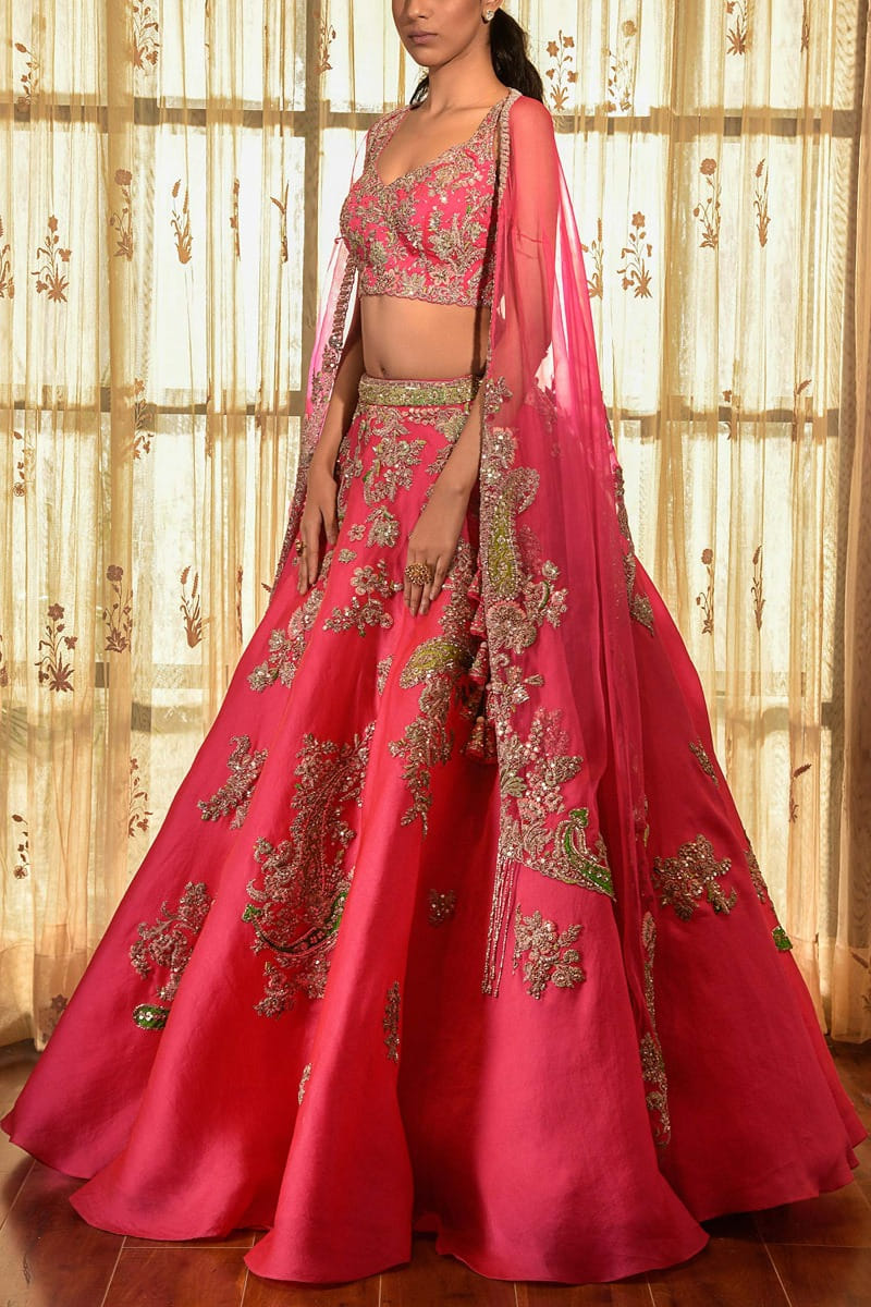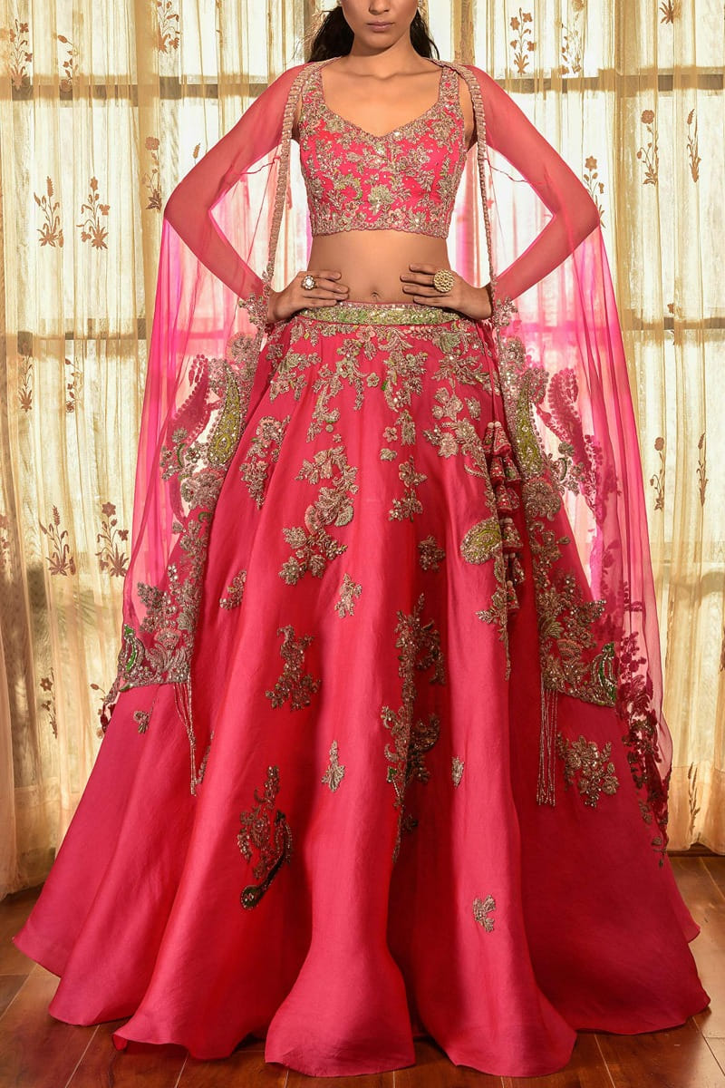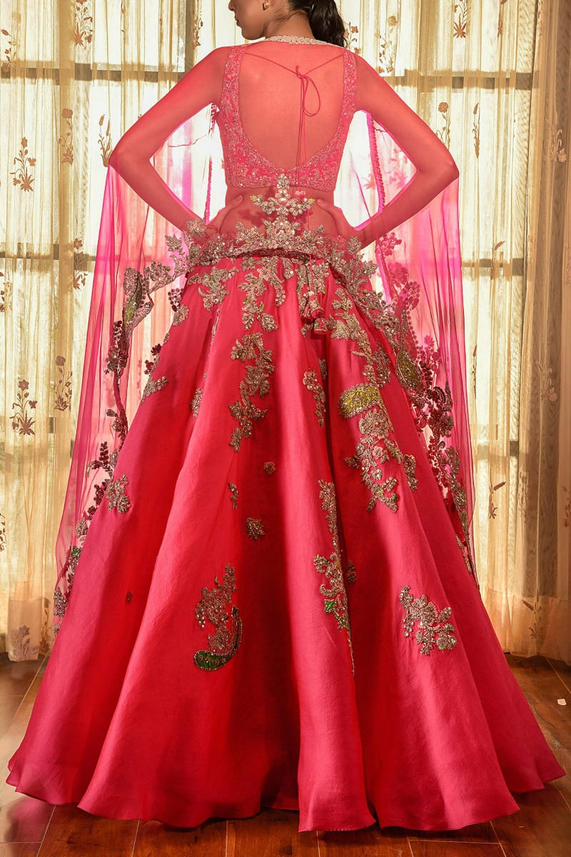 Dolly J designs this voluminous and bright candy pink lehenga customised in organza with embroidered patterns, teaming it with an embellished blouse and an organza cape. Style the look with a maang tikka and necklace set for the reception soiree.