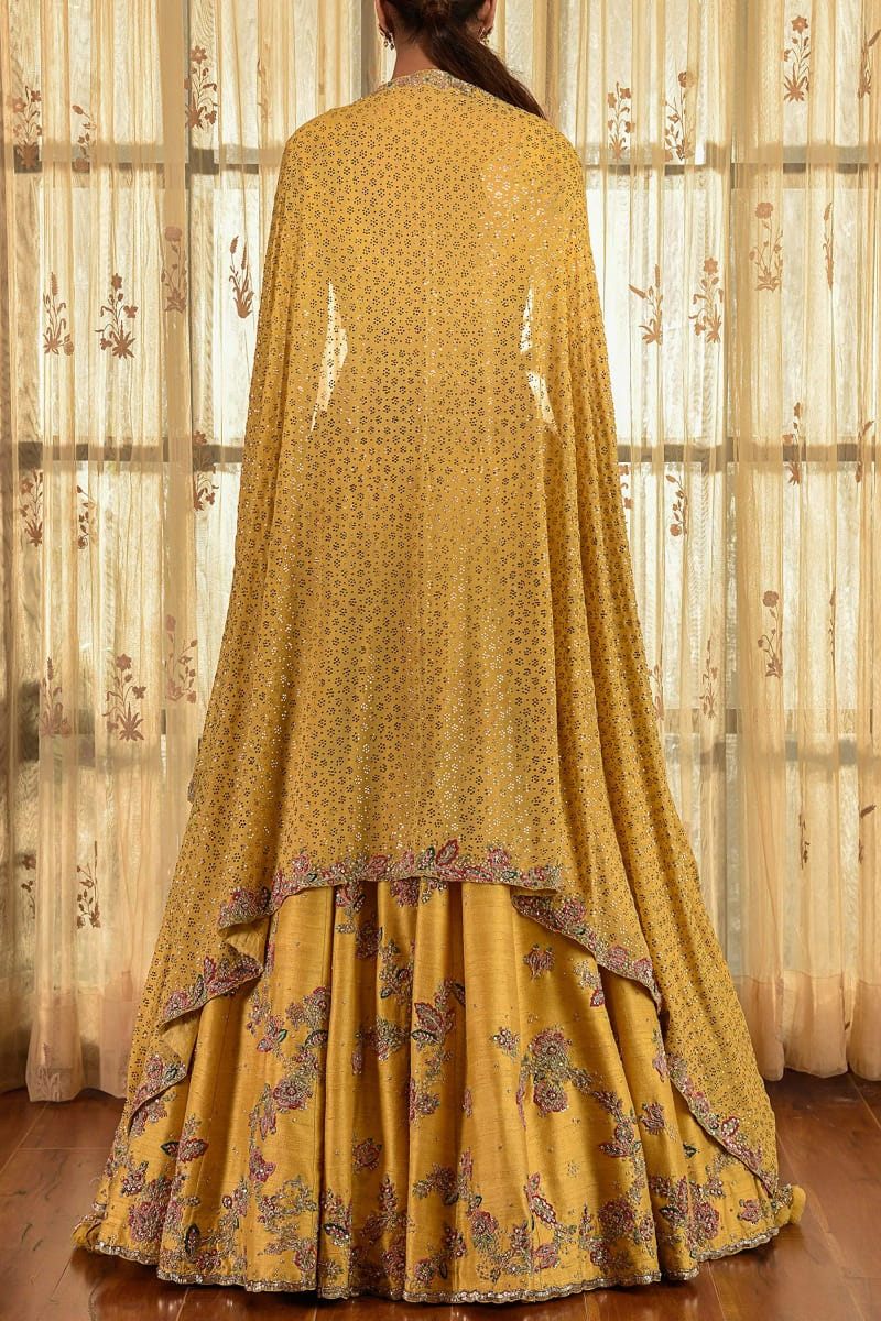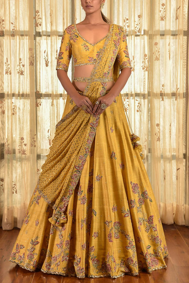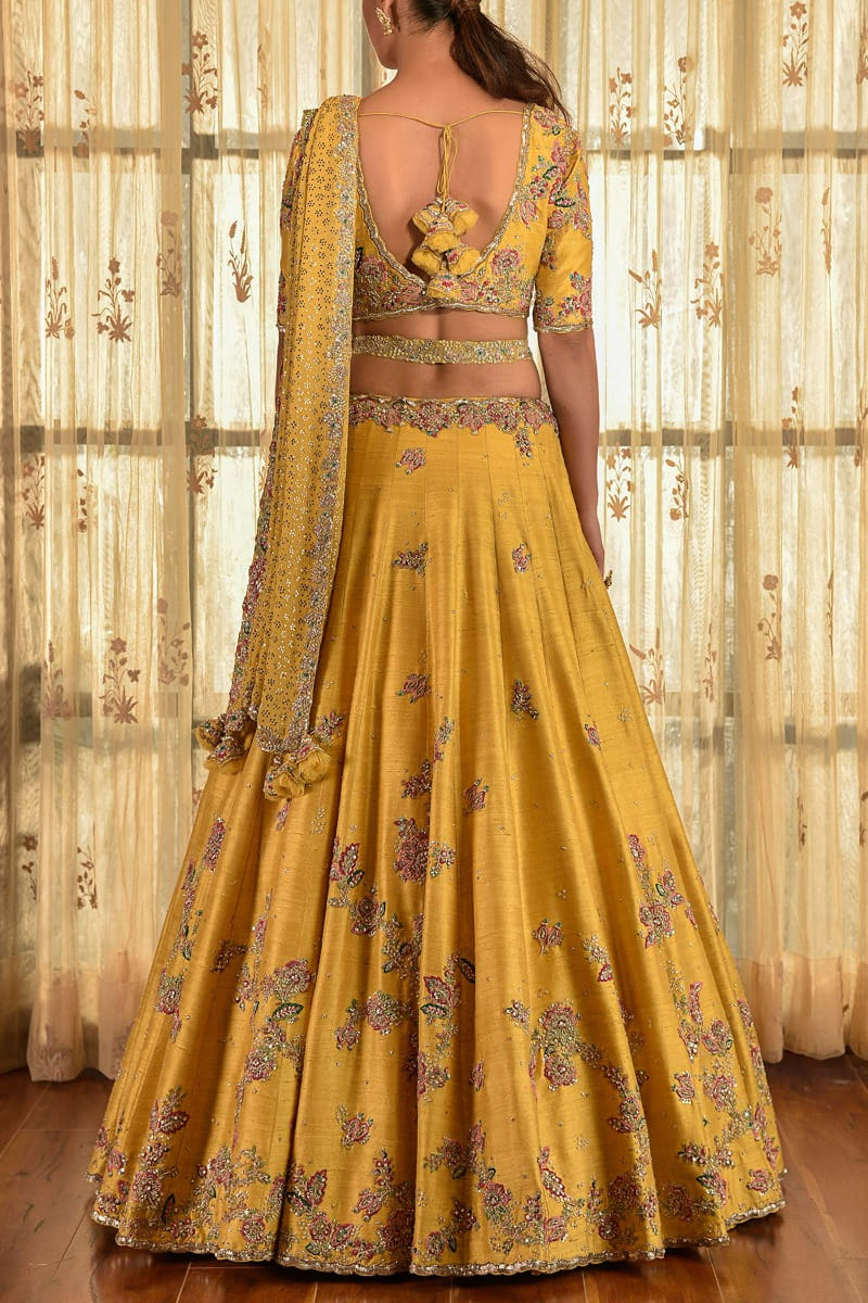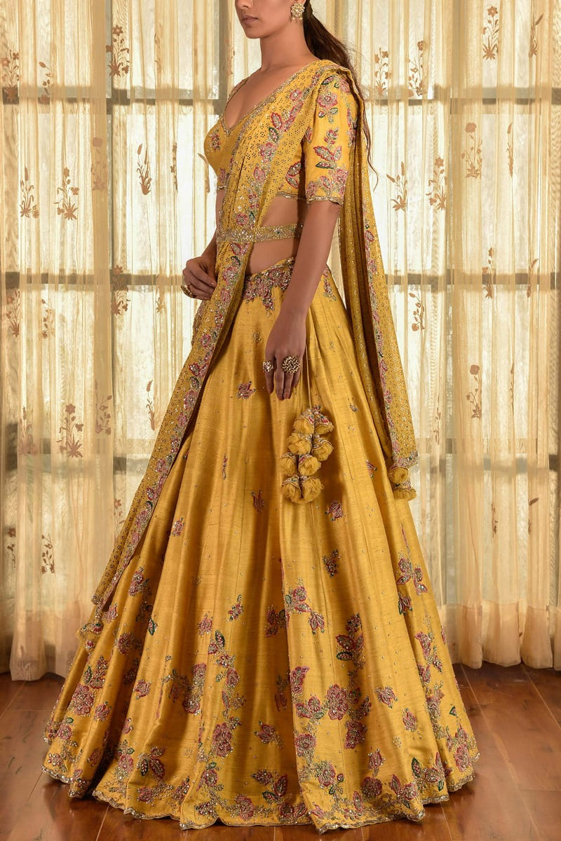 Dolly J designs this raw silk kalidar lehenga set with Parsi and zardozi embroidery, complementing the look with a chiffon kamdani jaal embroidered dupatta. Style the look with drop earrings and a maang tikka for a wedding.