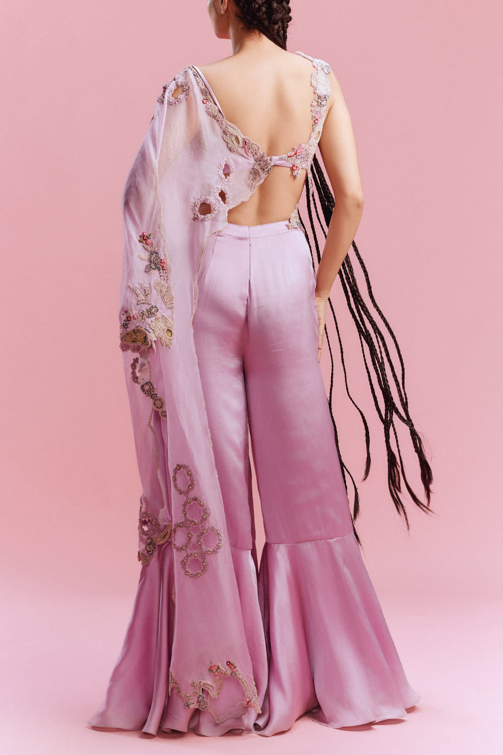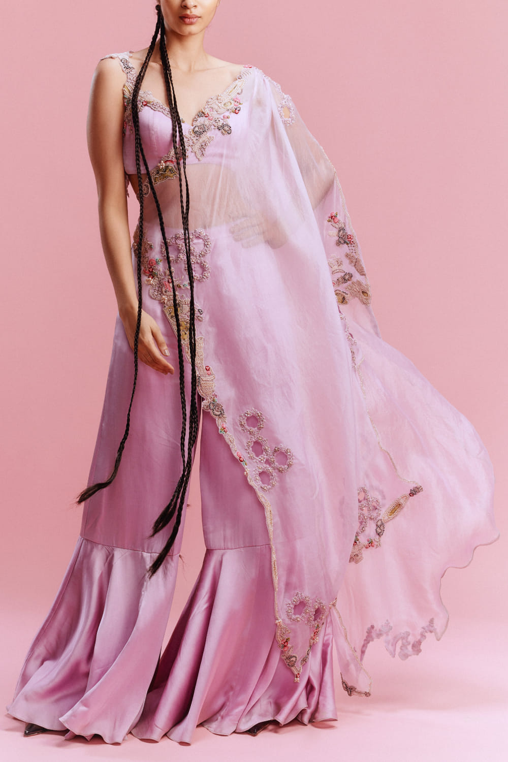 Dolly J designed this distinctive sleeveless blouse crafted in satin with bead and thread embroidery detailing, complementing it with matching godet-flared pants and a matching dupatta. Style the look with embellished chandbalis and a bucket bag for an occasion.