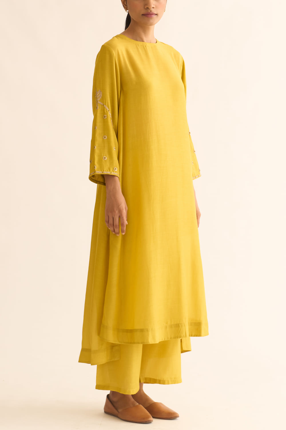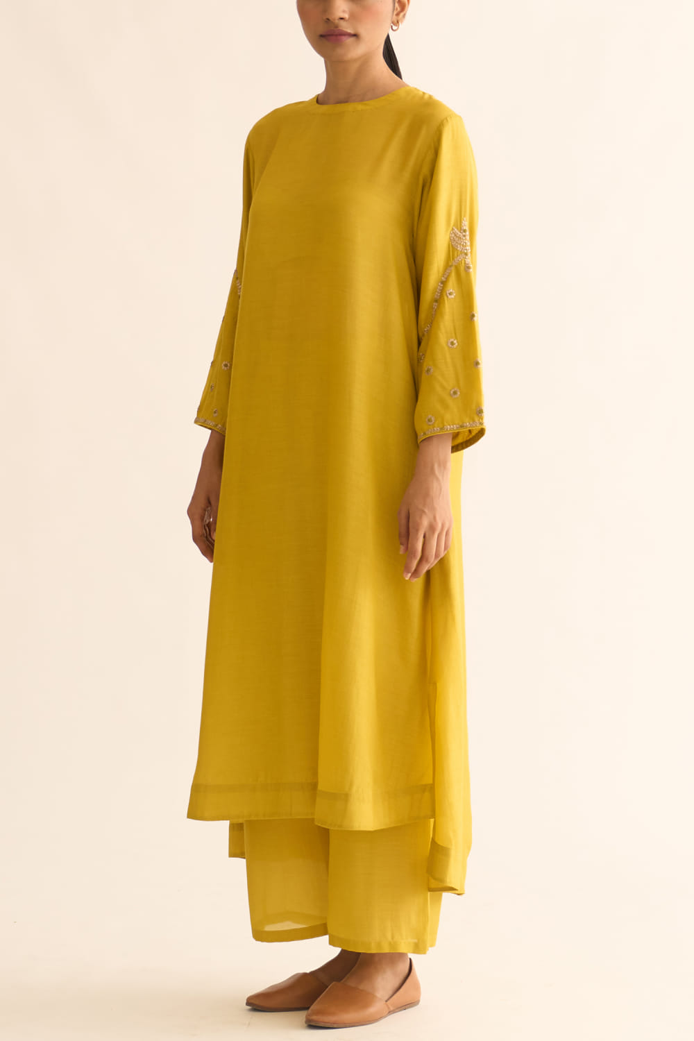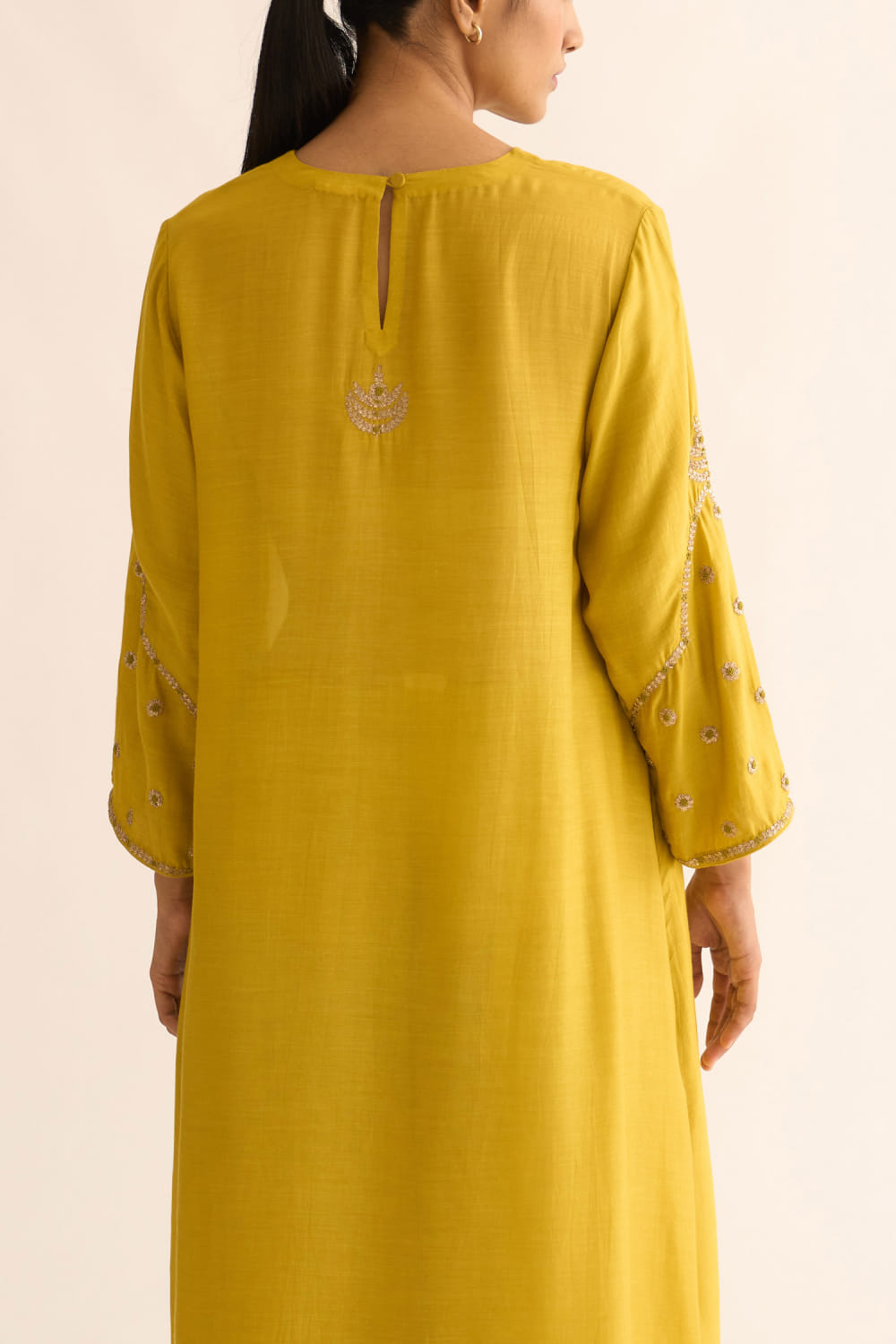 DOT designs this festive kurta in cotton silk customised with pitta and resham french knot embroidery on the sleeves and back, teamed with a pair of matching pants. Style the look with kundan embellished earrings and kolhapuri wedges.