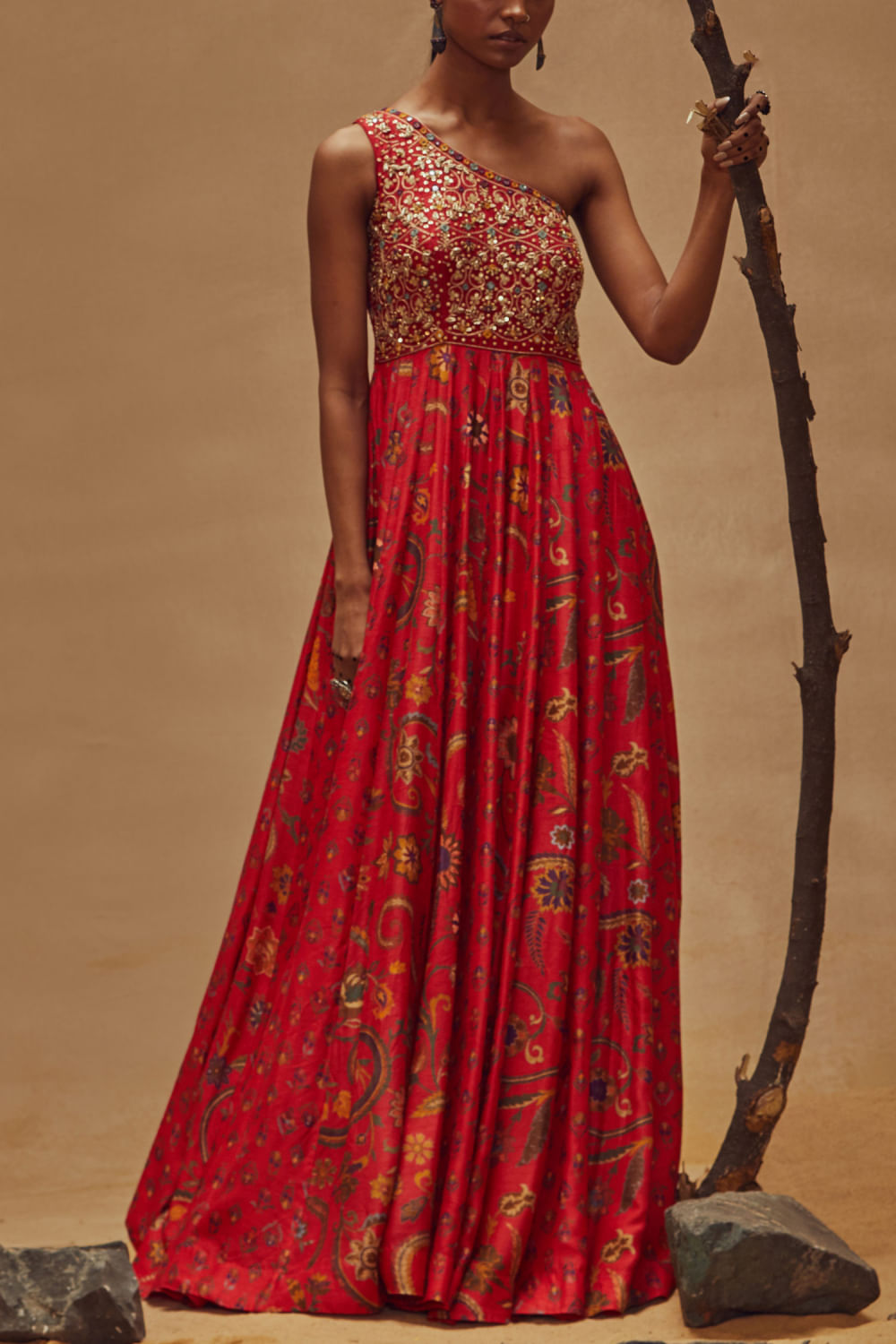 Drishti & Zahabia designs this one-shoulder maxi dress with artsy prints and embroidered detailing. Style the look with metallic stilettos and an embroidered clutch.