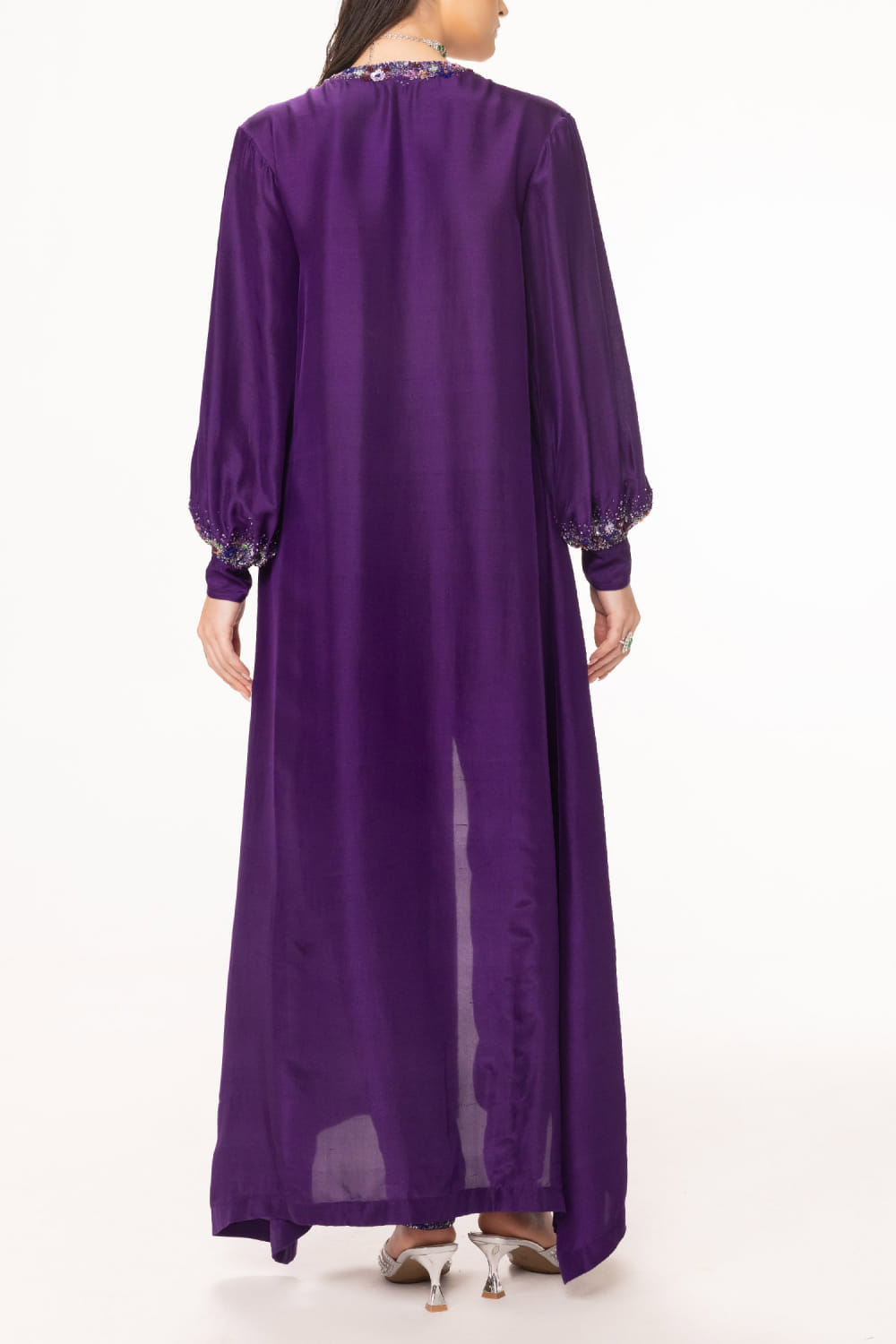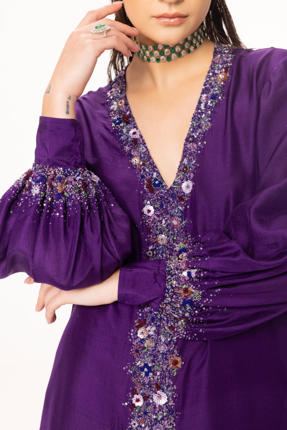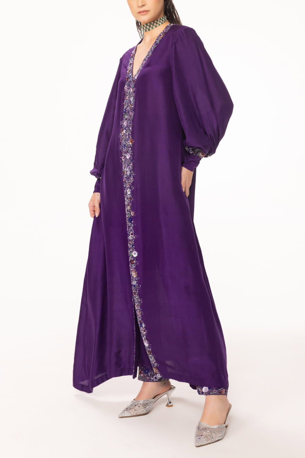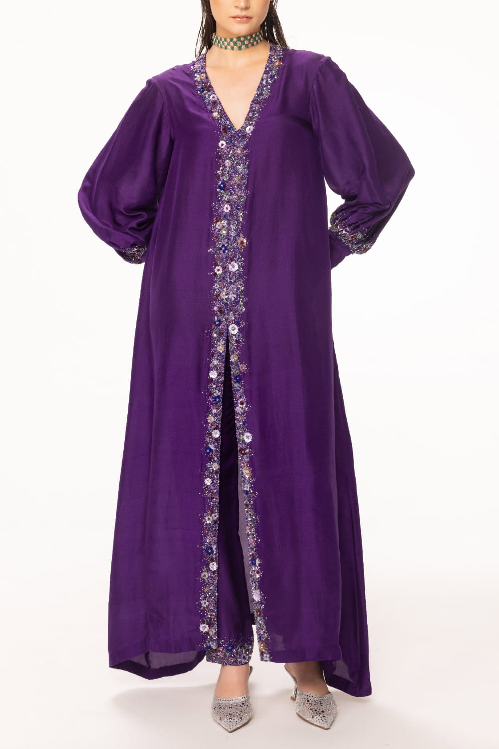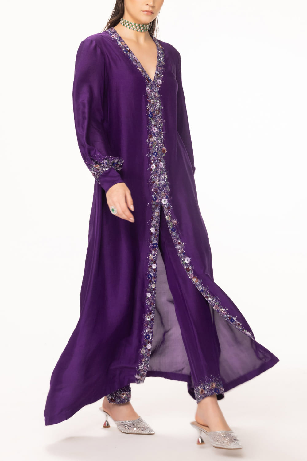 EEKSHA designs this alluring kurta customised in silk georgette with sequin, cutdana and bead embellishments in floral placement patterns featuring a central slit, teaming it with matching pants. Style the look with embellished hoops and a pendant necklace.
