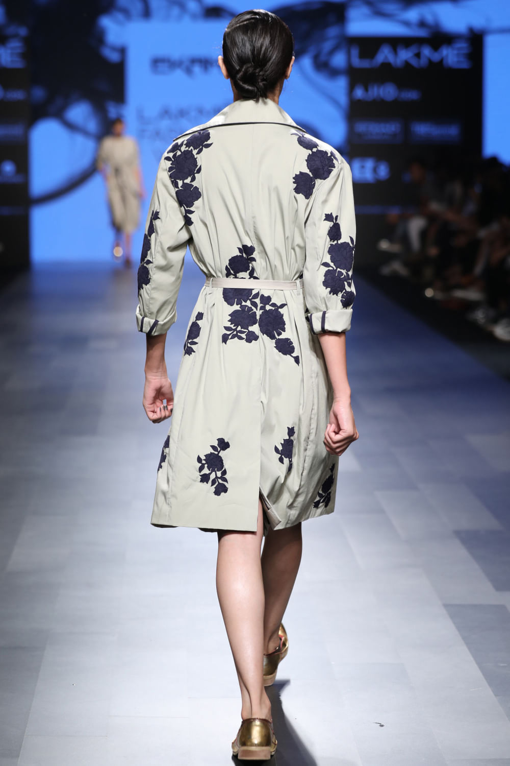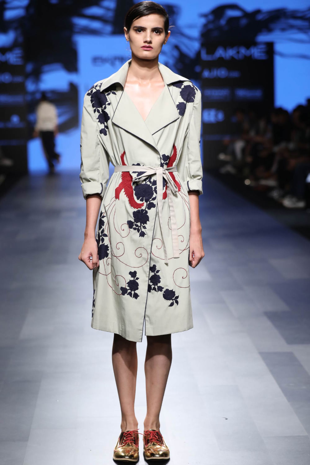Ekam's ethnic take on the classic trench coat is refreshing for the eyes with its birds and bunches embroidery.