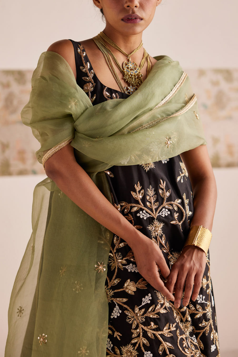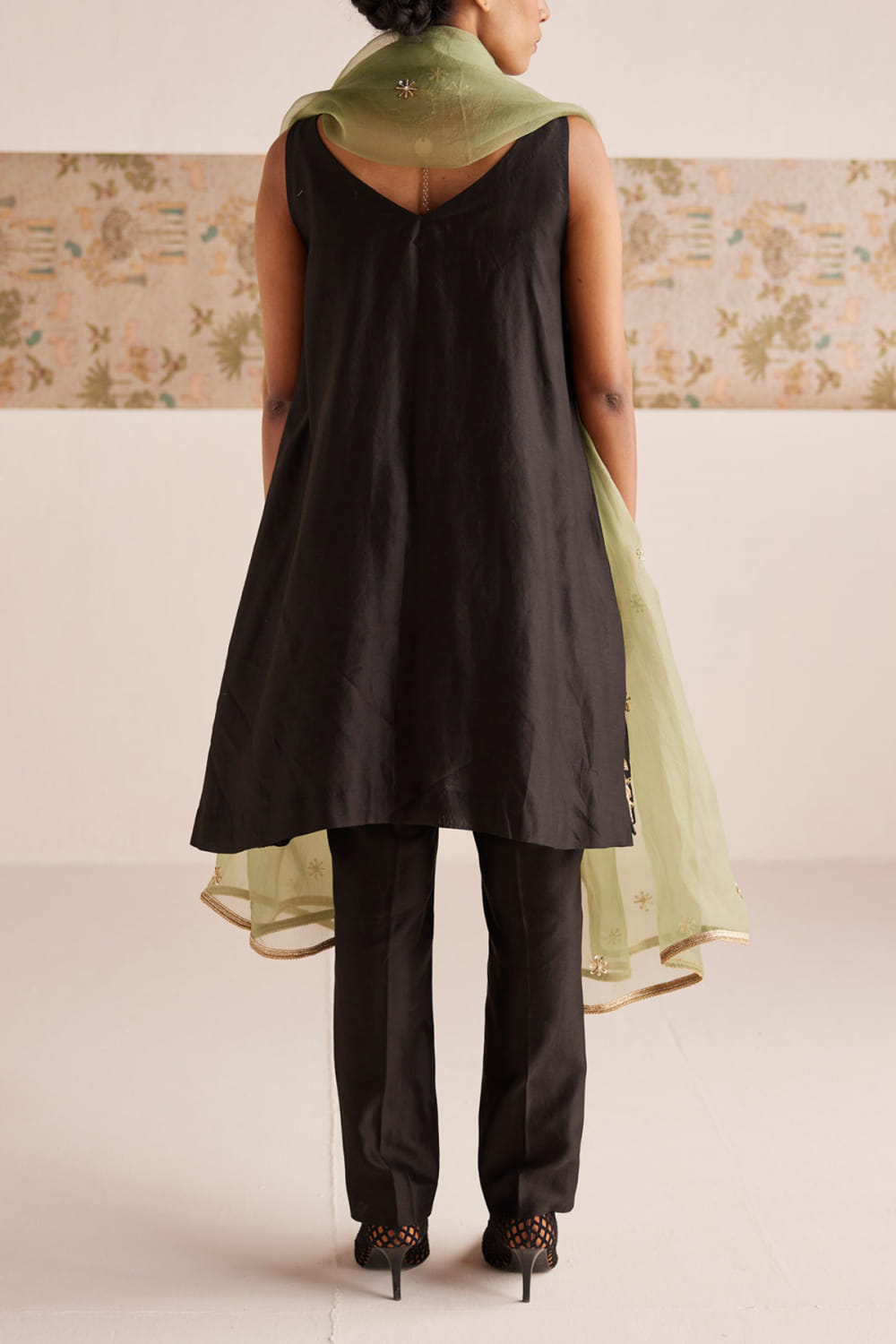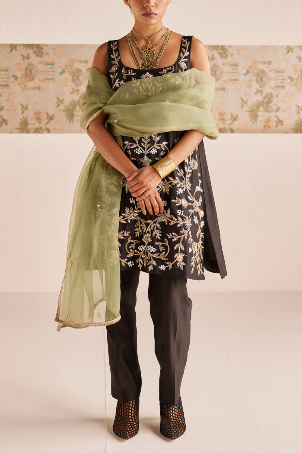 Esha Arora designs this captivating A-line kurta crafted in chanderi silk with intricate zardozi motif embroidery detailing in a floral pattern, completing the look with a pair of pants and a contrasting dupatta. Style the look with a pair of chandbalis and bangles for a vibrant look.