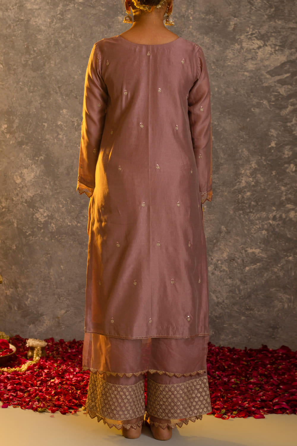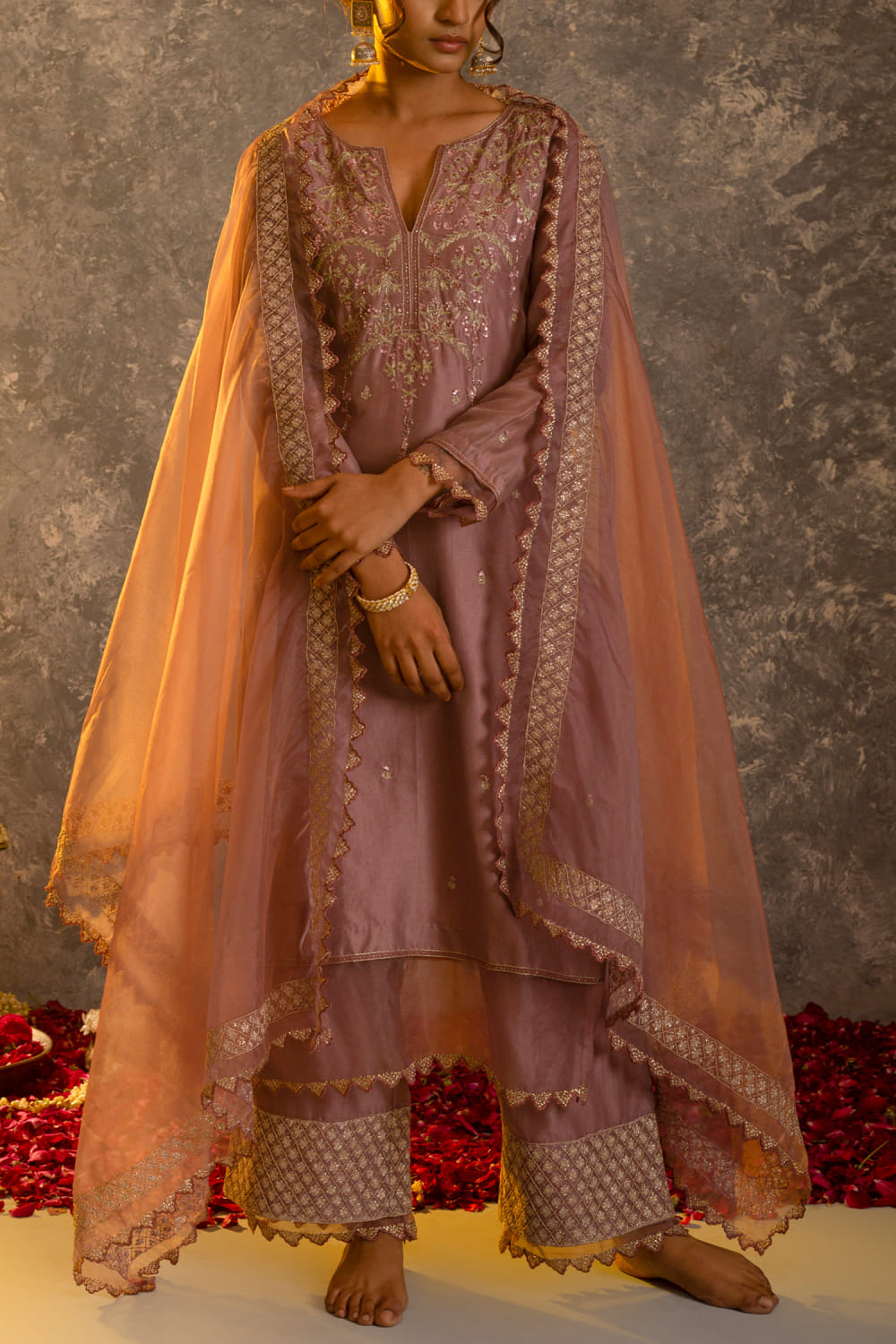 Glittire by Sakshi Verma designs this limelight-stealing kurta in chanderi silk with zari and sequin embroidery detailing featuring an edgy finish, teamed with a matching palazzo and an organza dupatta. Style the look with a pair of embellished jhumkas and bracelet for the ceremony.
