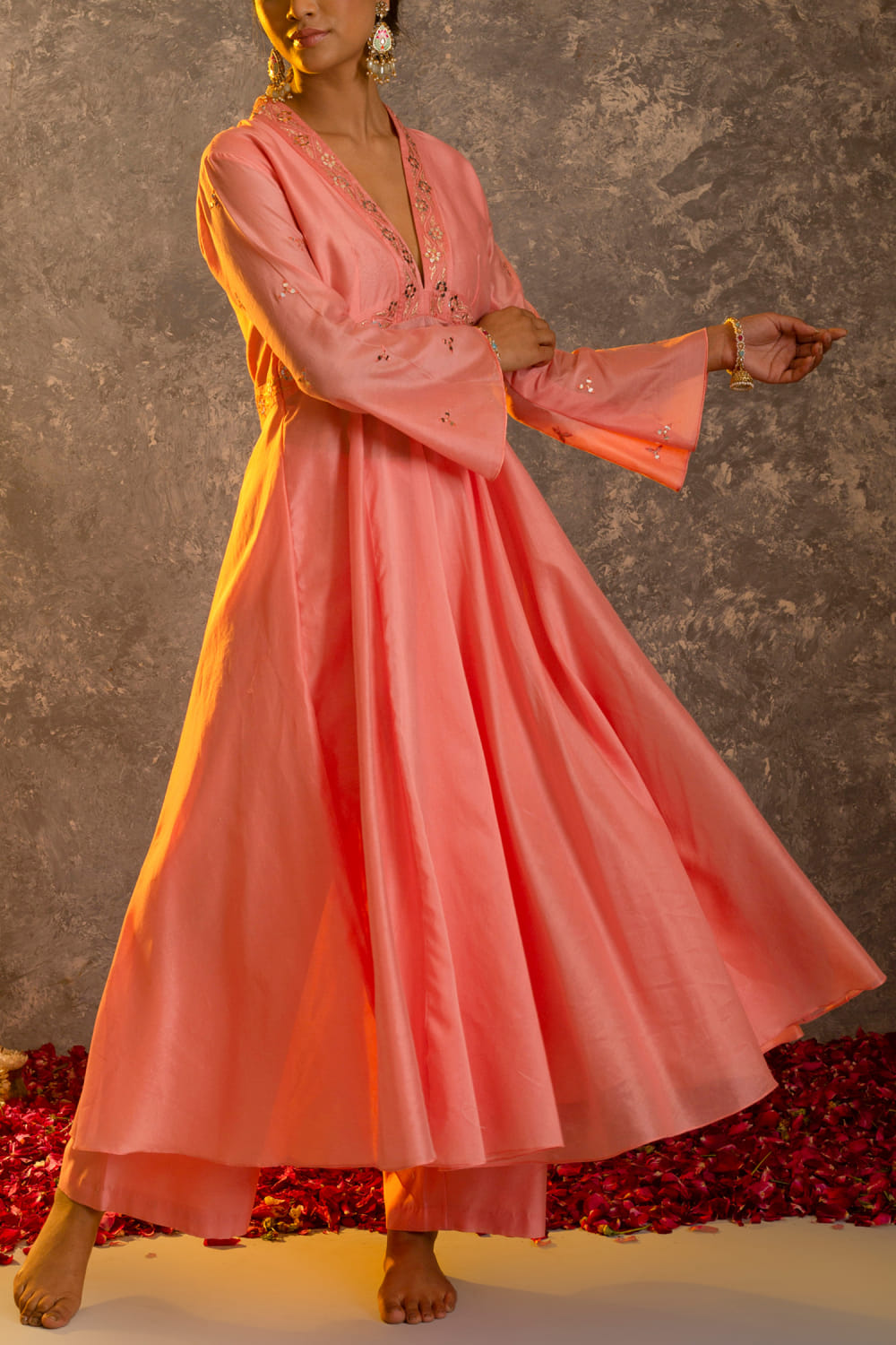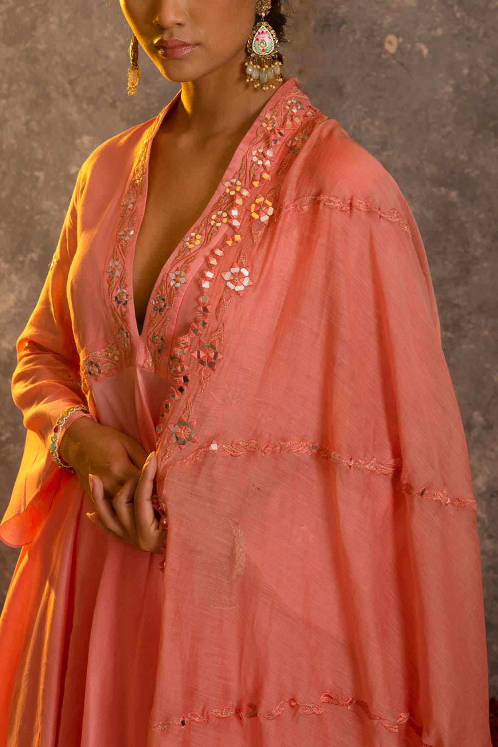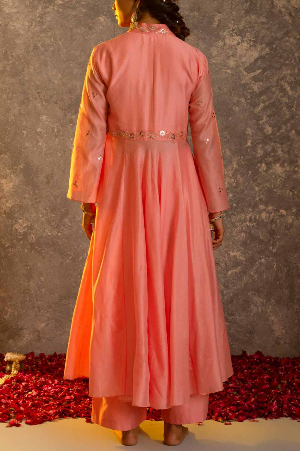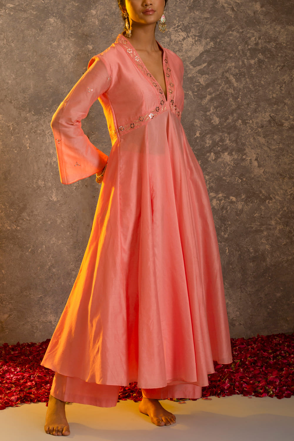 Glittire by Sakshi Verma designs this charming kurta in chanderi silk with mirror work and resham embroidery highlights featuring a twirl-worthy silhouette, paired with a matching palazzo and a dupatta. Style the look with pearl chandbalis and nude stilettoes for a sober appearance.
