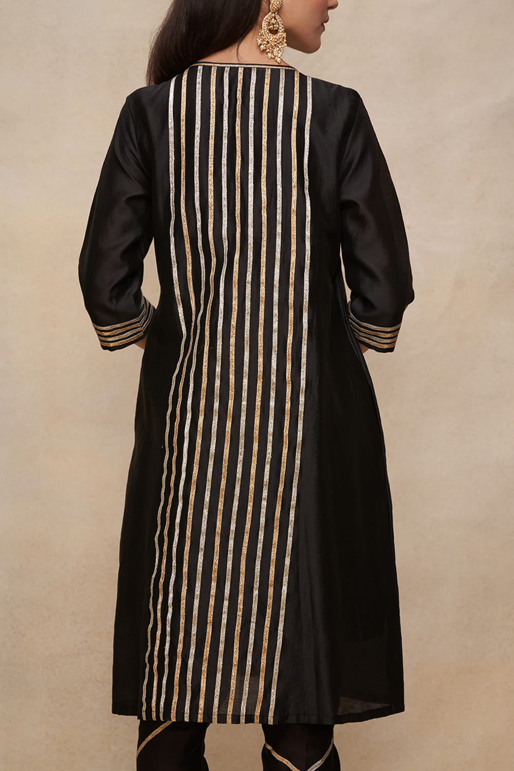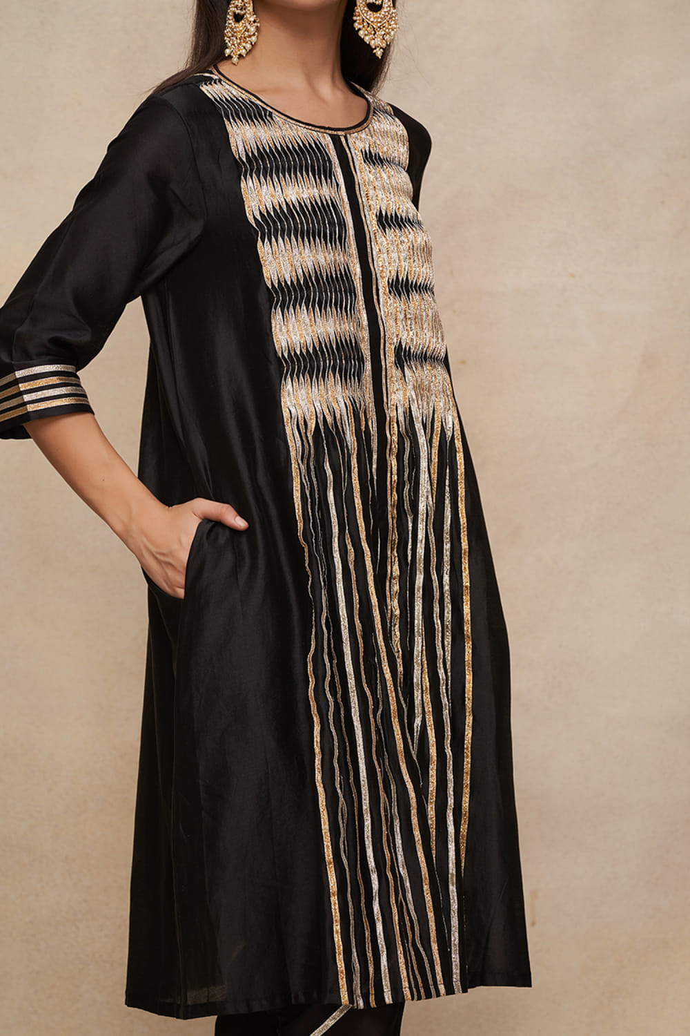 Gulabo by Abu Sandeep designs this festive-ready kurta customised in chanderi with gota work, gathered and pleated detailing. Style it with a palazzo and mules. The pants here are shown for styling purposes only.