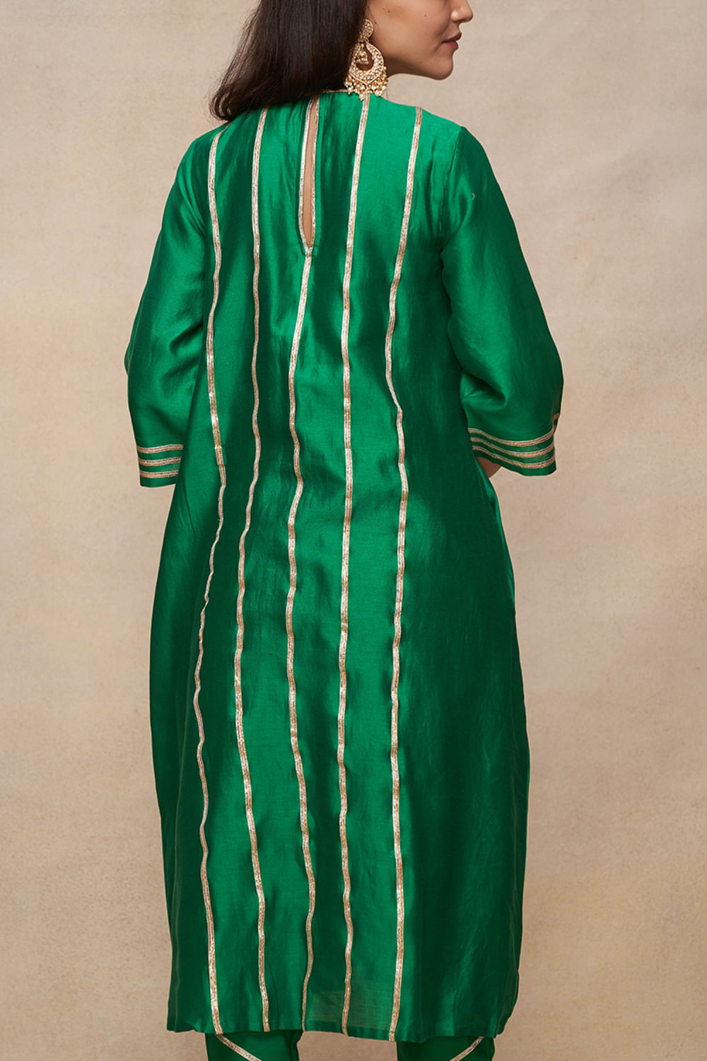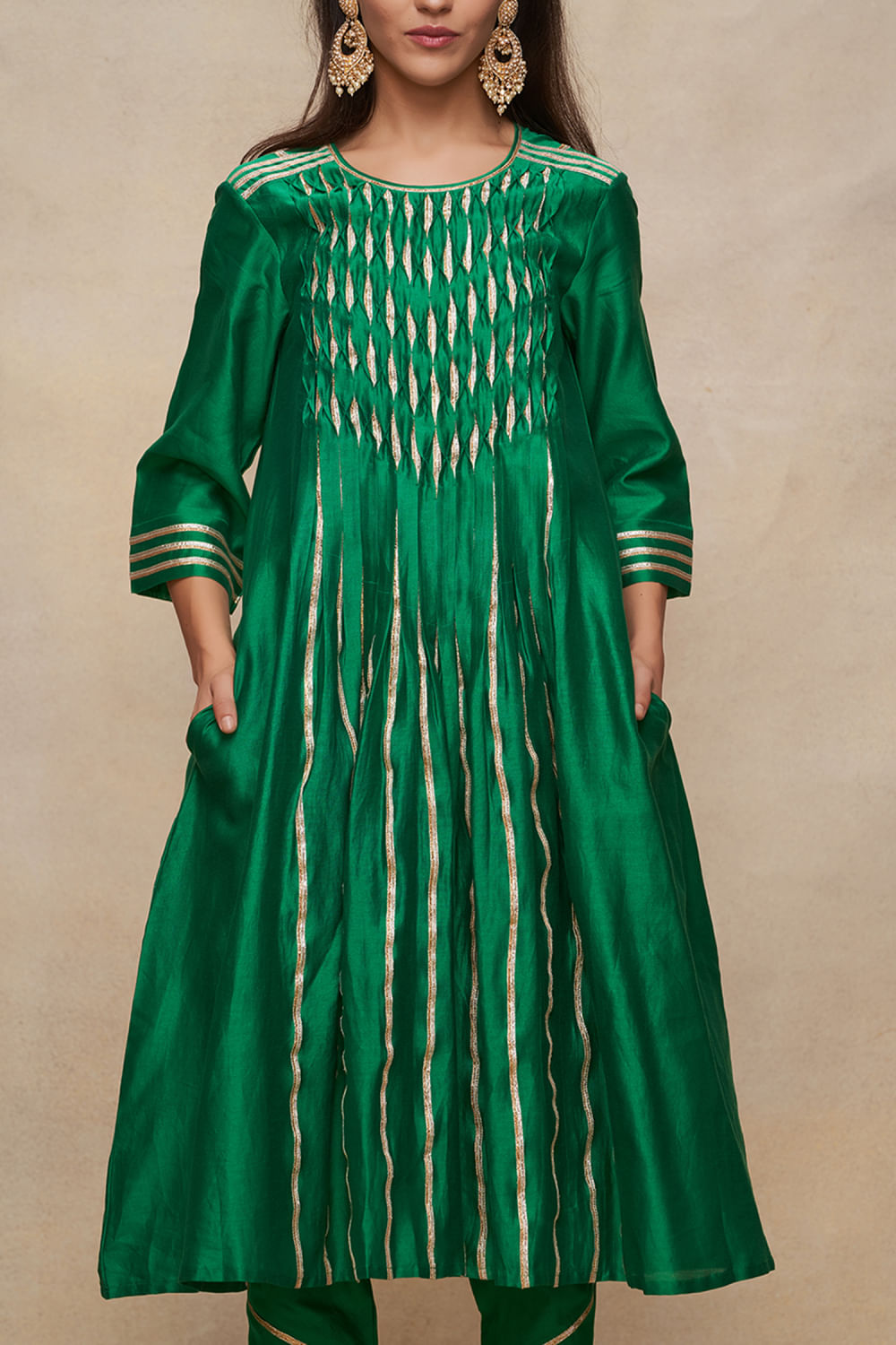 Gulabo by Abu Sandeep designs this vivid kurta in chanderi enriched with gota work and pleated detailing in a flared silhouette. Style it with a palazzo and an embellished ring for a striking look. The pants here are shown for styling purposes only.