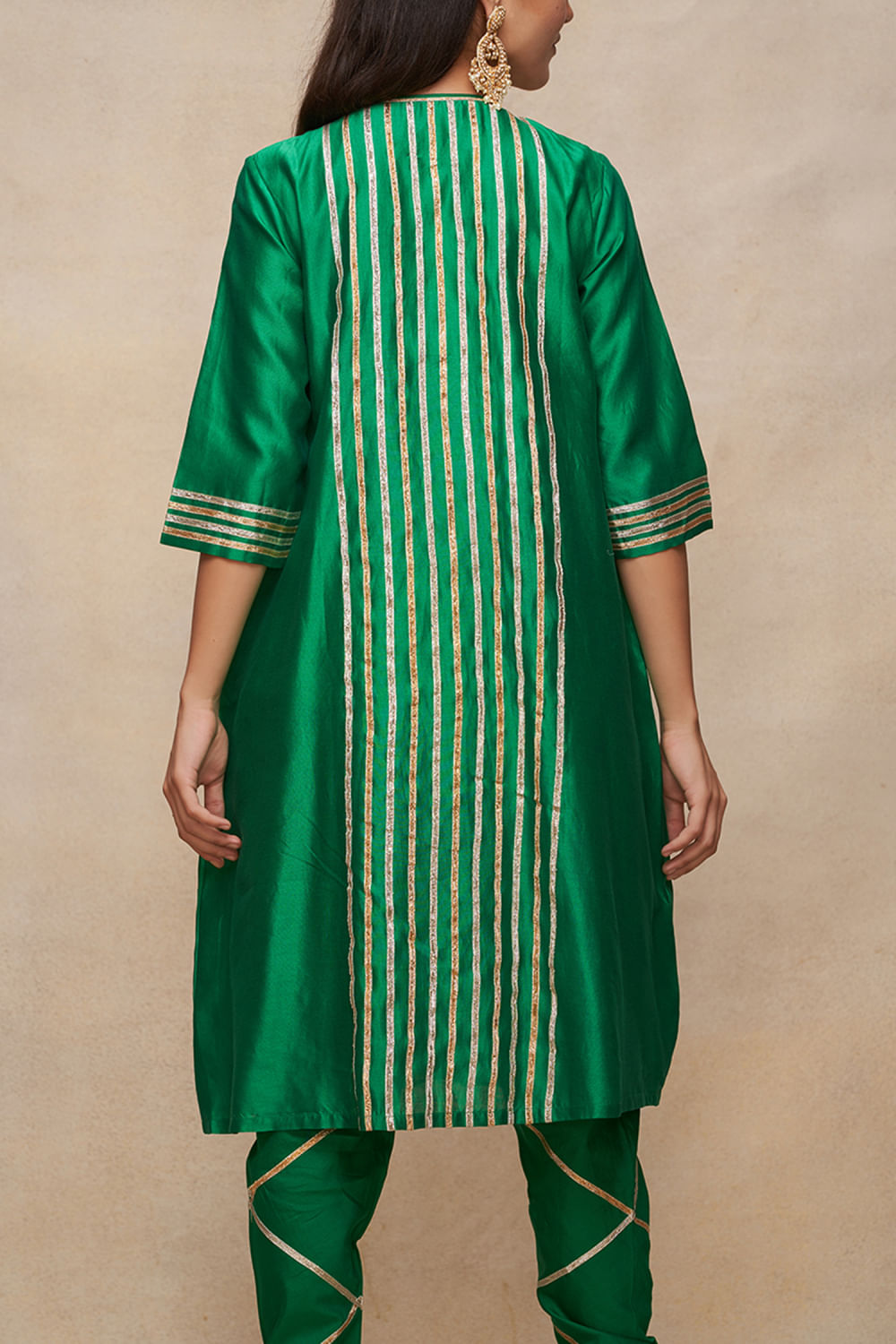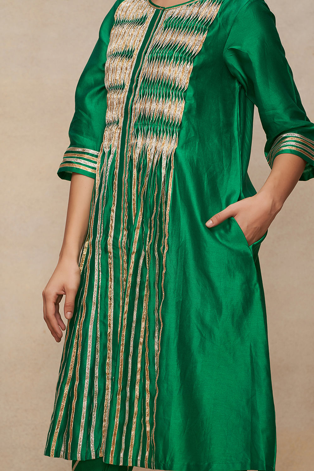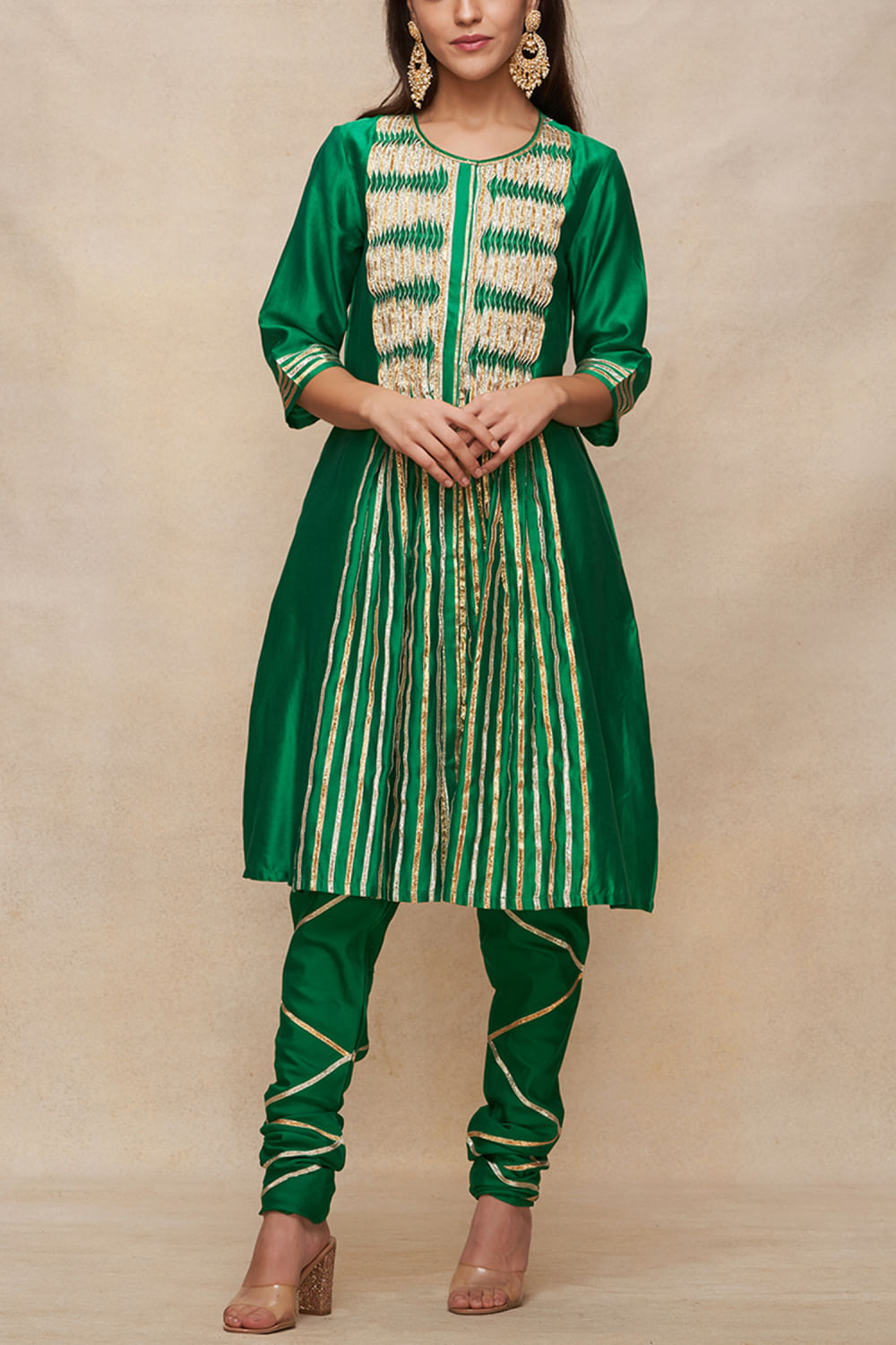 Gulabo by Abu Sandeep designs this vibrant kurta embraced in chanderi with gota work, gathered and pleated detailing. Style it with kundan earrings and flared pants for a pre-wedding occasion. The pants and dupatta here are shown for styling purposes only.