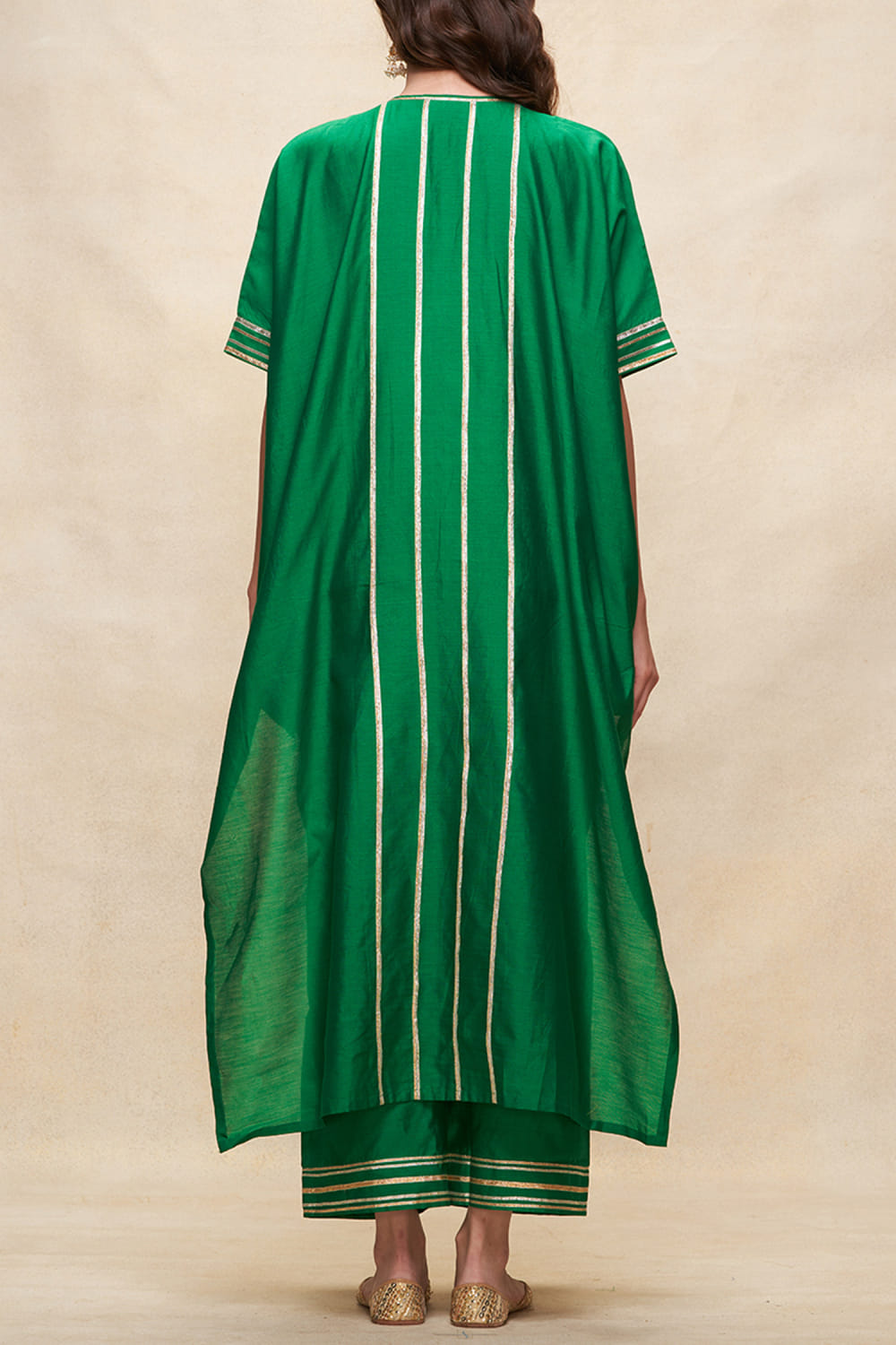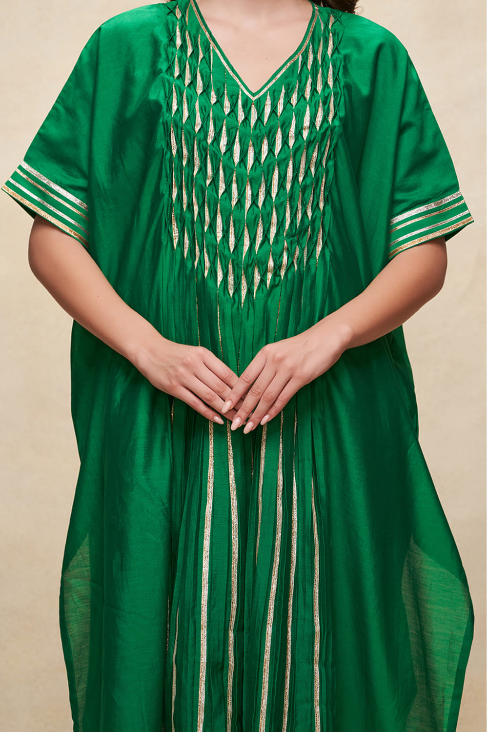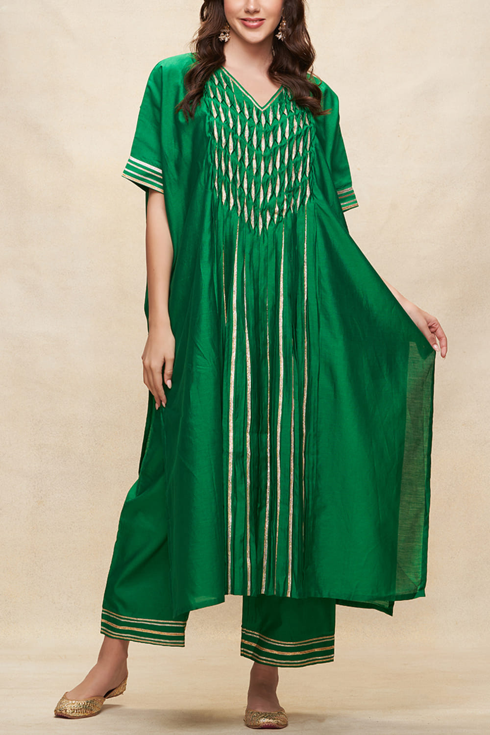 Gulabo by Abu Sandeep designs this contemporary kaftan-style kurta rendered in chanderi with a V-neck, gota work and pleated detailing in an oversized fit. Style it with an ear cuff and broad pants. The pants here are shown for styling purposes only.