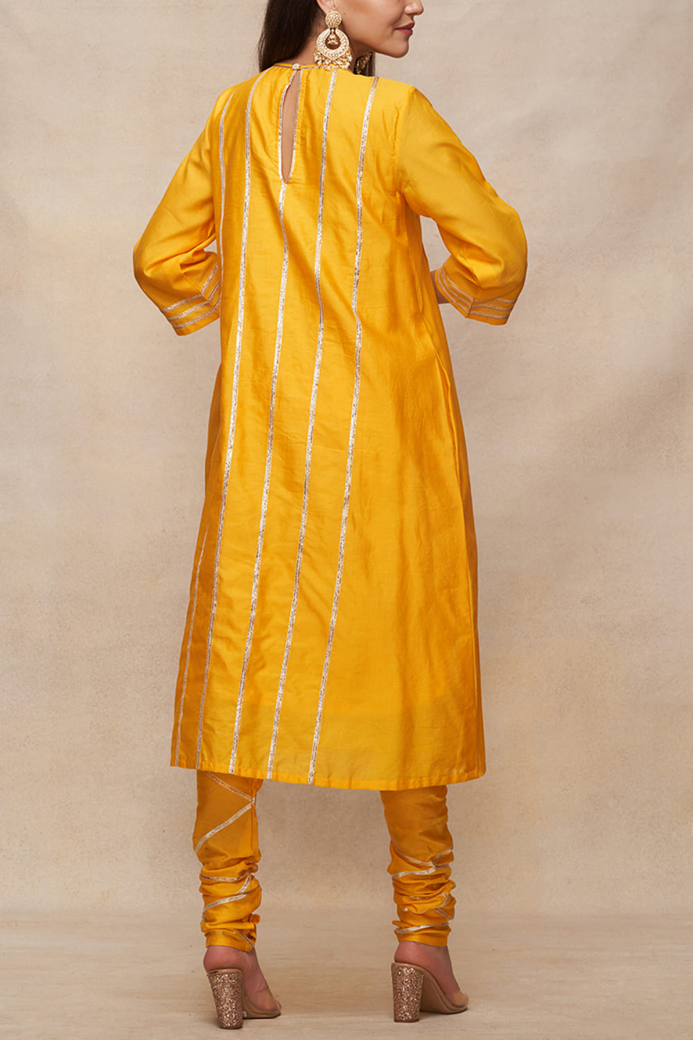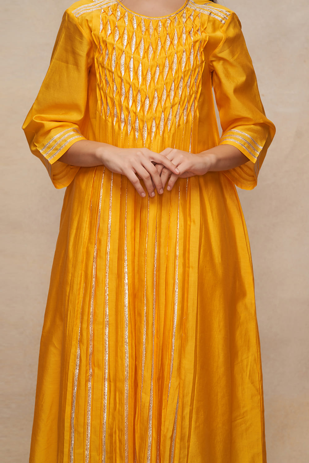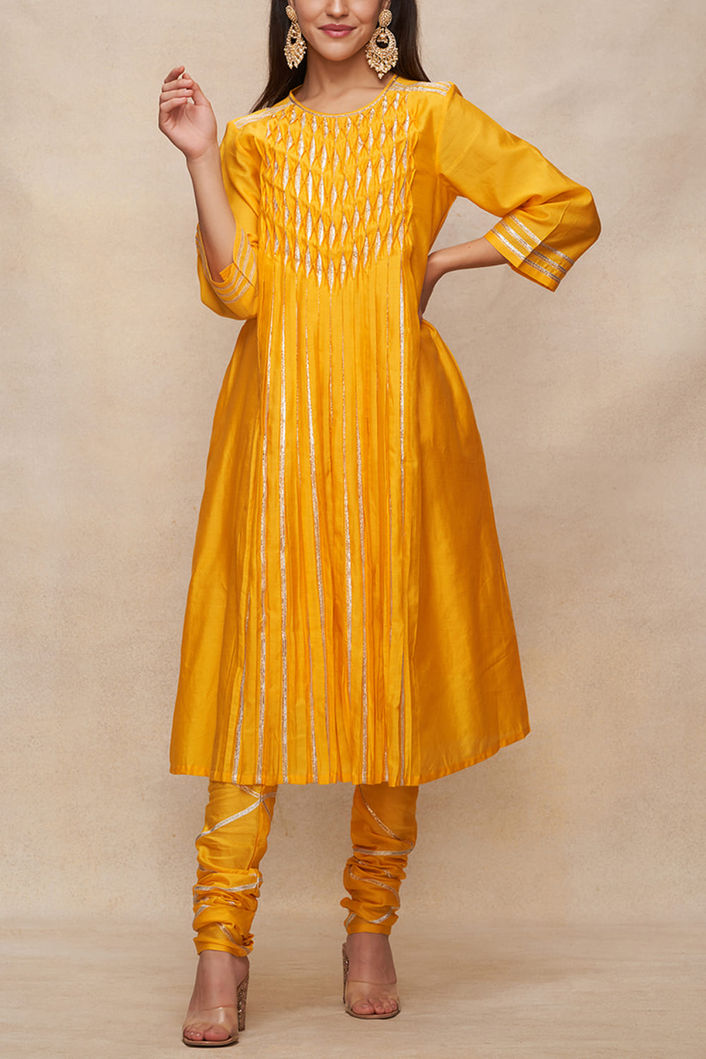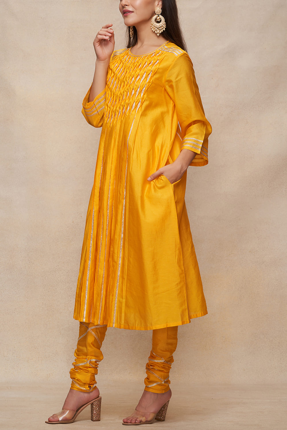 Gulabo by Abu Sandeep designs this captivating kurta in chanderi encapsulated with gota work and pleated detailing in a flared silhouette. Style it with a churidar and dupatta for a festive look. The pants here are shown for styling purposes only.