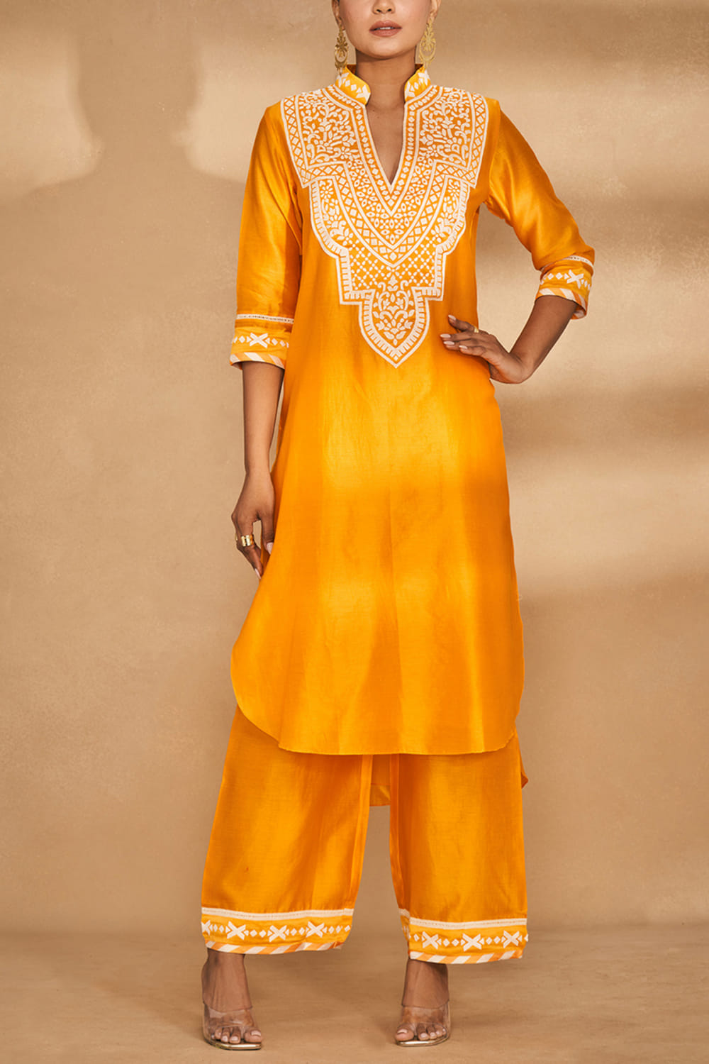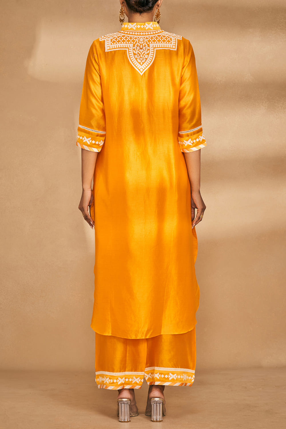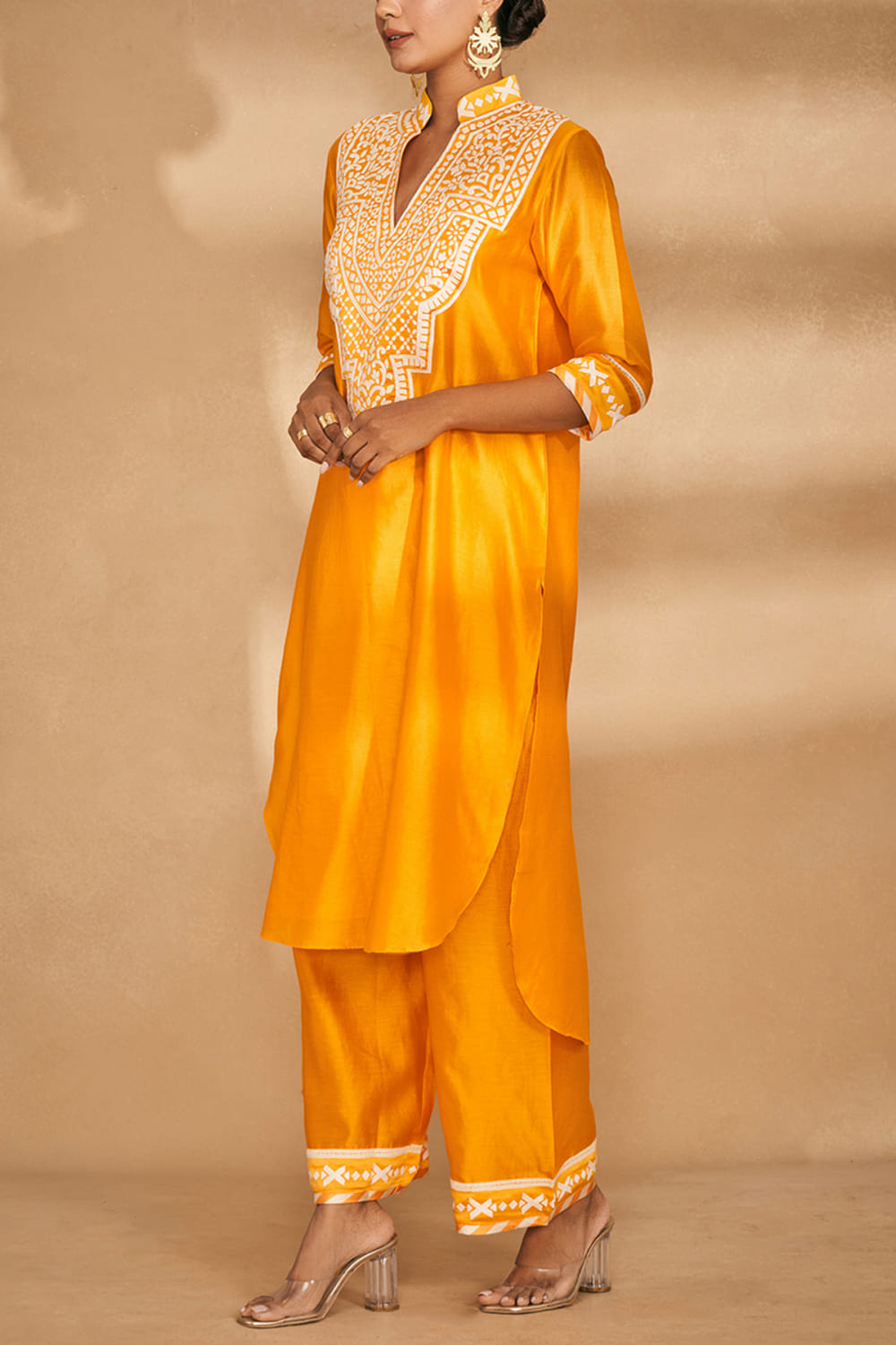 Gulabo by Abu Sandeep designs this statement-making kurta embraced in chanderi with a collar, intricate applique work, lace detailing and a rounded high-low hem in an A-line silhouette. Style it with oxidised jhumkas and palazzo for wedding festivities. The pants here are shown for styling purposes only.