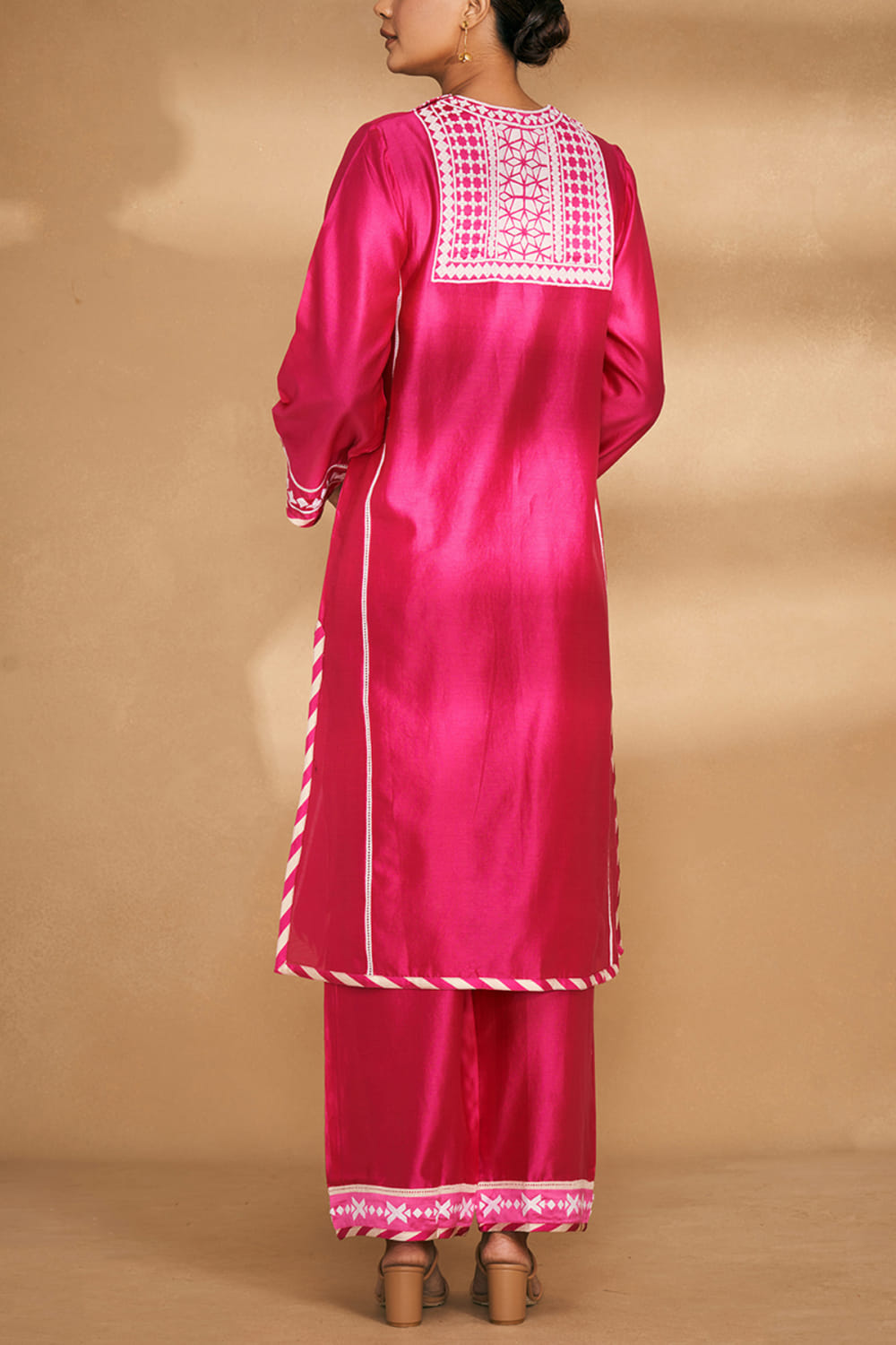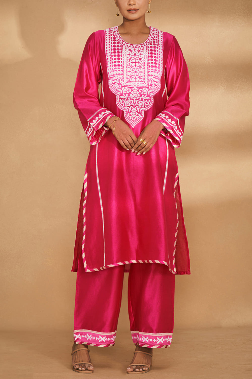Gulabo by Abu Sandeep designs this traditional kurta rendered in chanderi with intricate applique work and lace detailing in an A-line silhouette. Style it with straight pants and chandbaalis for pre-wedding festivities. The pants here are shown for styling purposes only.
