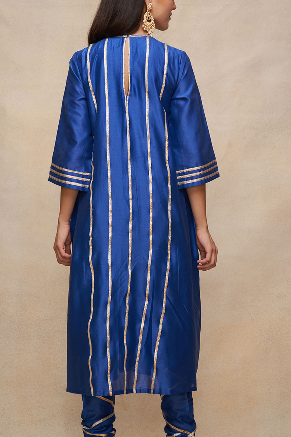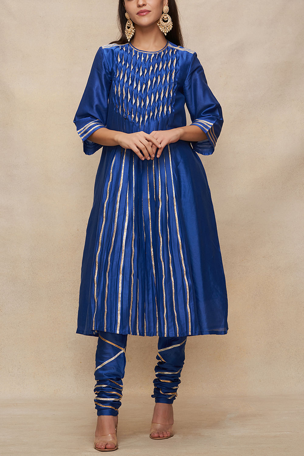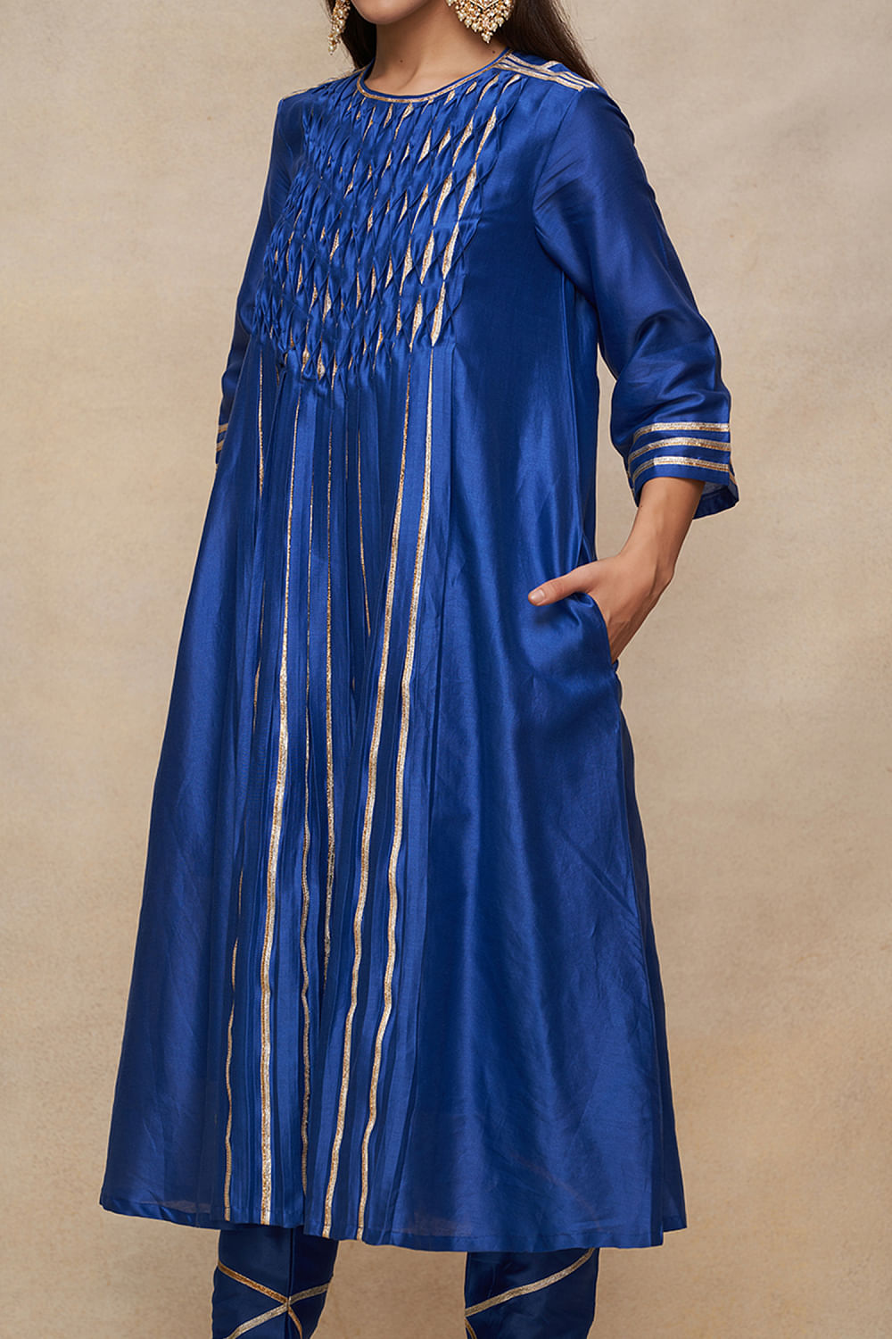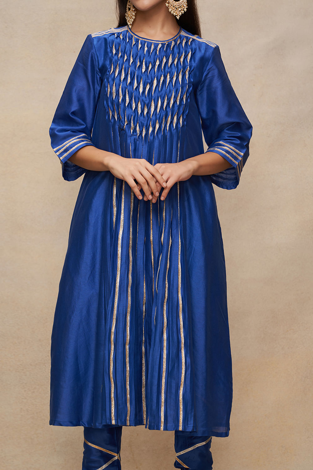 Gulabo by Abu Sandeep designs this statement-making kurta in chanderi enriched with gota work and pleated detailing in a flared silhouette. Style it with straight pants and polki earrings for a classic look. The pants here are shown for styling purposes only.
