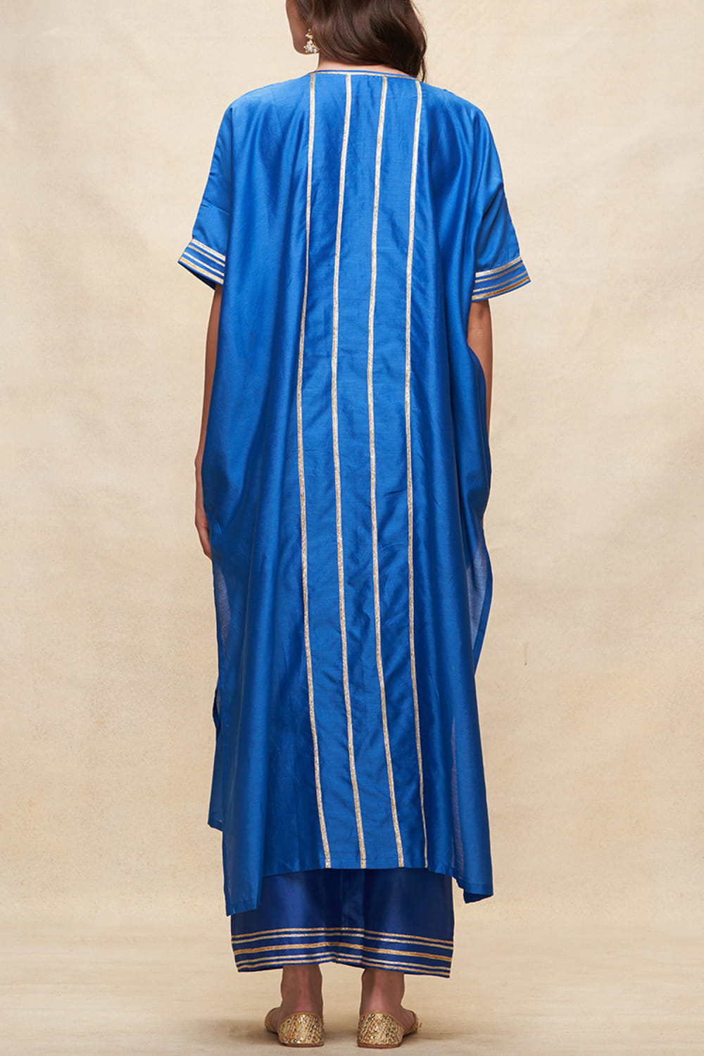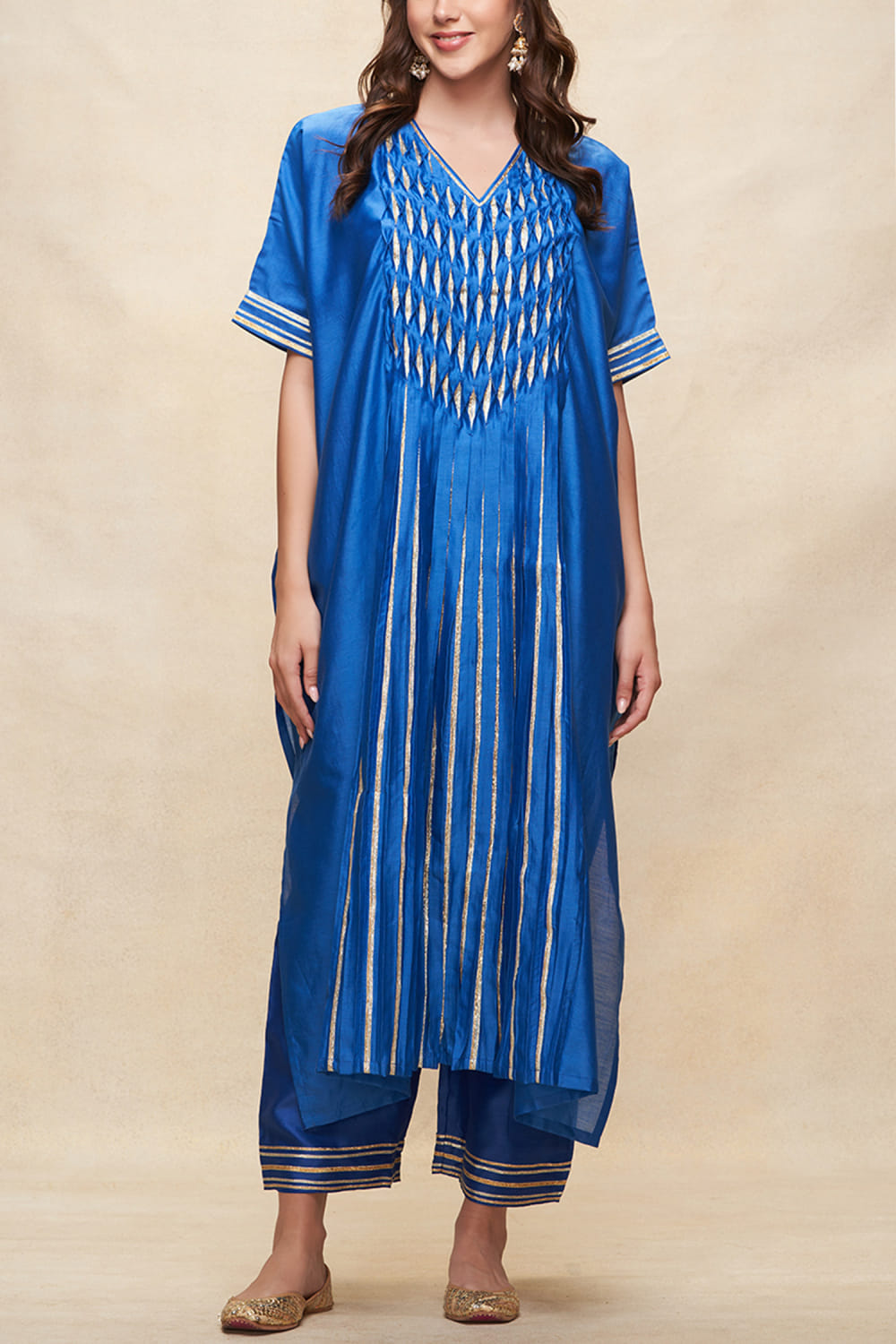 Gulabo by Abu Sandeep designs this dazzling kaftan-style kurta rendered in chanderi with a V-neck, gota work and pleated detailing in an oversized fit. Style it with a palazzo and tassel earrings for a festive soiree. The pants here are shown for styling purposes only.