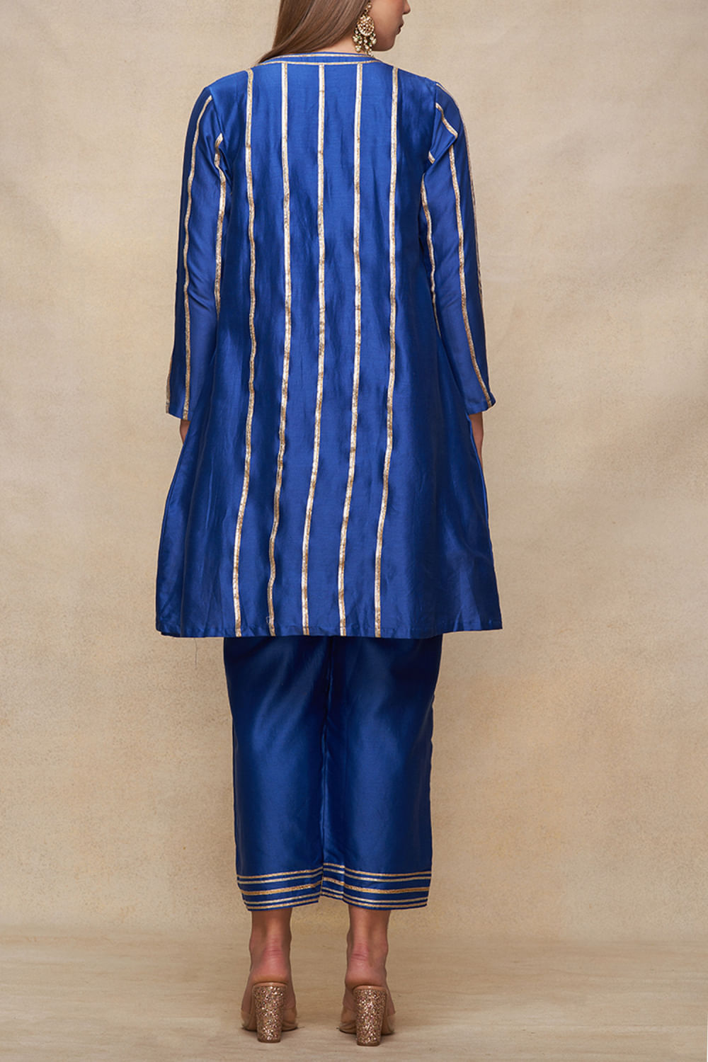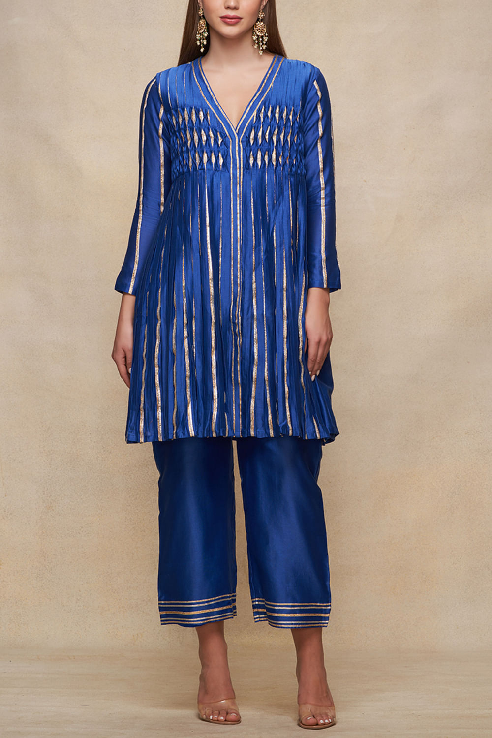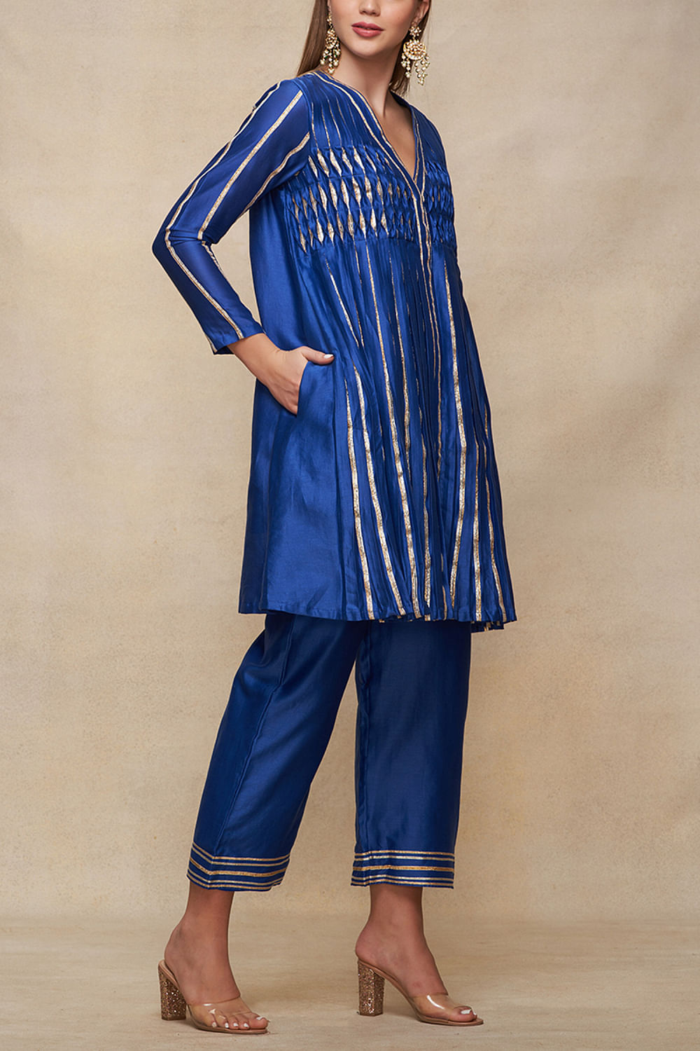 Gulabo by Abu Sandeep designs this striking front-open short kurta crafted in chanderi with a V-neck, full sleeves, gota work and pleated detailing in a flared silhouette. Style it with a skirt and juttis for an occasion. The pants here are shown for styling purposes only.