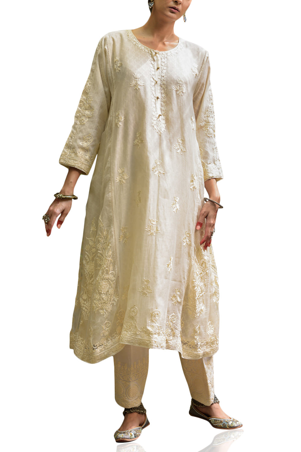 Heena Kochhar designs this timeless chanderi kurta salwar set with muted resham aari work. Style the look with statement earrings.