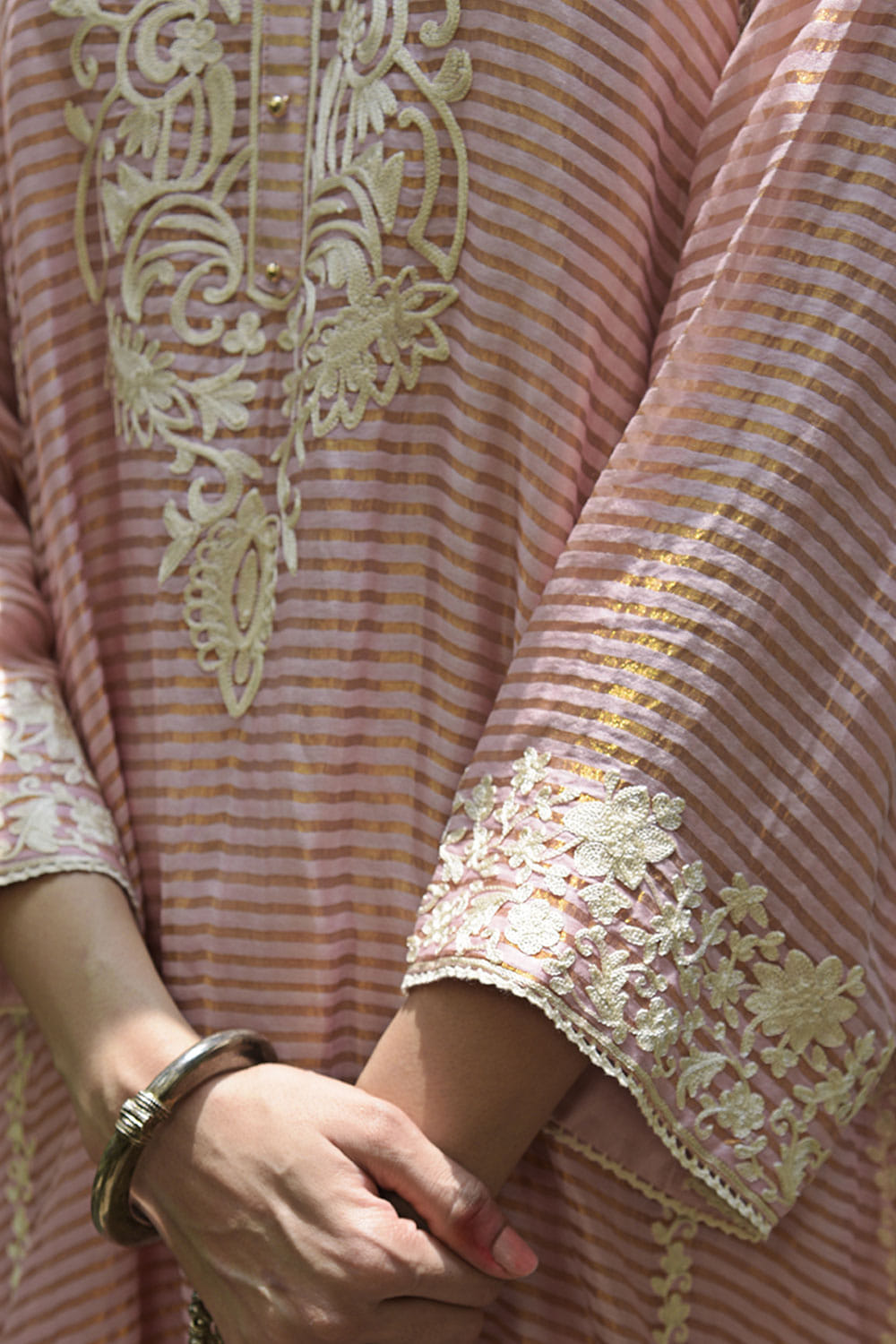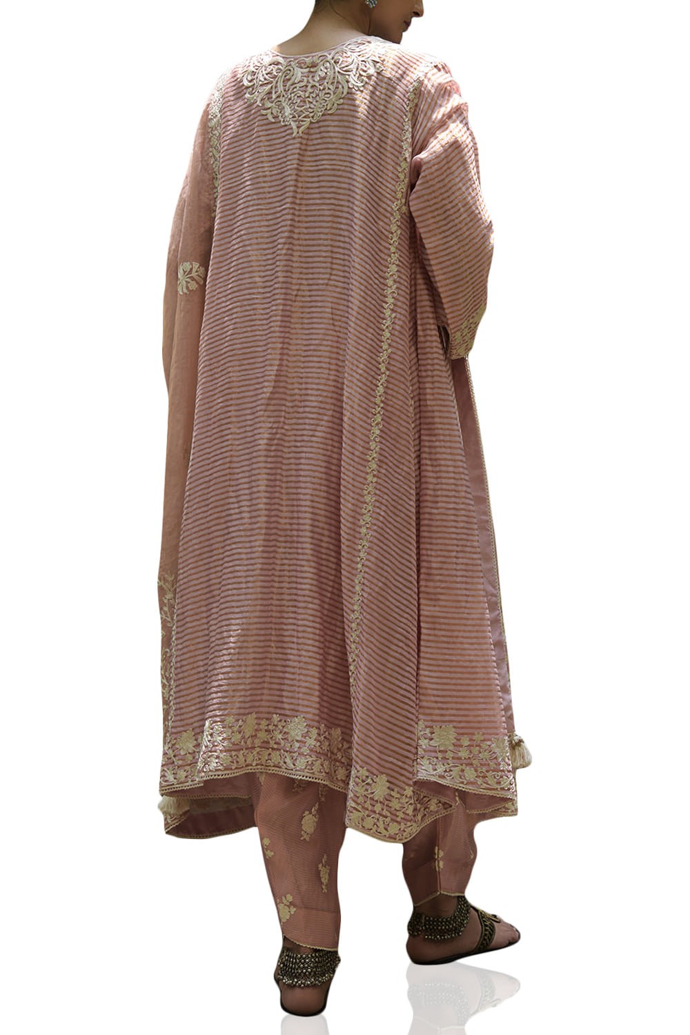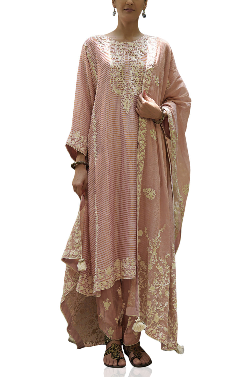 Heena Kochhar designs this classic kurta salwar set in chanderi featuring resham aari work, teamed with tissue dupatta. Style the look with embroidered juttis.