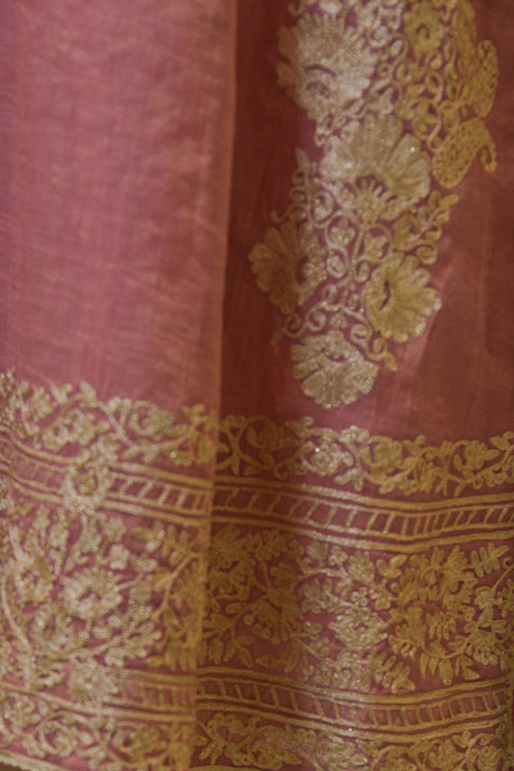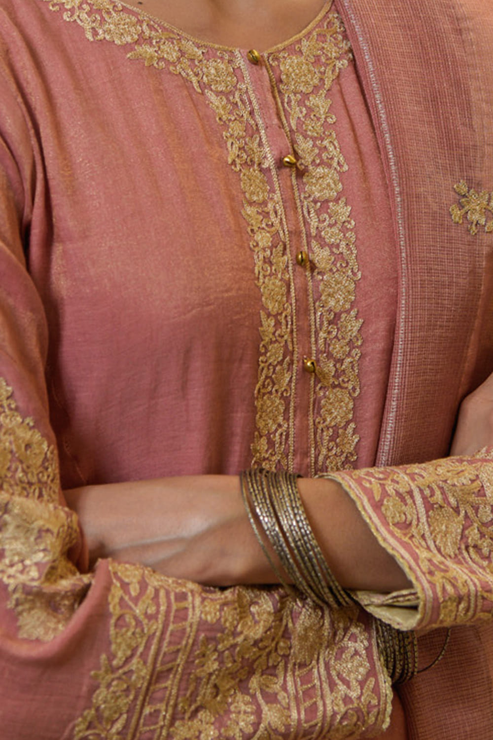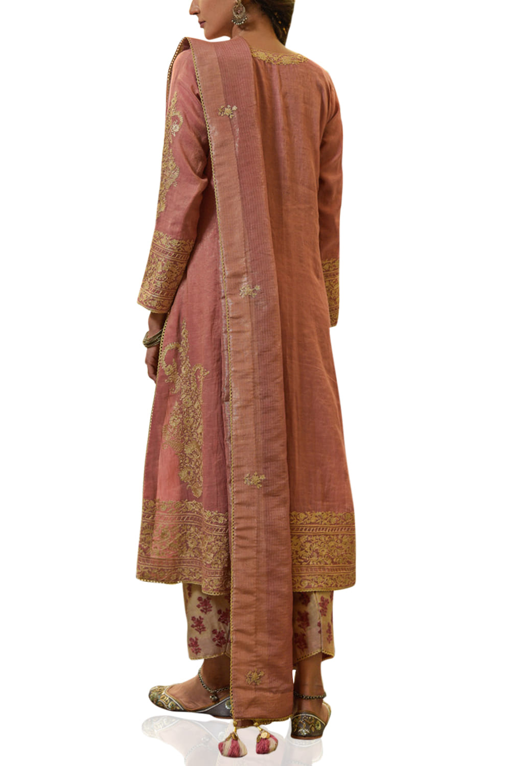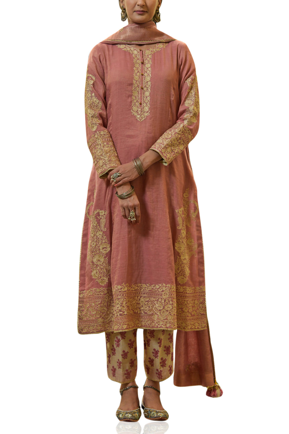 Heena Kochhar designs this classic kurta salwar ensemble customized in tissue featuring aari embroidery, teamed with an embellished dupatta. Style the look with polki jewellery.