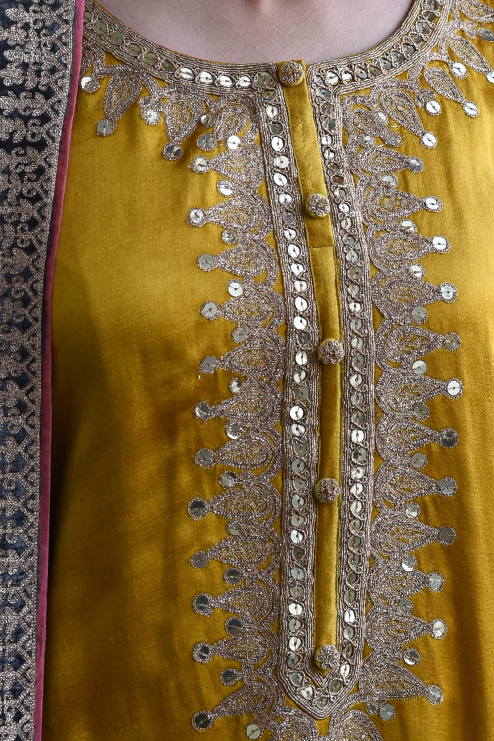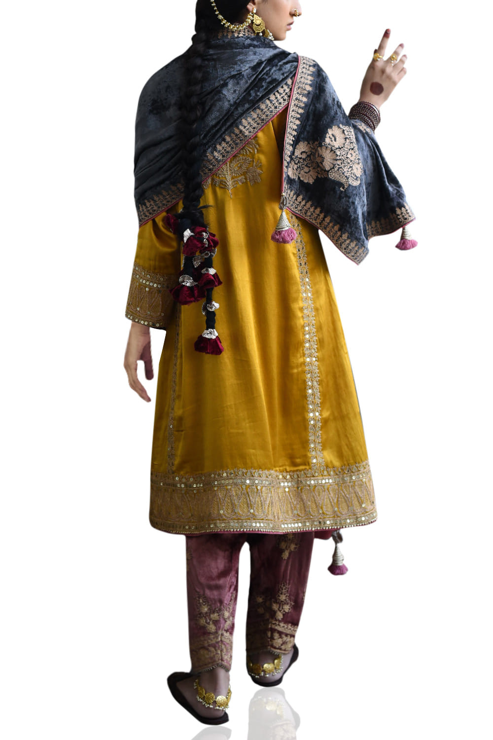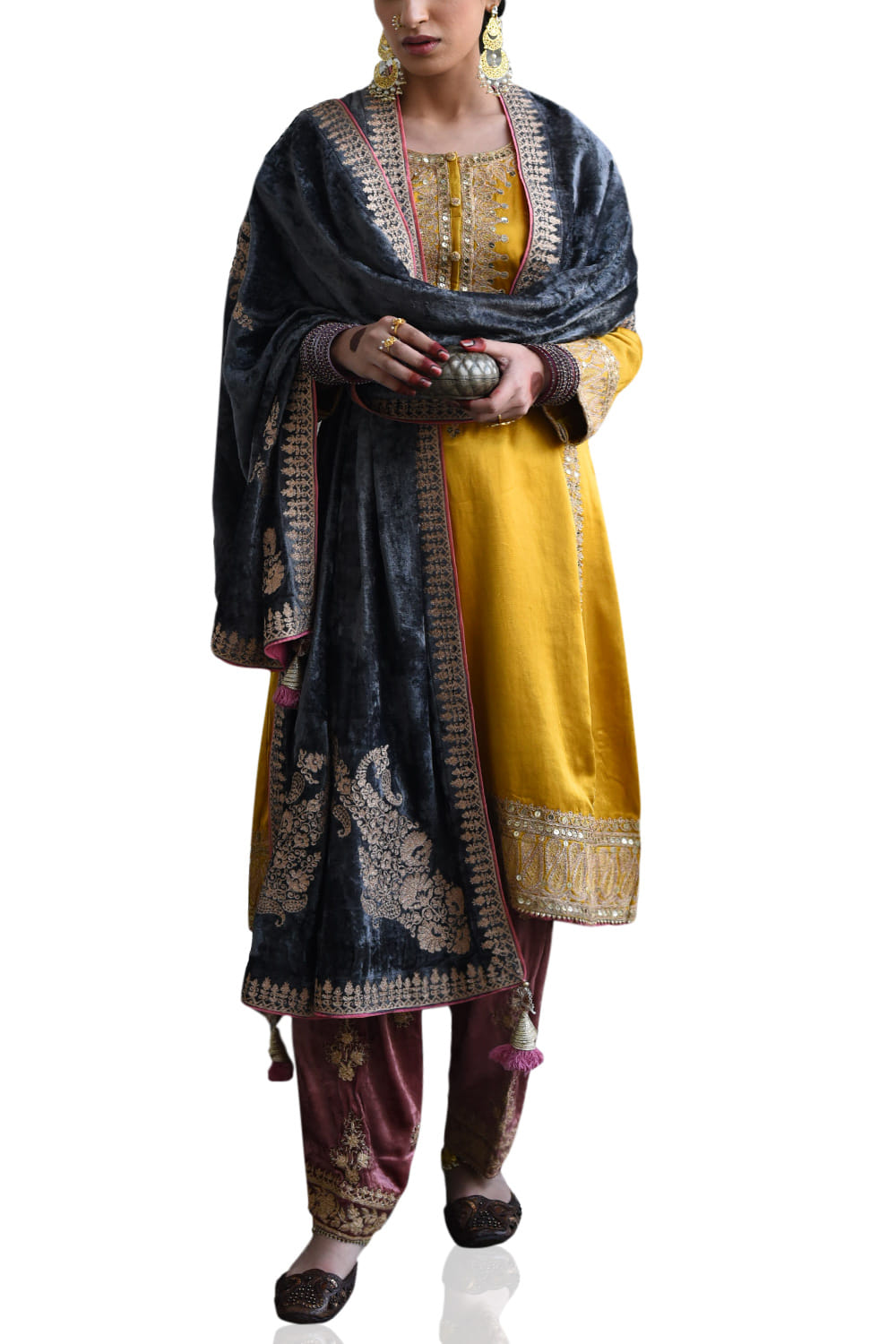 Heena Kochhar imbibes old world charm customizing this kurta salwar set in mashroo silk and velvet, enriched with zari embroidery. Style the look with a pair of chandbaalis.