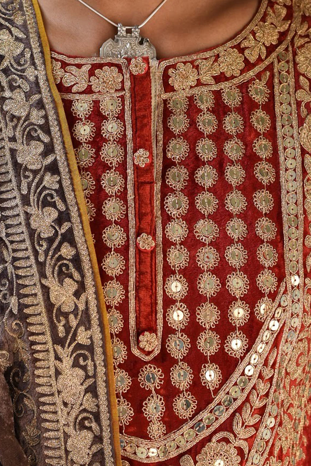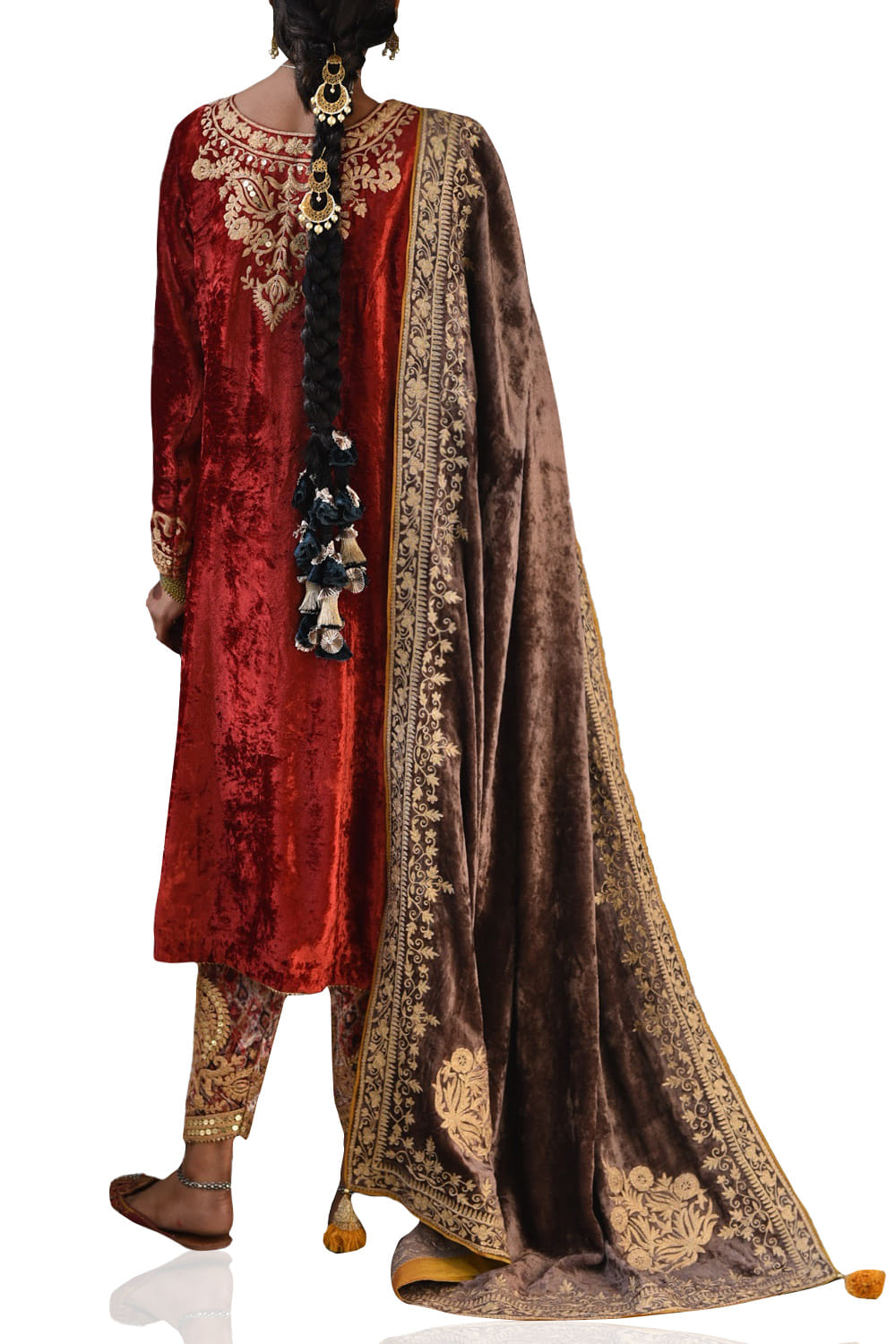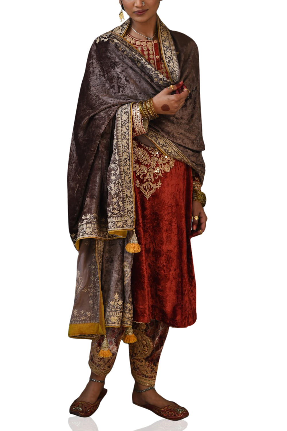 Heena Kochhar designs a quintessential traditional look kurta salwar set customized in velvet, featuring rich zari embroidery on the yoke and dupatta border. Style the look with a passa for a festive occasion.